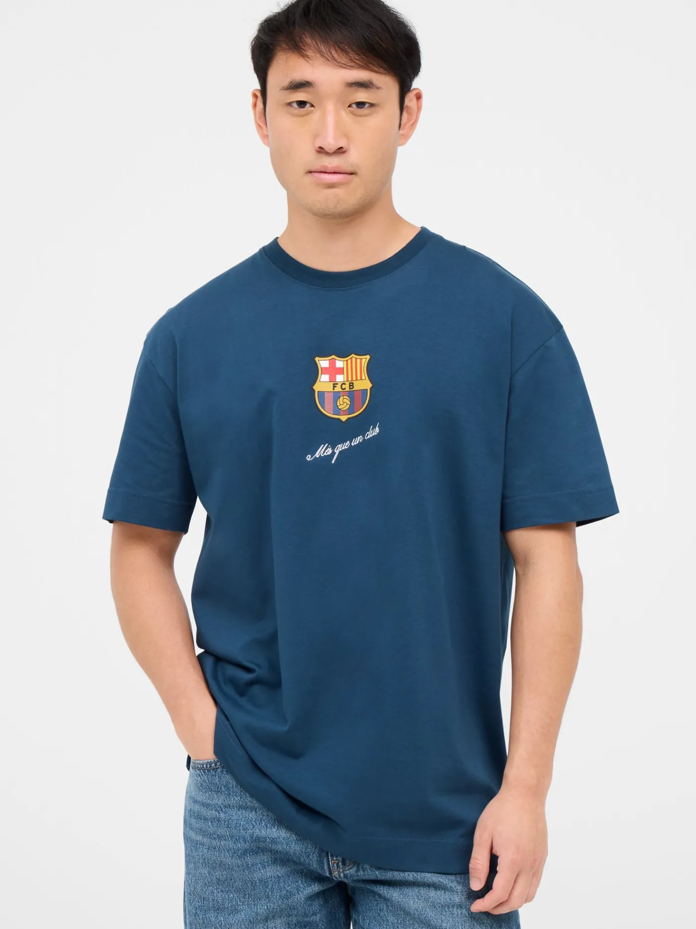 Camiseta azul marino con escudo estampado en el centro y texto Més que un club.