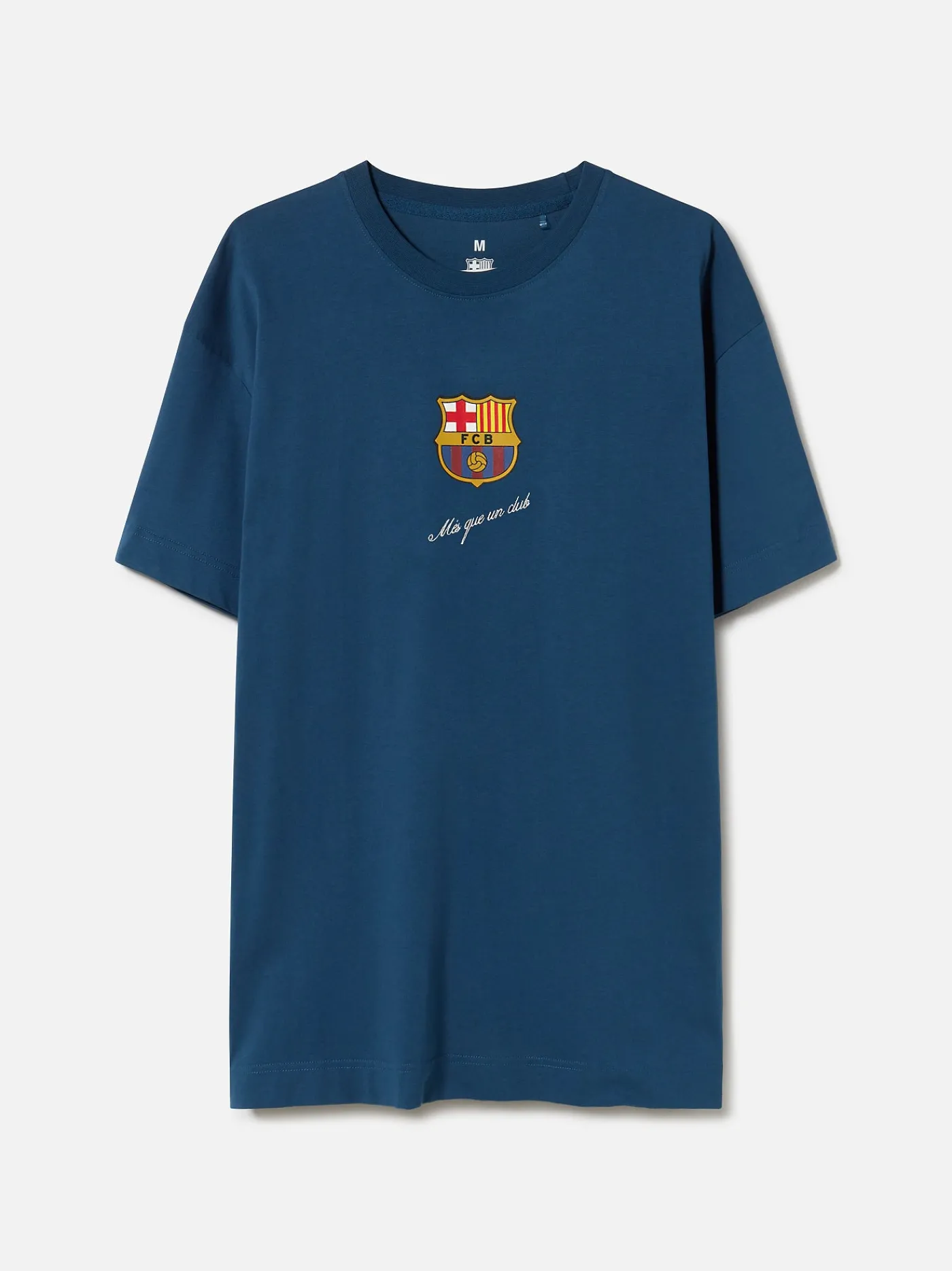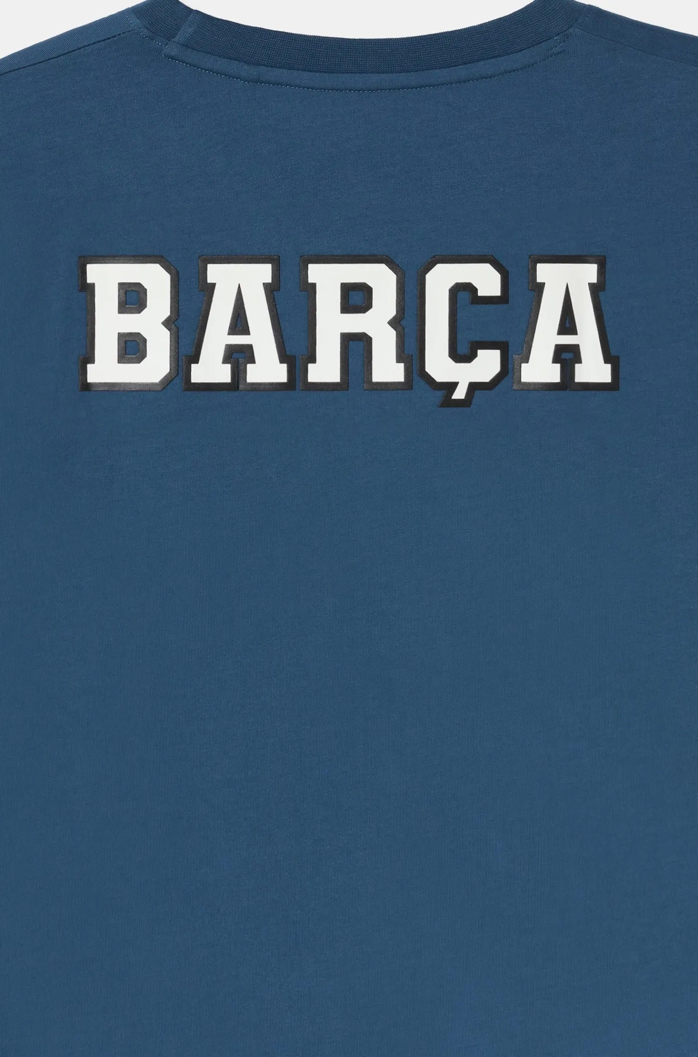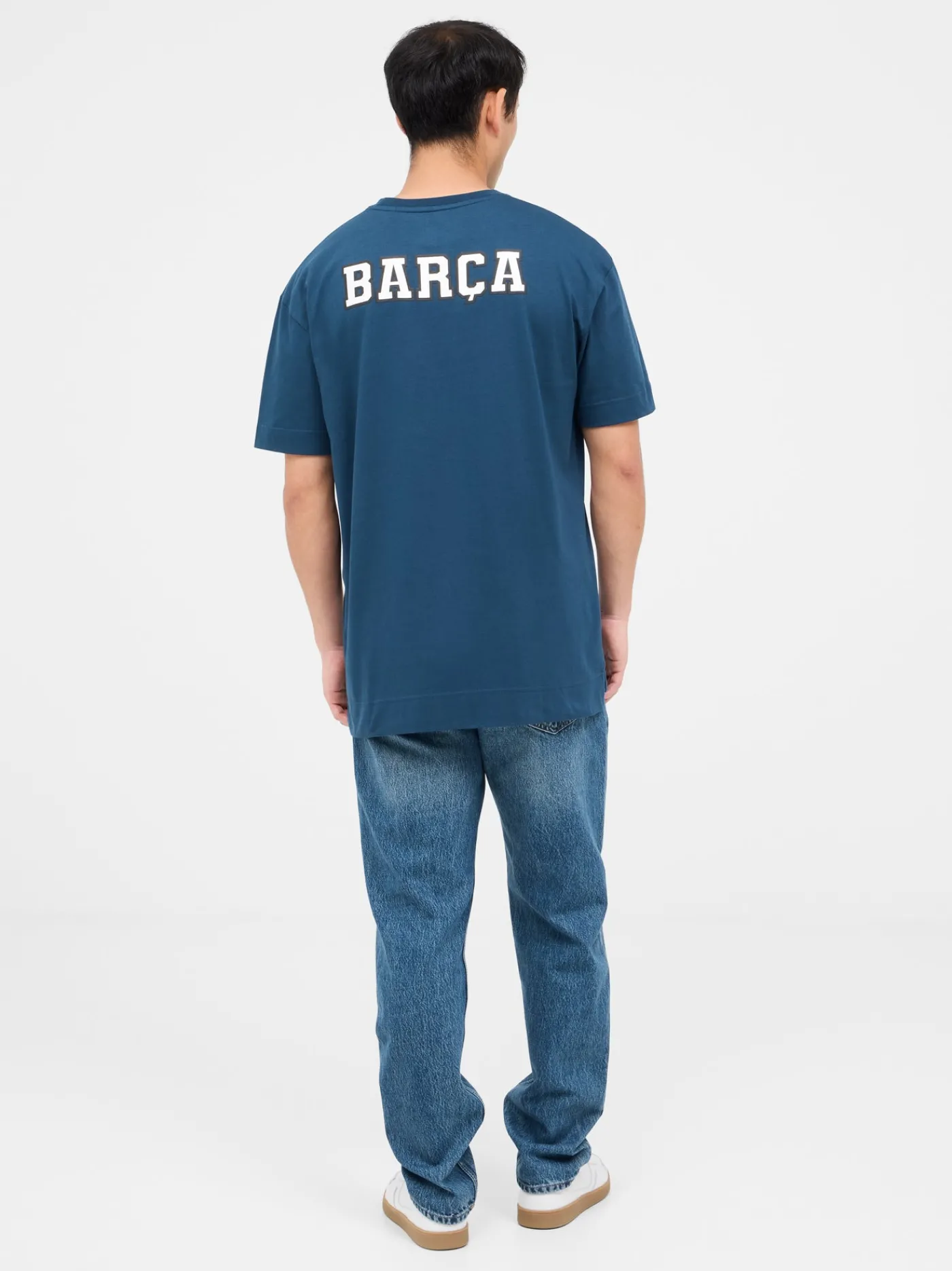 Camiseta azul marino con escudo estampado en el centro y texto Més que un club.Letras Barça estampadas en la espalda.C…