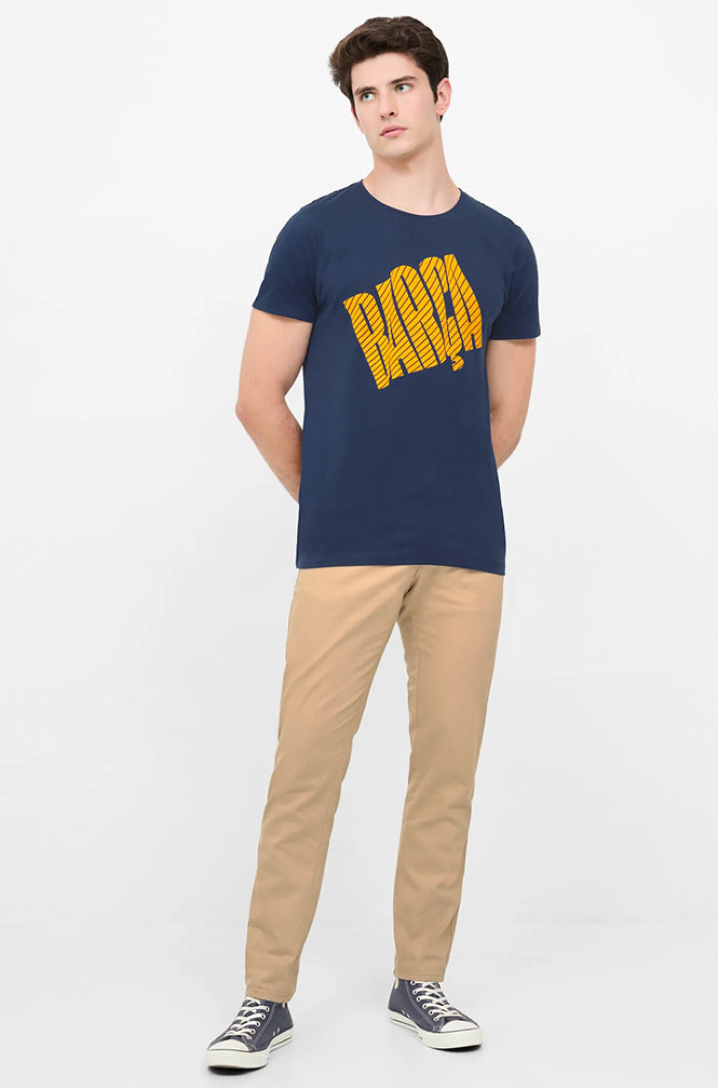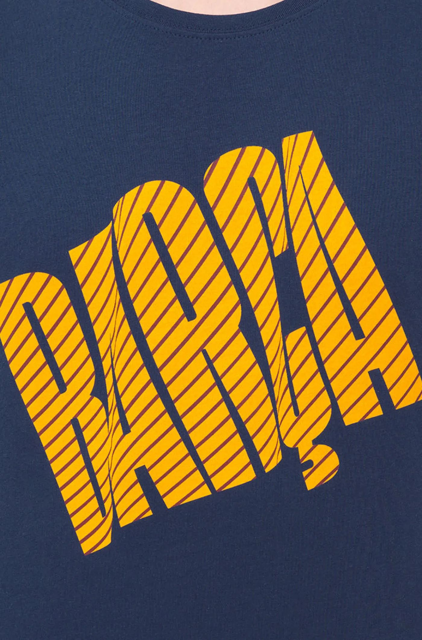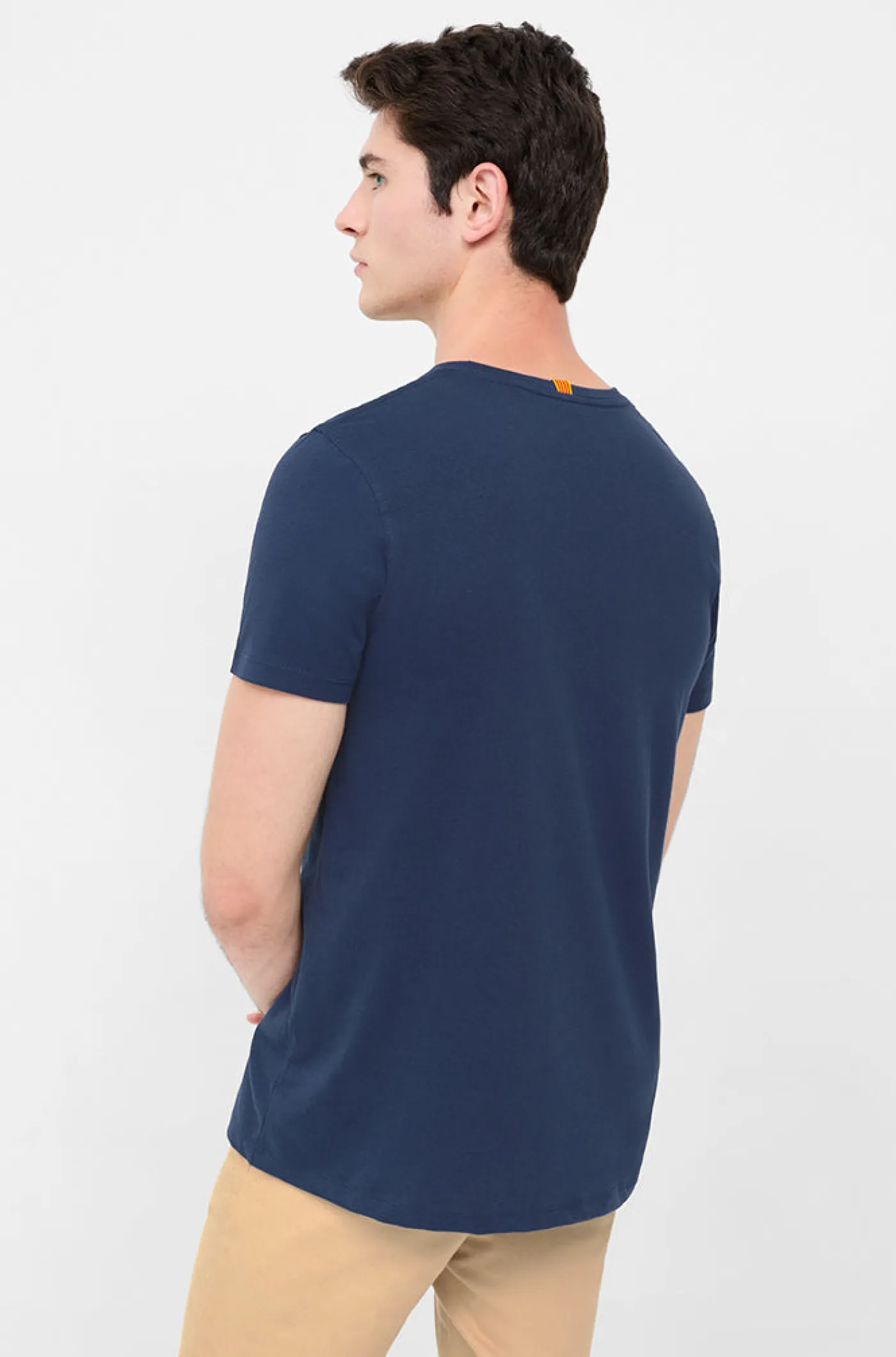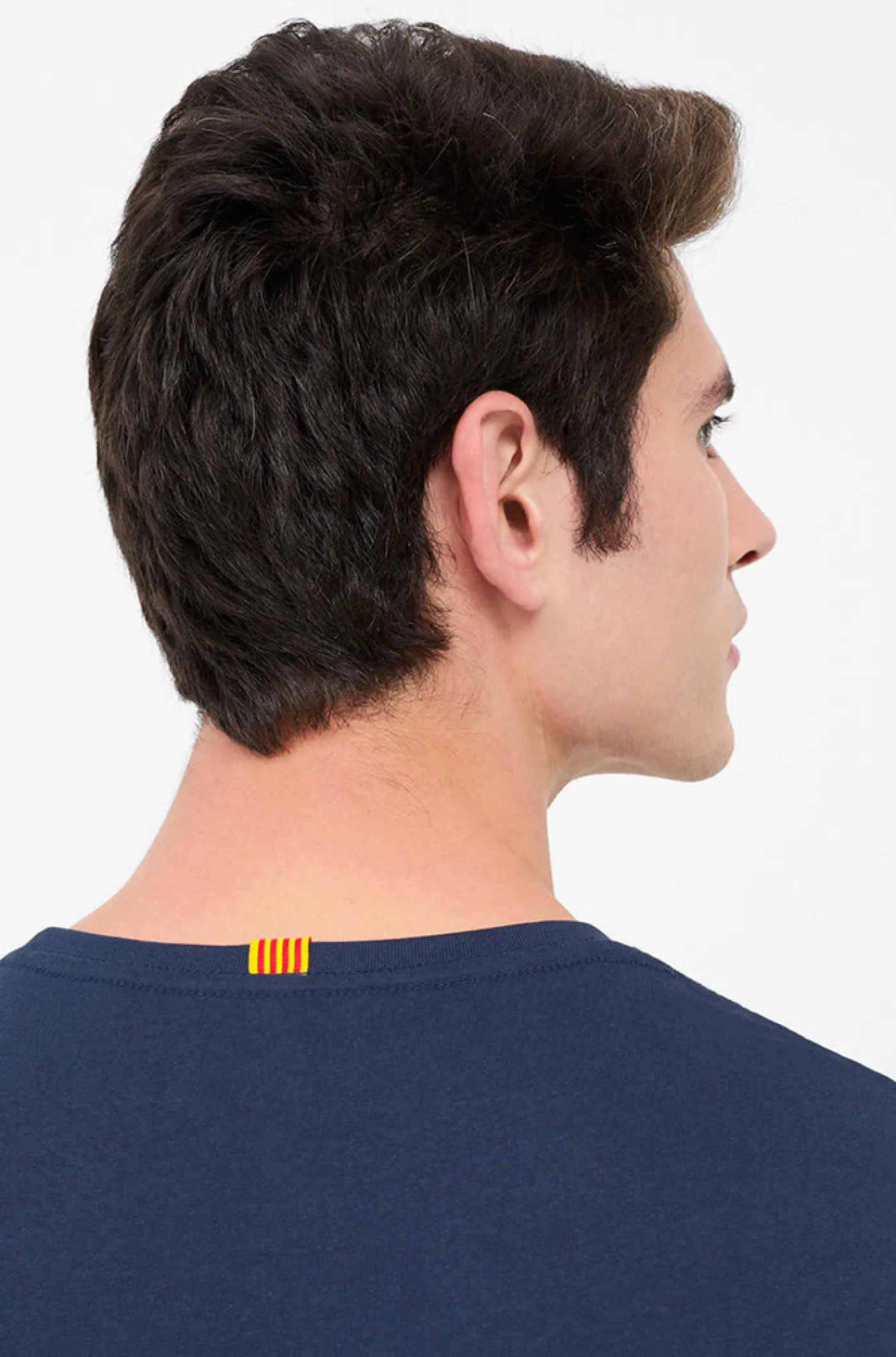 Camiseta con estampación del logo Barça. Detalle de la senyera en la parte posterior del cuello. Cuello redondo y manga corta. Color: Marino y amarillo