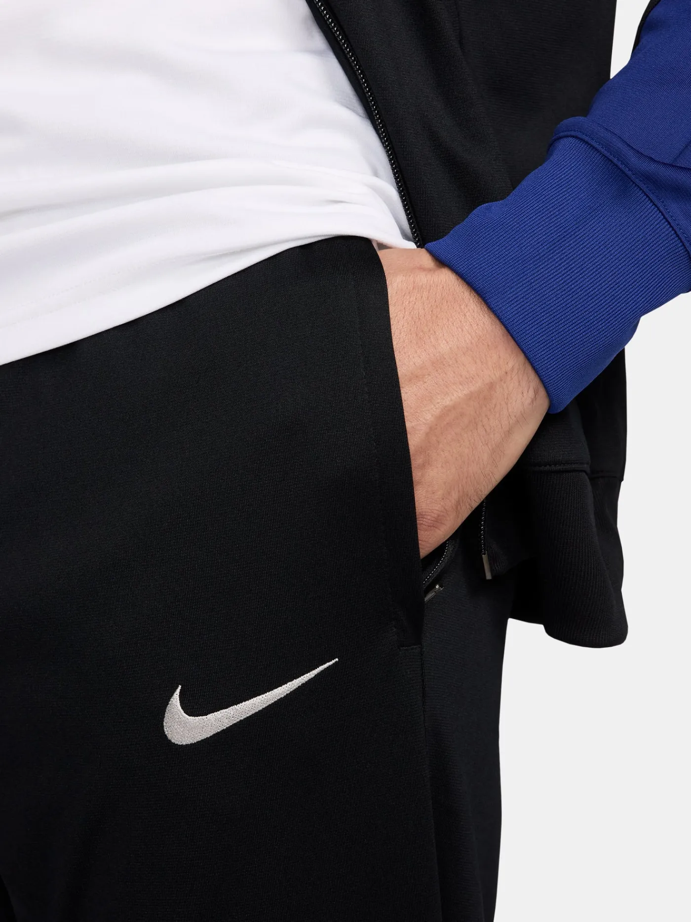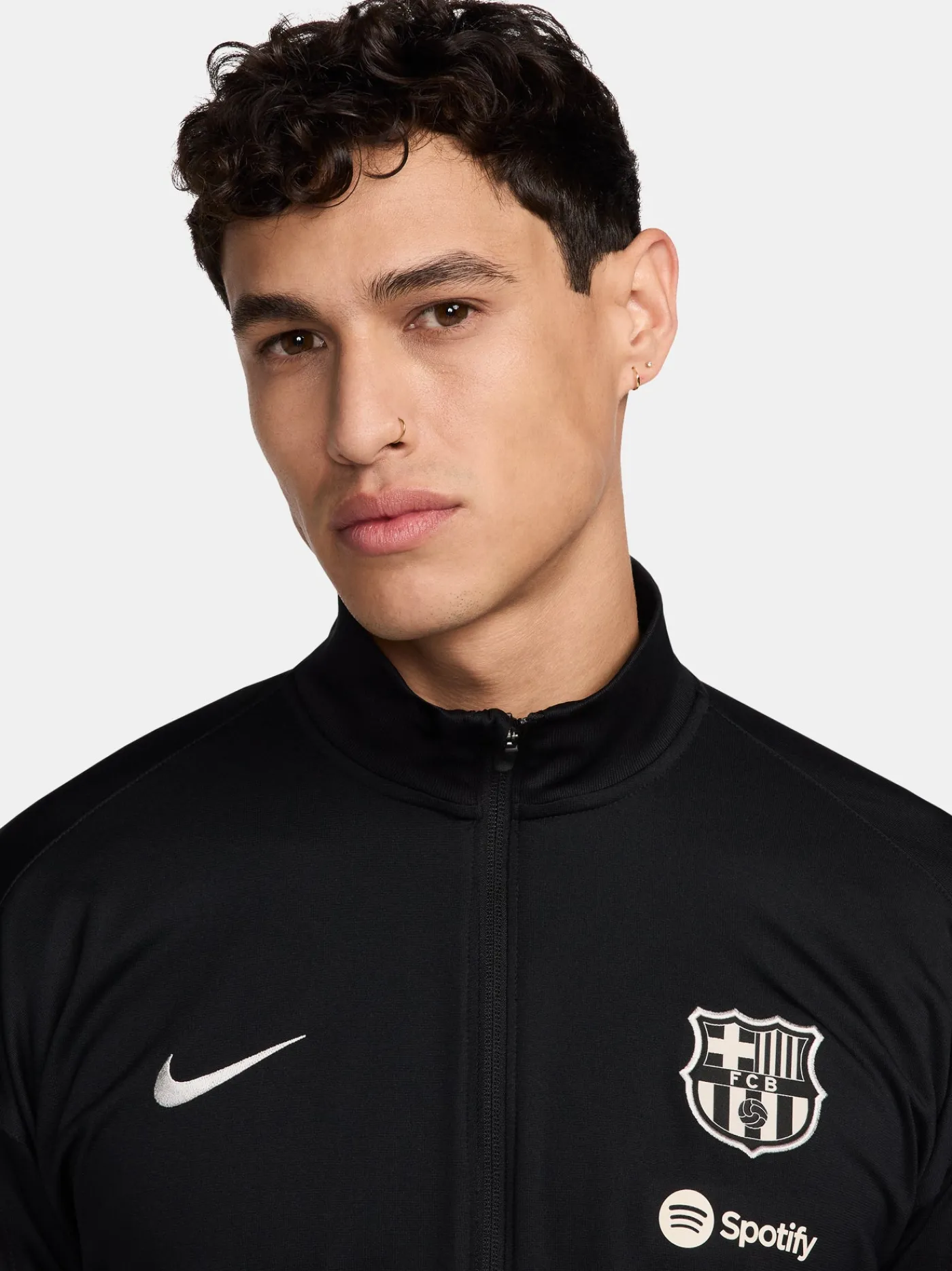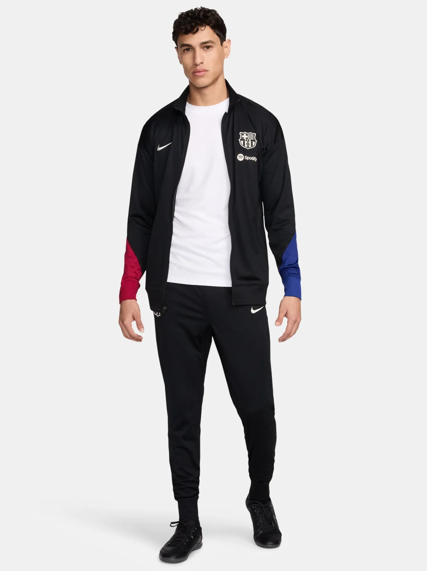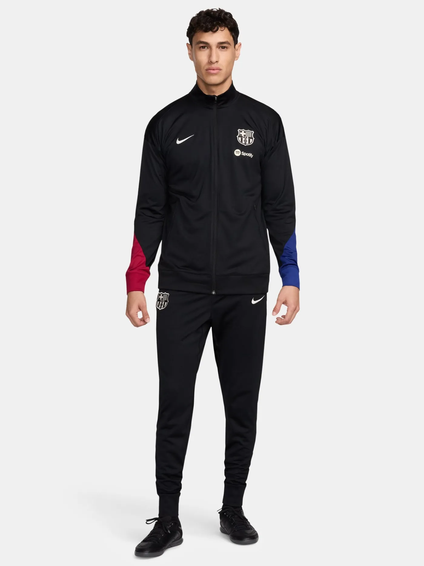 Chándal de entrenamiento con parche del escudo del FC Barcelona y logo de Nike bordado en contraste. Tecnología Nike Dri-FIT. Chaqueta con cuello alto. Cierre con cremallera. Bolsillos delanteros con cremalleras. Pantalón largo con cinturilla elástica con cordones en el interior. Bajos con cremallera. Color: negro y escarlata