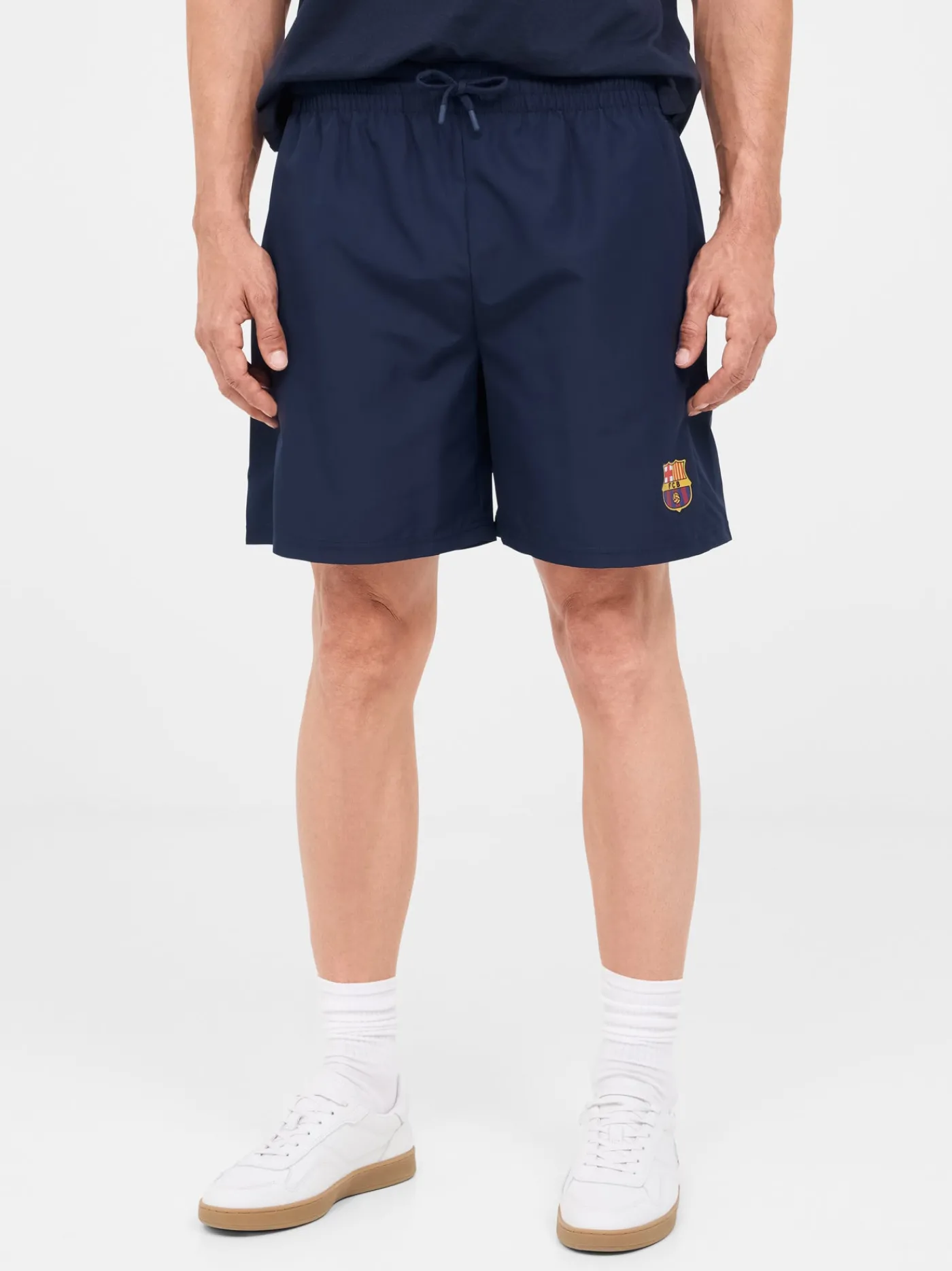 Pantalón corto con escudo estampado en el lado izquiero y ajuste con goma y cordón a la cintura. Detalle blaugrana en la parte trasera.