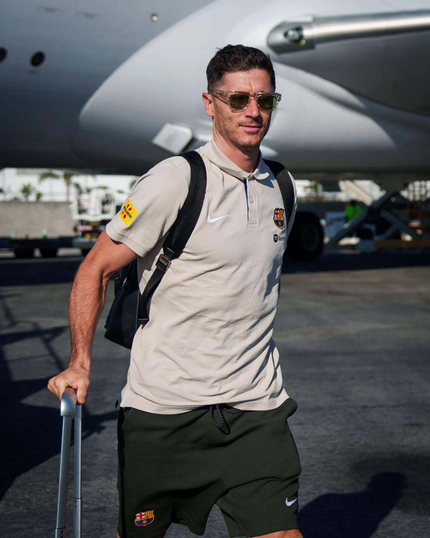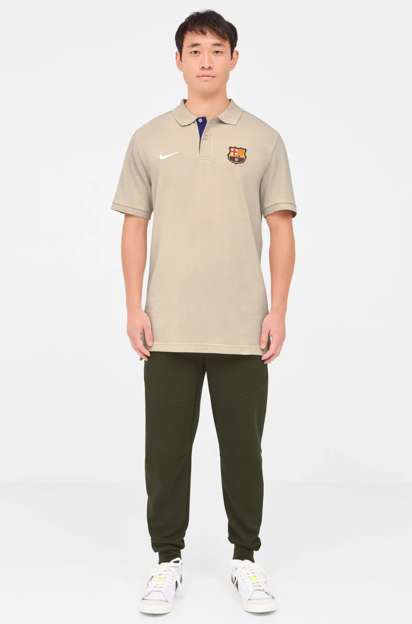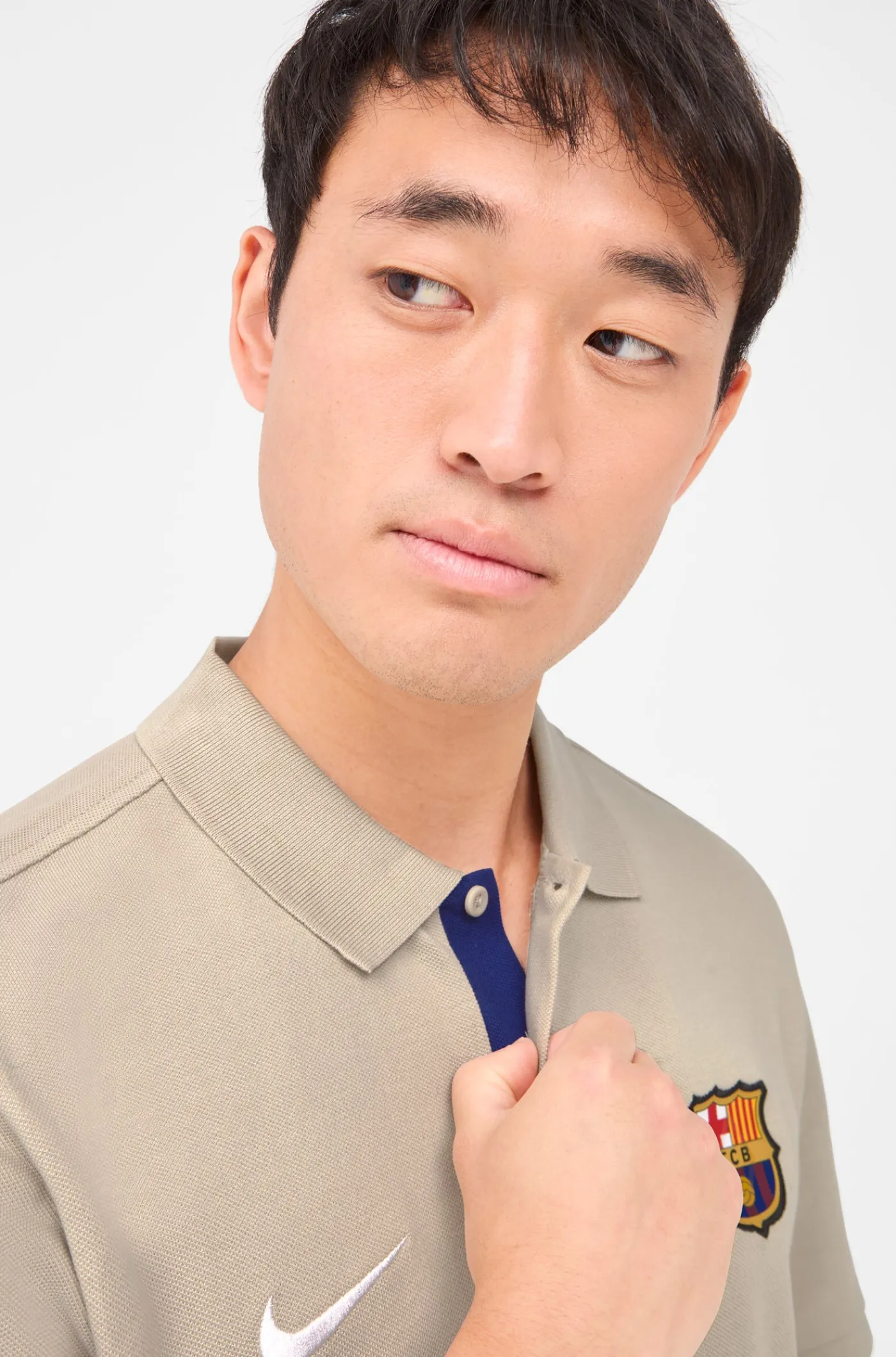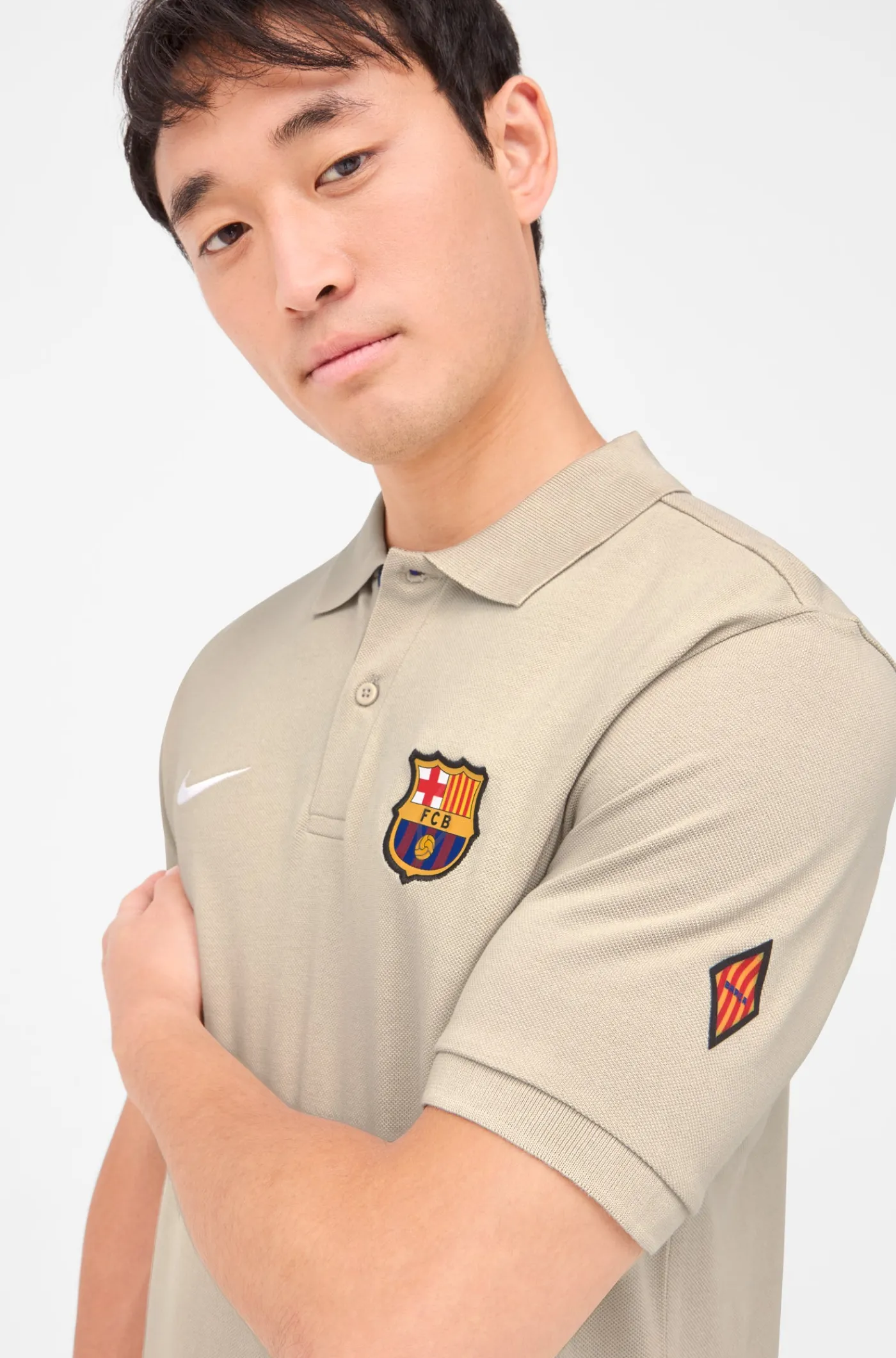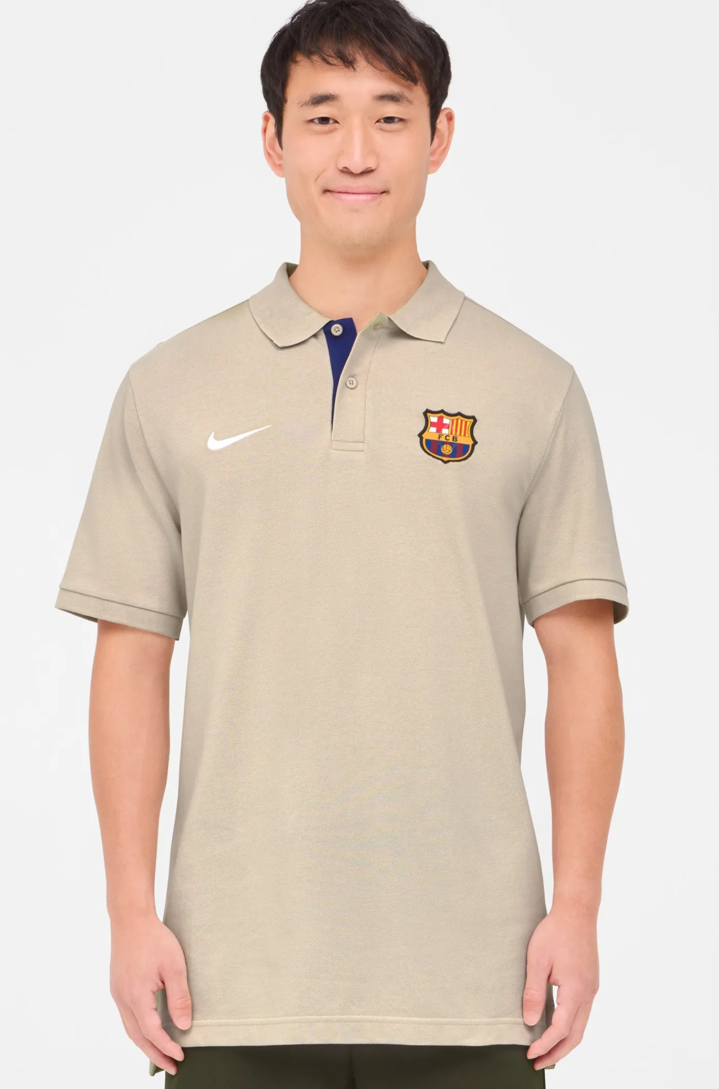 Polo de manga corta con escudo en relieve del FC Barcelona y el logo bordado de Nike. Corte asimétrico. Cuello con solapas. Cierre con 2 botones en el pecho. Aberturas en los laterales. Su tejido de algodón la convierte en una prenda cómoda y ligera. Color: beige.