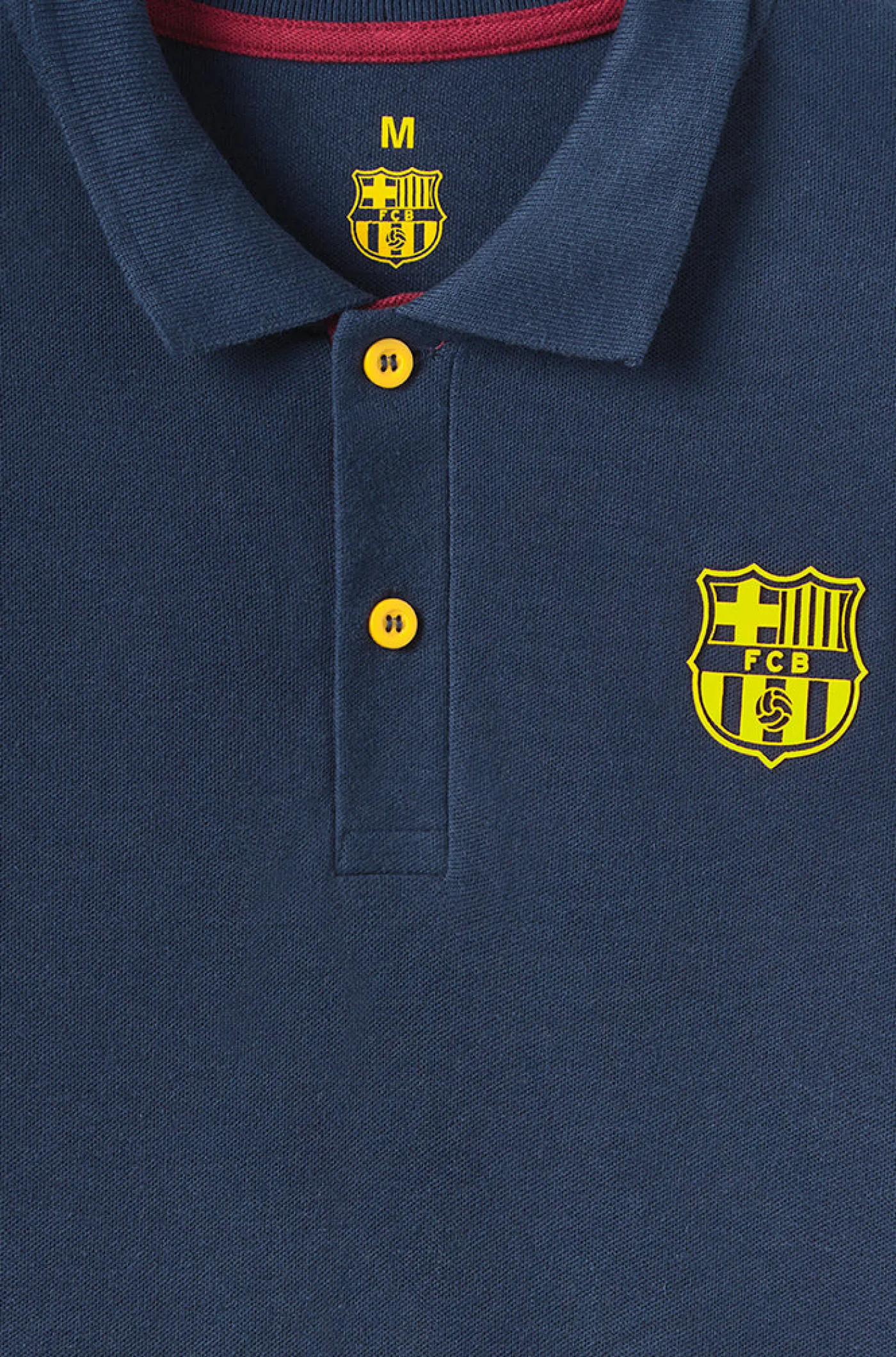 Polo de manga corta con escudo en relieve del FC Barcelona y senyera en la cintura. Detalle de mangas con la bandera azulgrana. Corte asimétrico. Cuello con solapas. Cierre con 2 botones. Aberturas en los laterales. Su tejido de algodón la hace una prenda cómoda y ligera. Color: Marino.