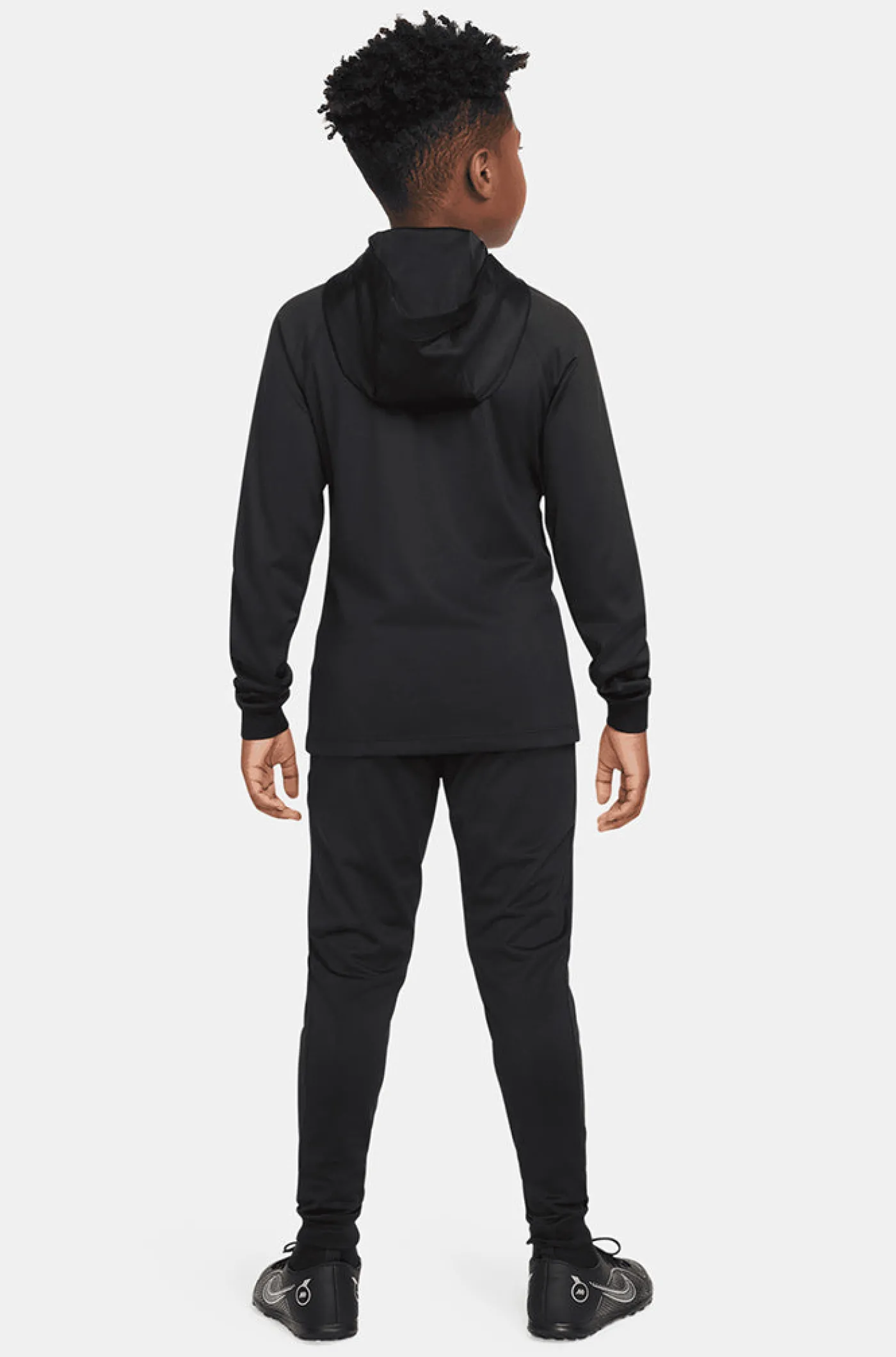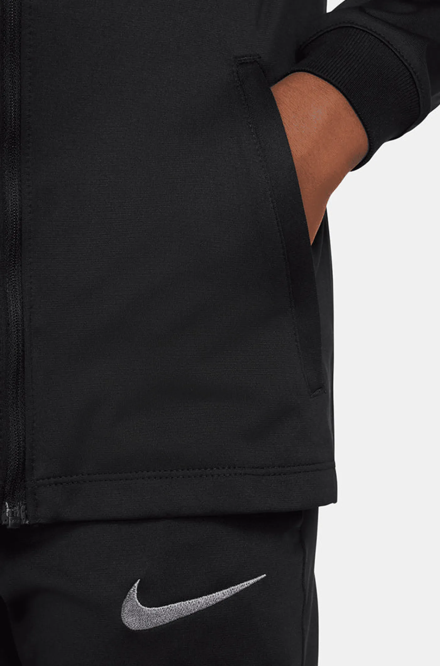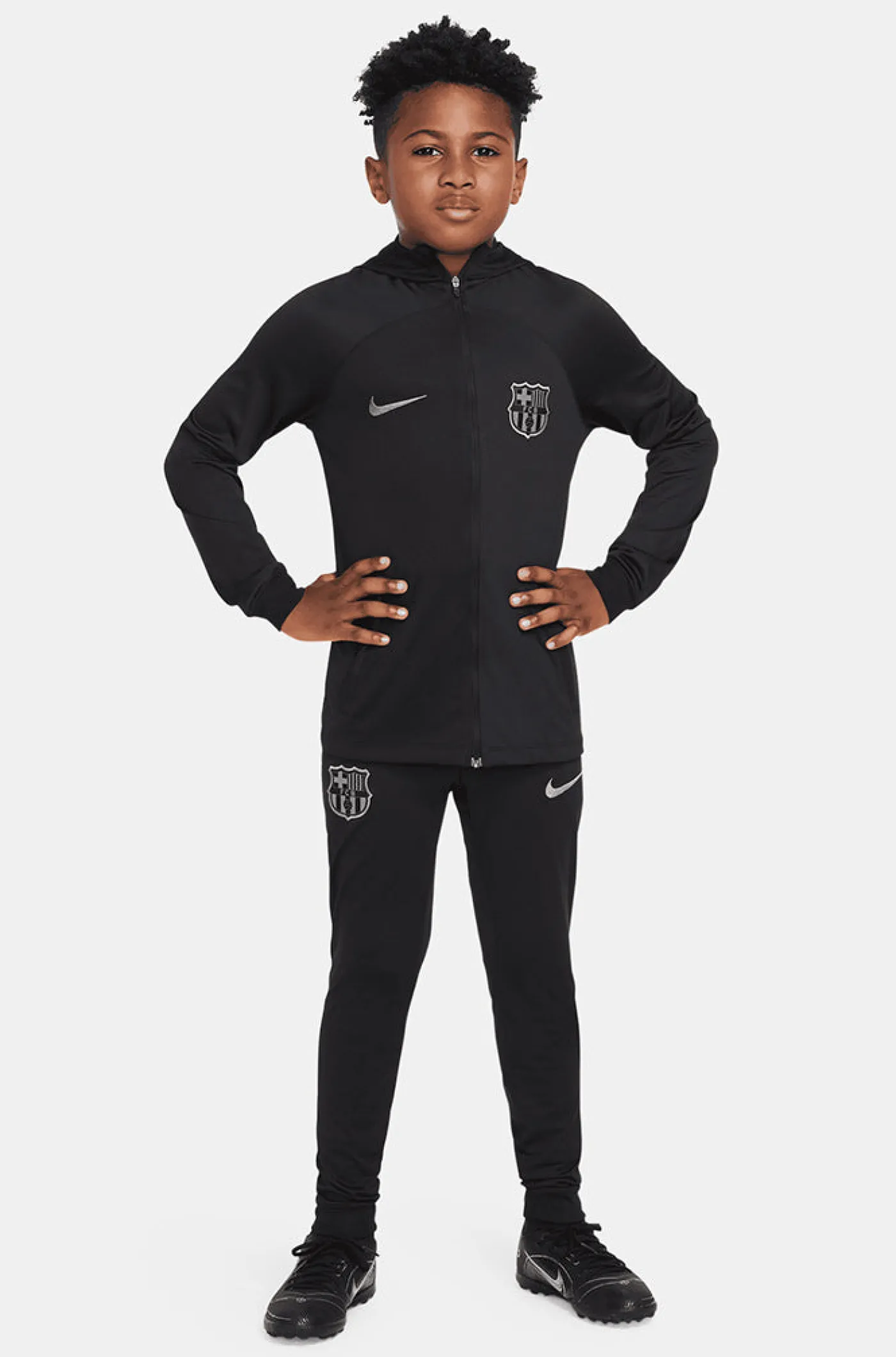 Chándal FC Barcelona de Nike para niños/as pequeños/as. Tecnología DRI-FIT de Nike. Chaqueta con cuello alto y manga larga. Cierre con cremallera. Puños elásticos. Cintura elástica y cordón. Color de la chaqueta: negro. Color del pantalón: negro.
