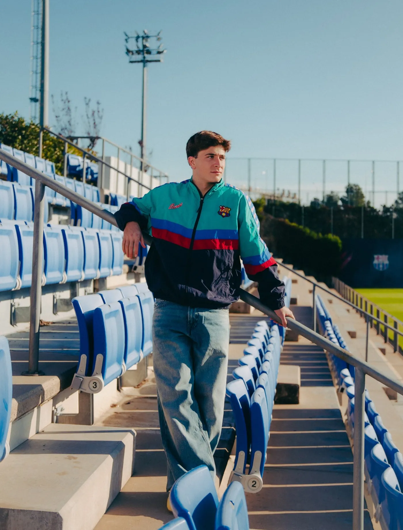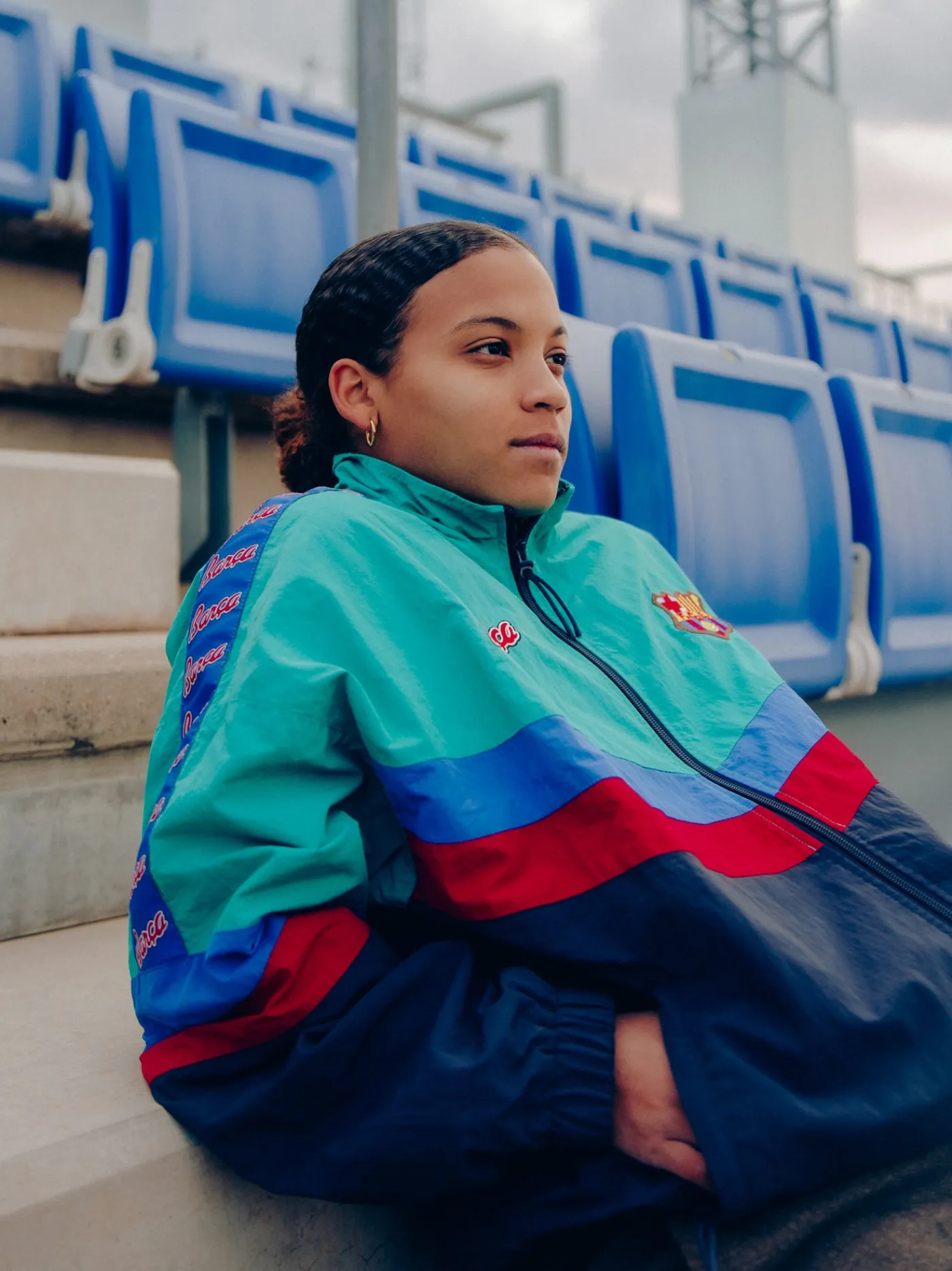Chaqueta vintage del FC Barcelona con escudo del FC Barcelona bordado. Cuello largo. Manga larga. Cintura y puños elásticos. Bolsillos delanteros: 2. Color: Azul marino, azul eléctrico, rojo y turquesa.