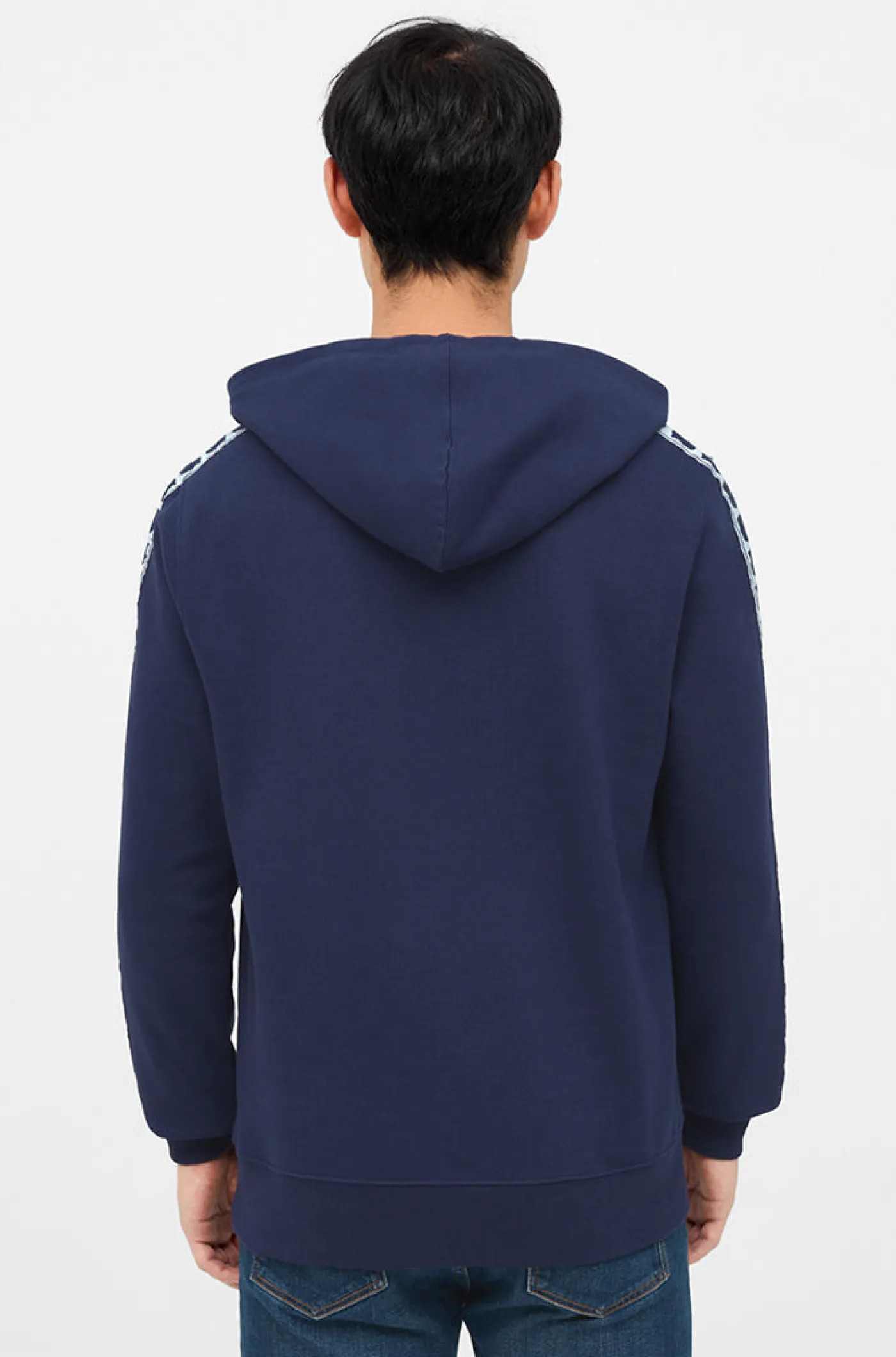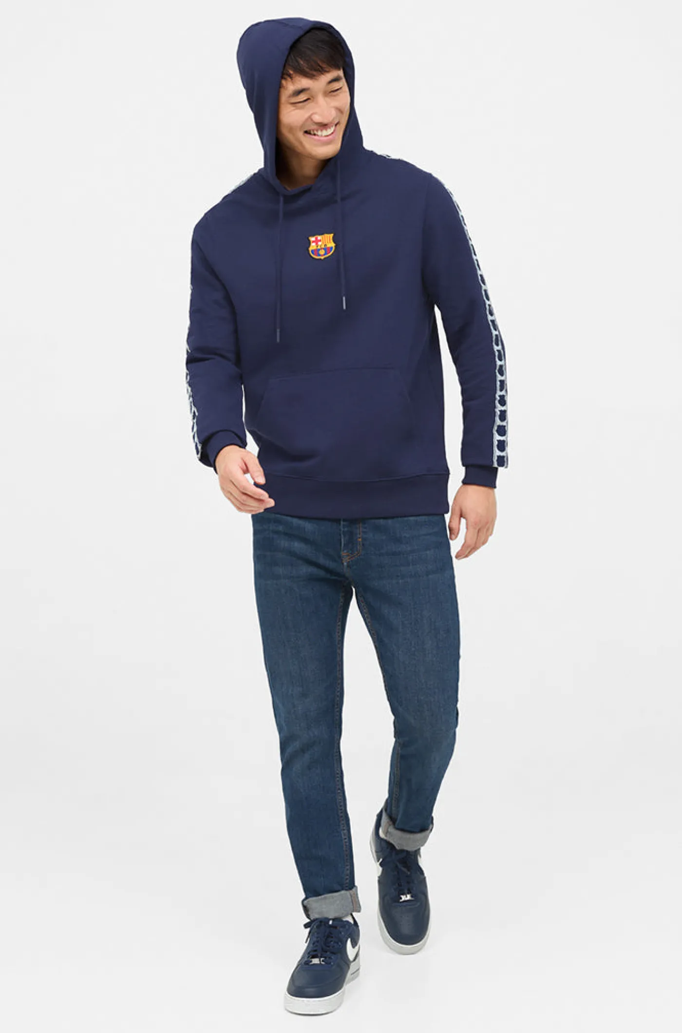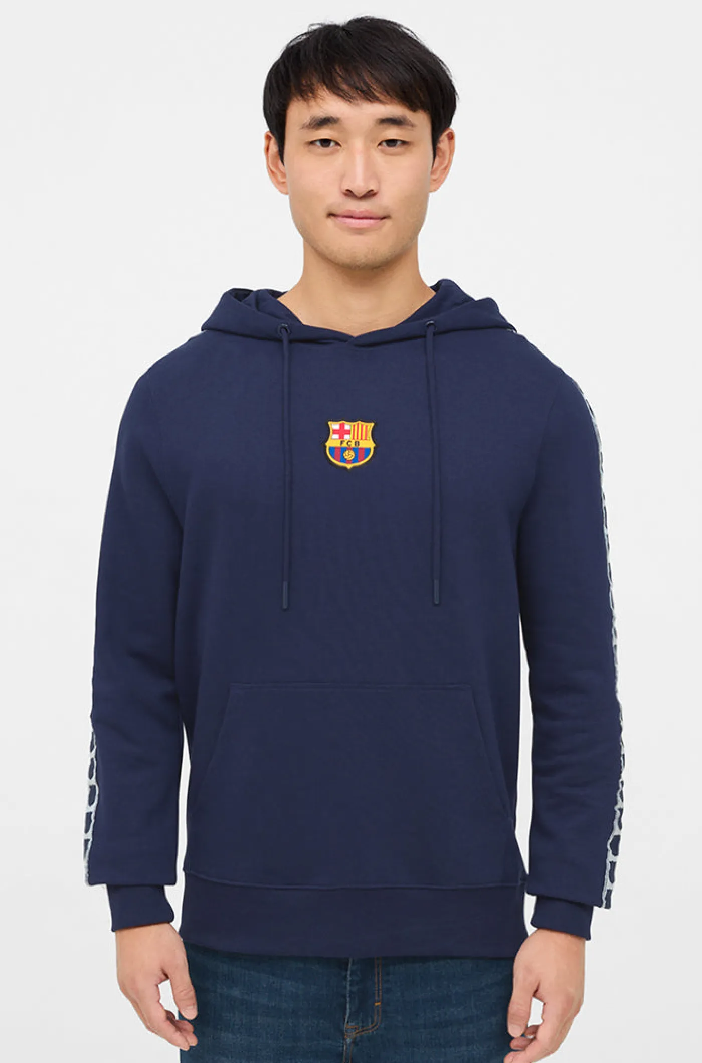Sudadera con capucha y con el parche del escudo del FC Barcelona centrado en el pecho. Interior de felpa ligera. Cuello alto con cordones ajustables. Manga larga con bandas decoradas con las figuras del escudo del FC Barcelona. Cintura y puños elásticos. Bolsillo canguro. Color: Marino.