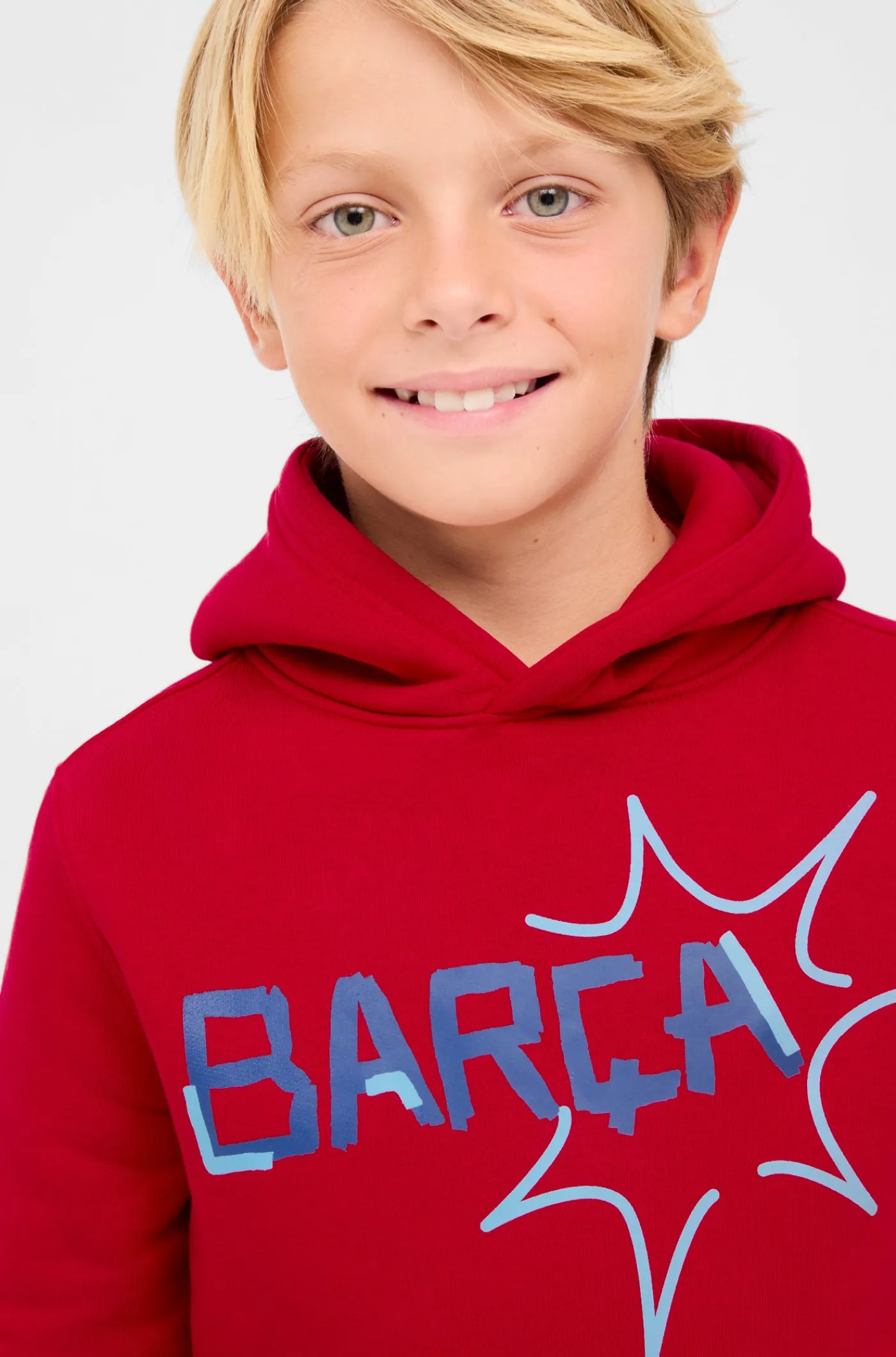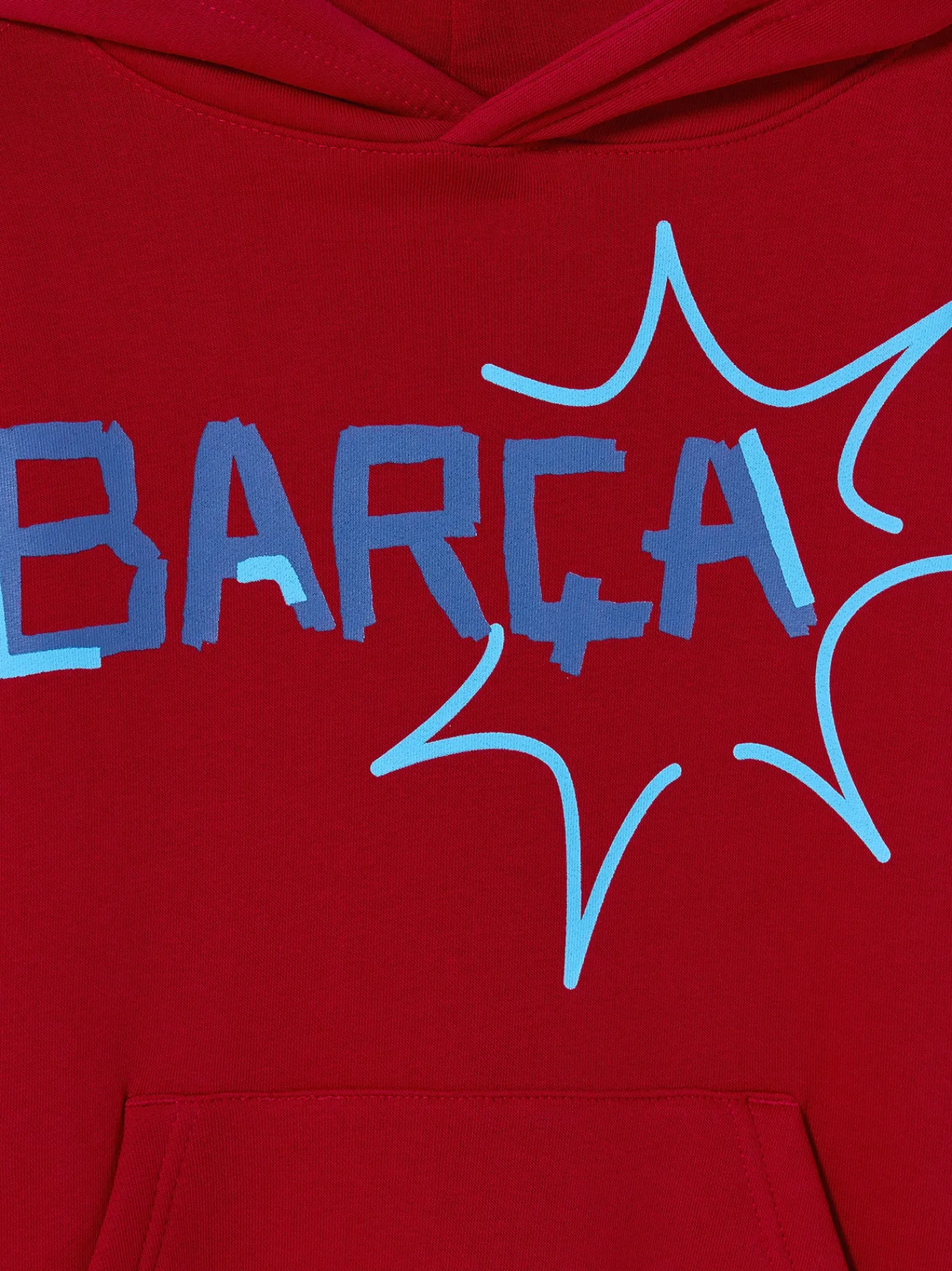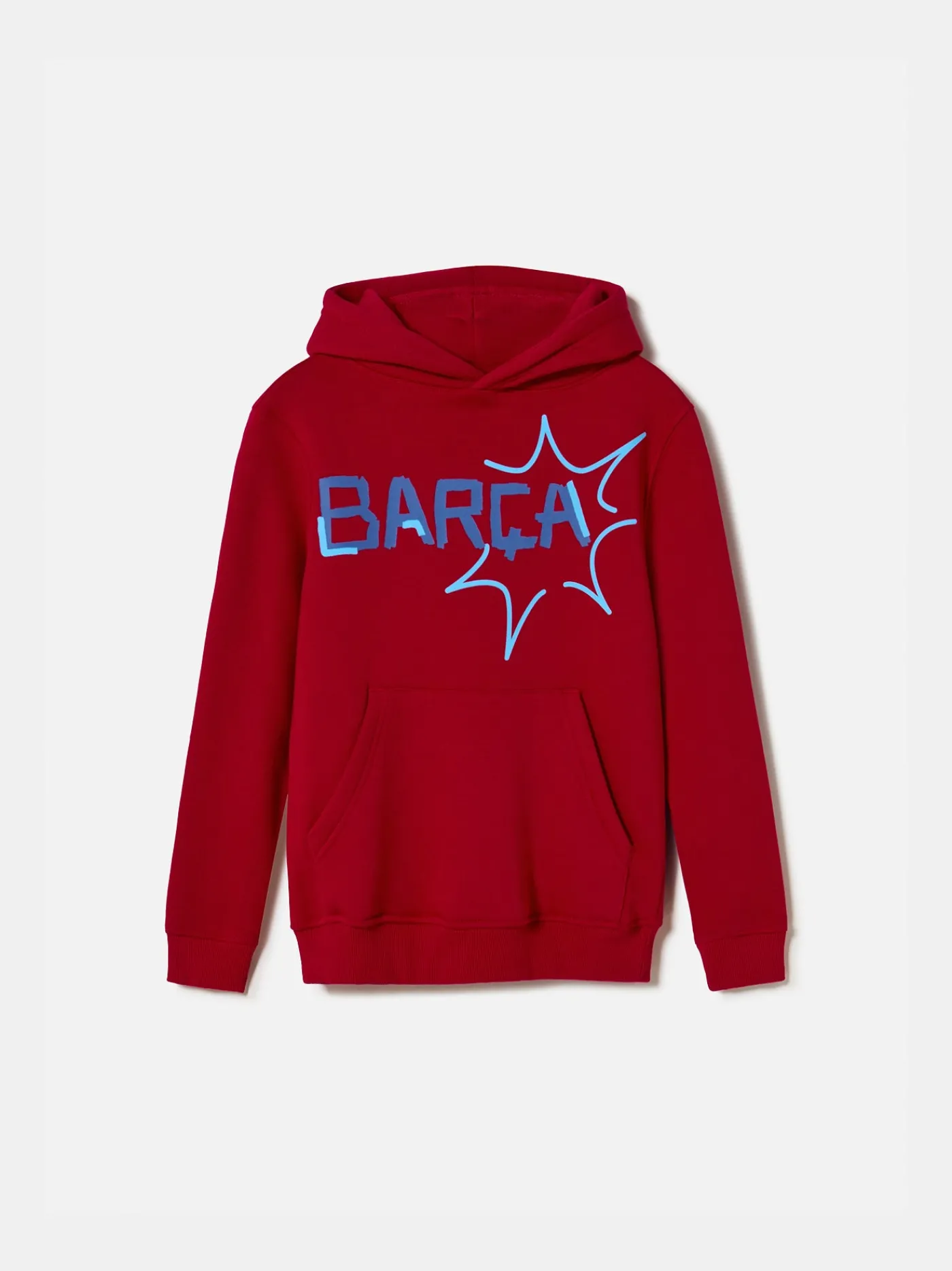 Sudadera con capucha con el escudo del FC Barcelona y la rotulación de “MÉS QUE UN CLUB” en relieve en la parte delantera. Interior de felpa ligera. Cuello alto. Manga larga. Cintura y puños elásticos. Color: rojo.
