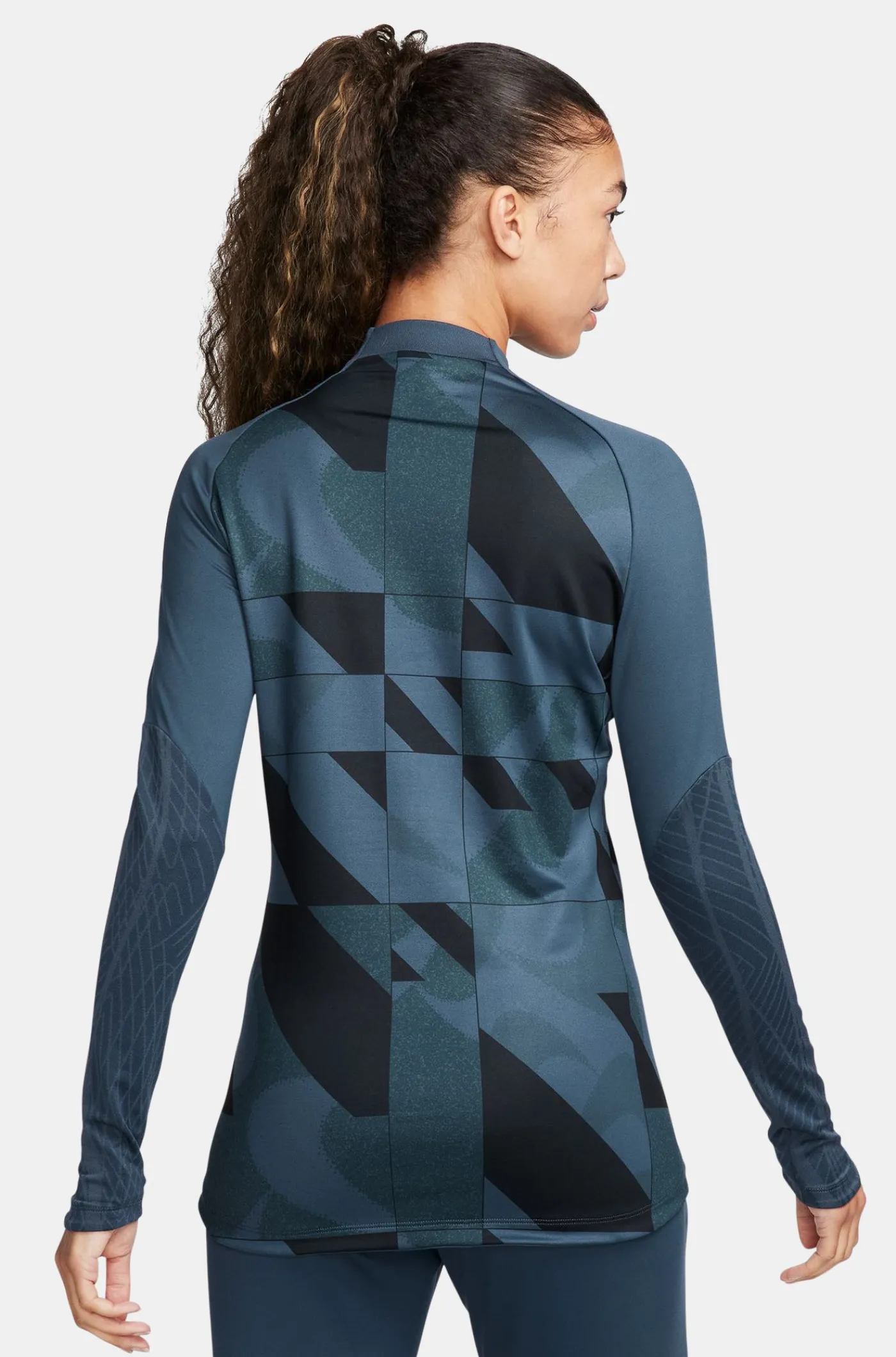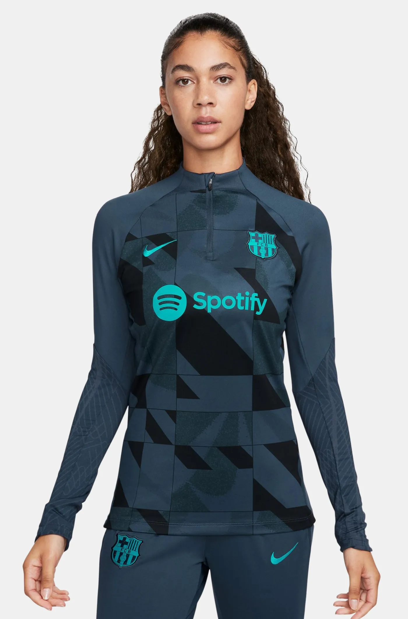 Sudadera pre-partido del FC Barcelona 23/24 para mujer que utilizan los jugadores del 1er equipo para realizar el calentamiento previo a saltar al terreno de juego en los partidos de la Uefa Champions League. Camiseta con el parche del FC Barcelona y el logo de Nike bordado. Cuello redondo. Manga larga. Tecnología Dri-FIT de Nike. Color: gris y negro.