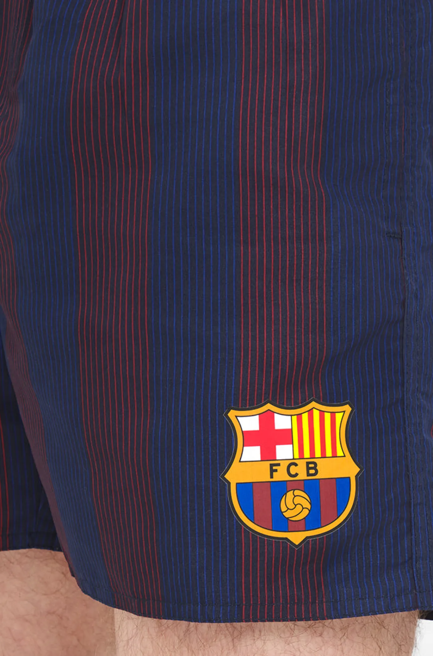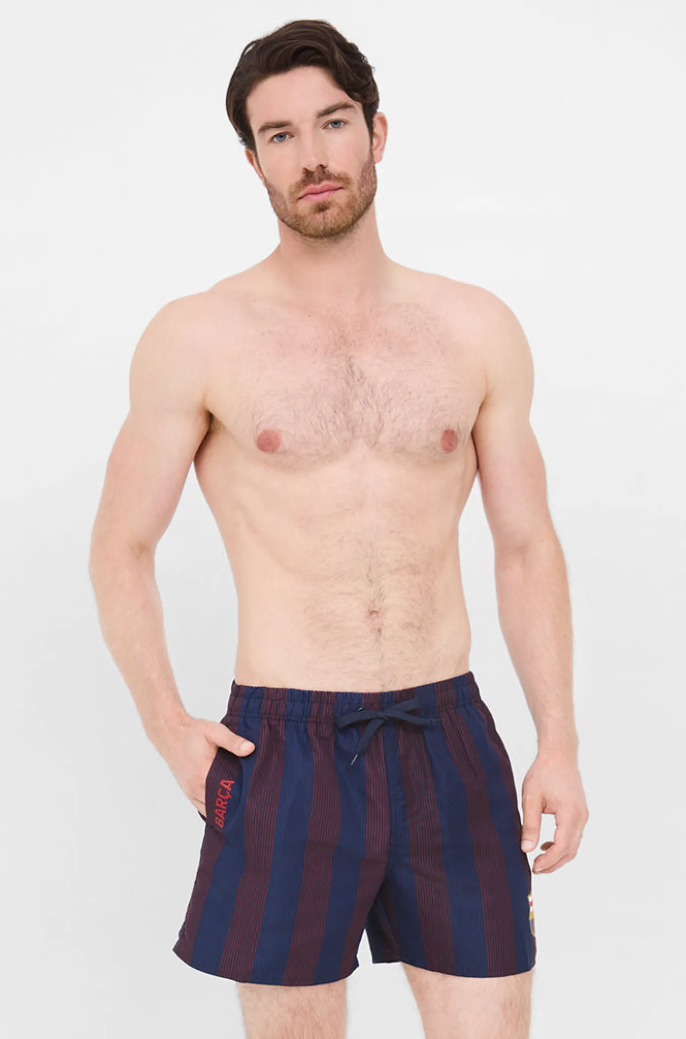 Bañador con el escudo del FC Barcelona y detalle de líneas diagonales a contraste. Cintura elástica con cordones para mayor sujeción. Bolsillos delanteros: 2. Forro de rejilla fina. Color: Azulgrana