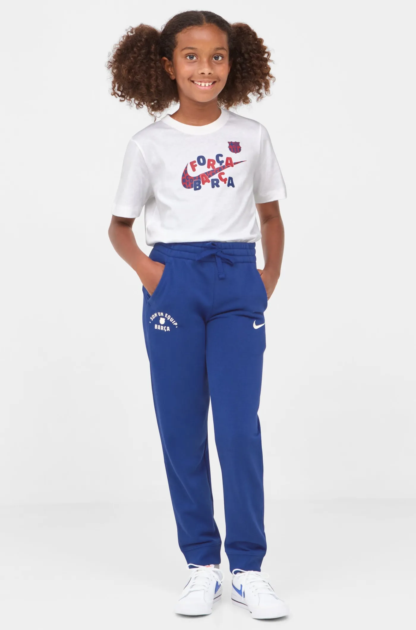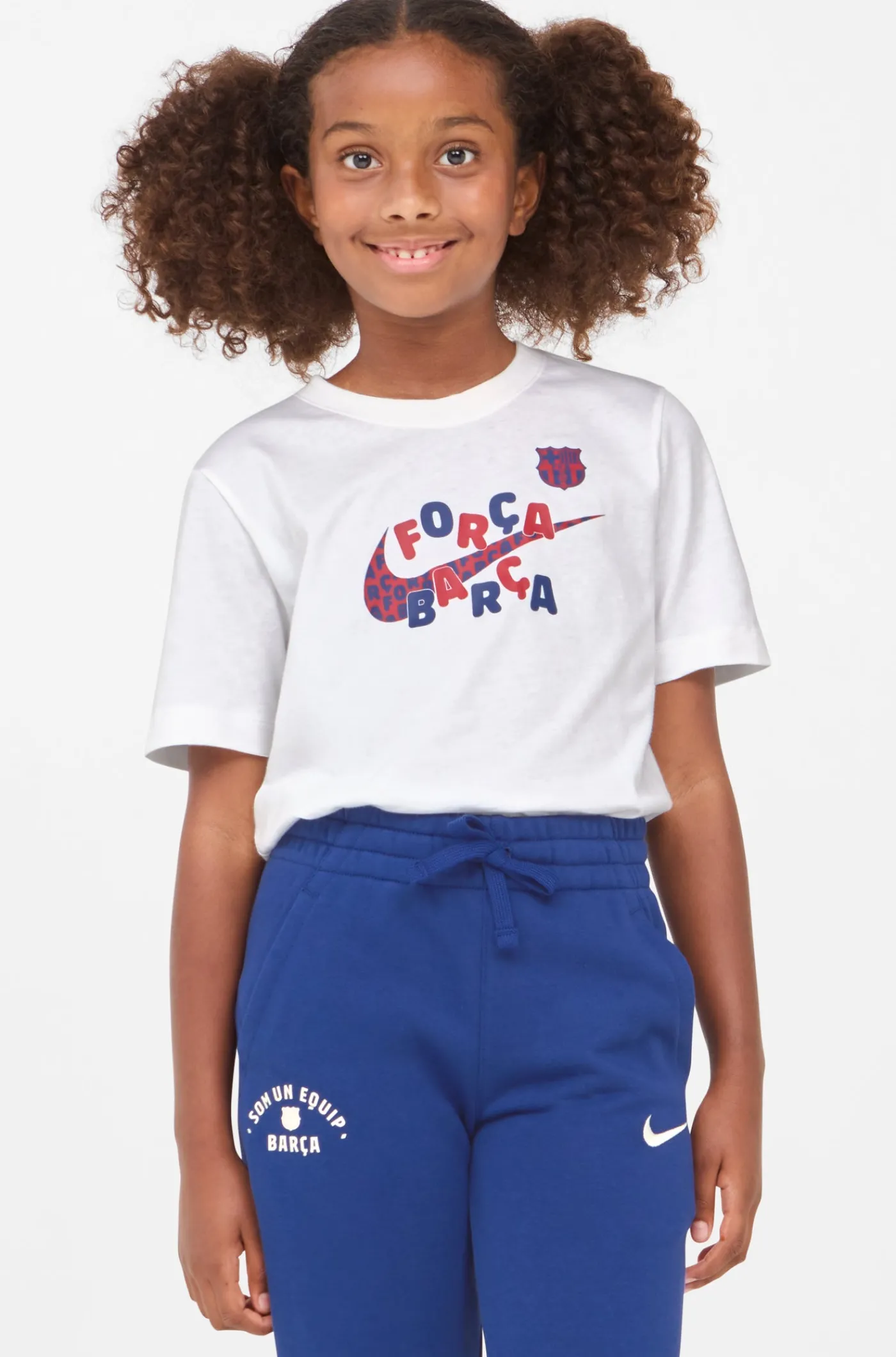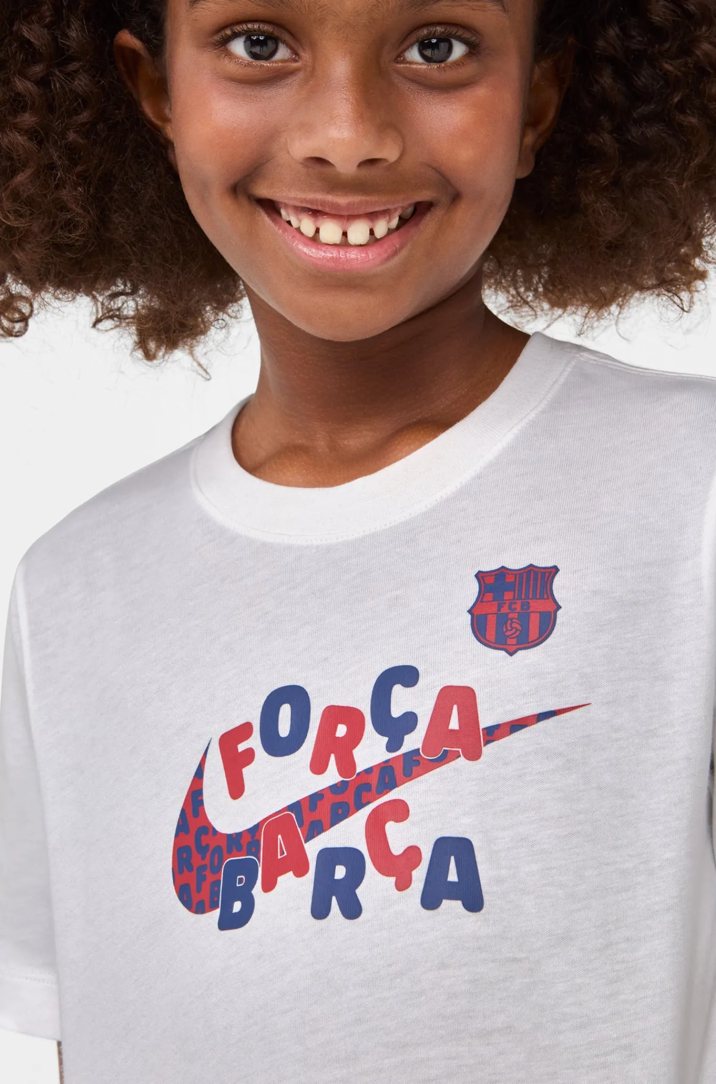 Camiseta de manga corta para niños/as de 6 a 14 años con el escudo del FC Barcelona y el logo de Nike. Cuello redondo. Color: blanco.