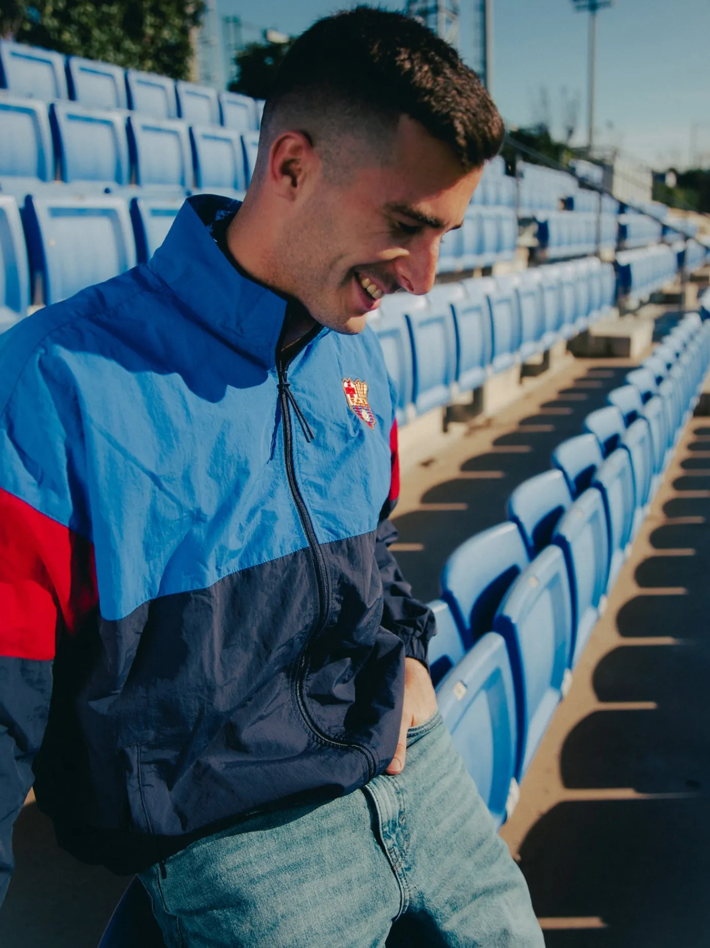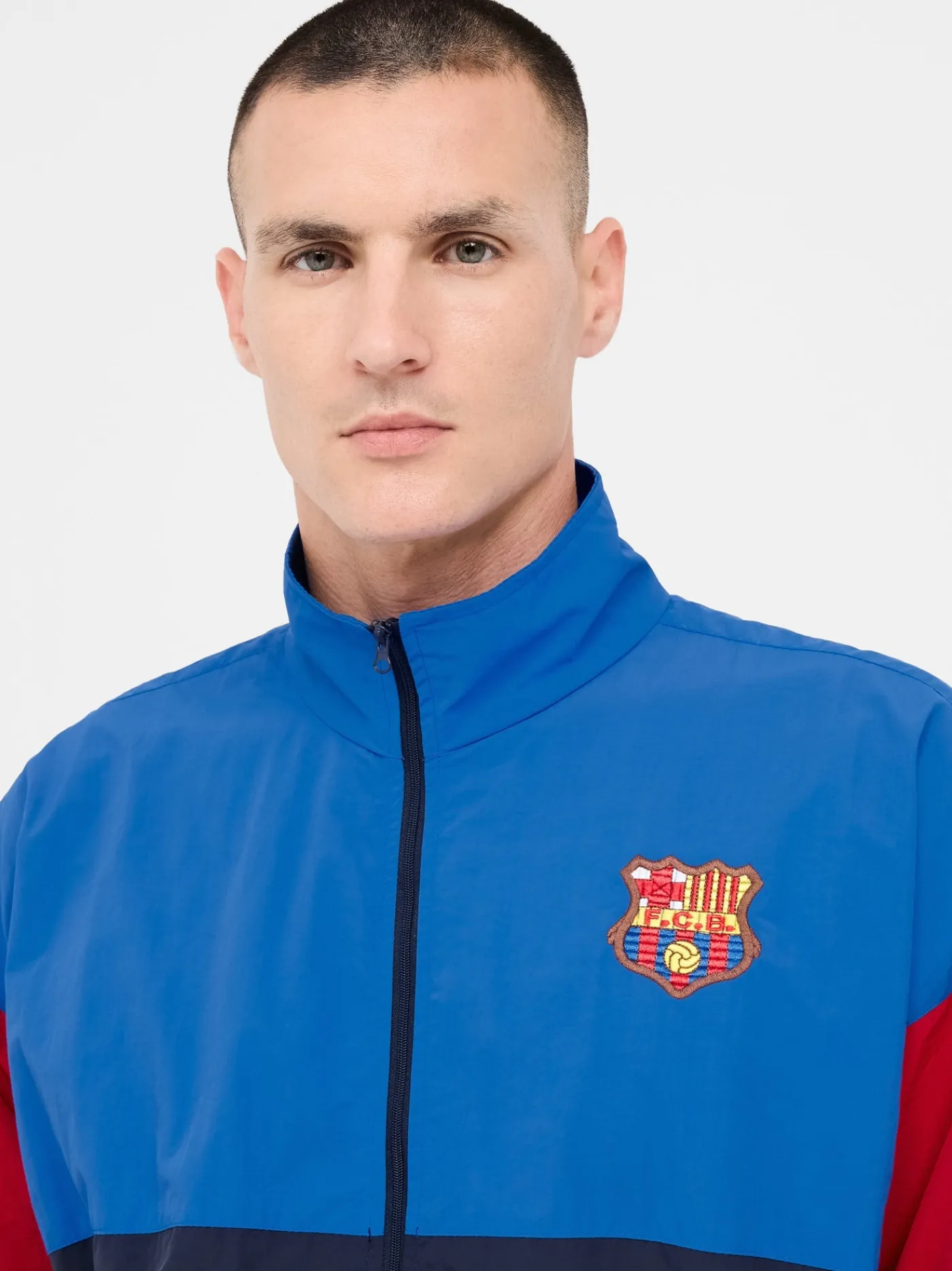 Chaqueta vintage del FC Barcelona con escudo del FC Barcelona bordado. Cuello alto. Manga larga. Cintura y puños elásticos. Bolsillos delanteros: 2. Color: Azul marino, azul eléctrico y granate.