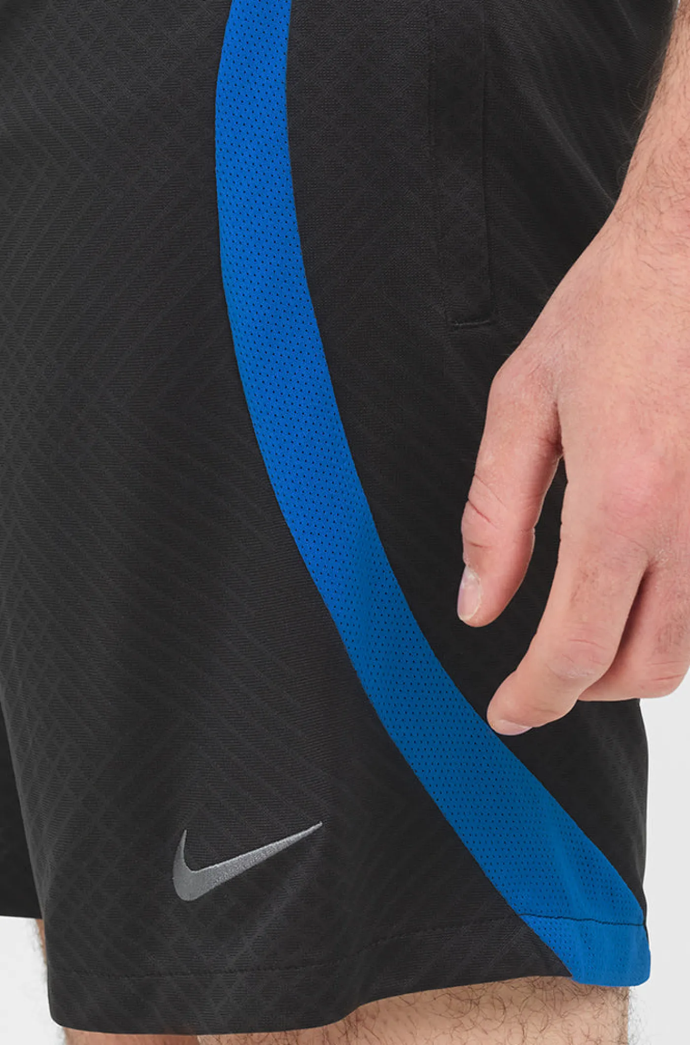 Pantalón corto de entrenamiento con parche del escudo del FC Barcelona y el logo de Nike en la parte inferior. Ambas piernas están decoradas con una franja en diagonal. Cintura elástica con cordón. Dos bolsillos laterales con cremallera. El tejido Nike Breathe mantiene la transpirabilidad y la frescura. Tecnología Dri-FIT de Nike. Color: negro y azul.