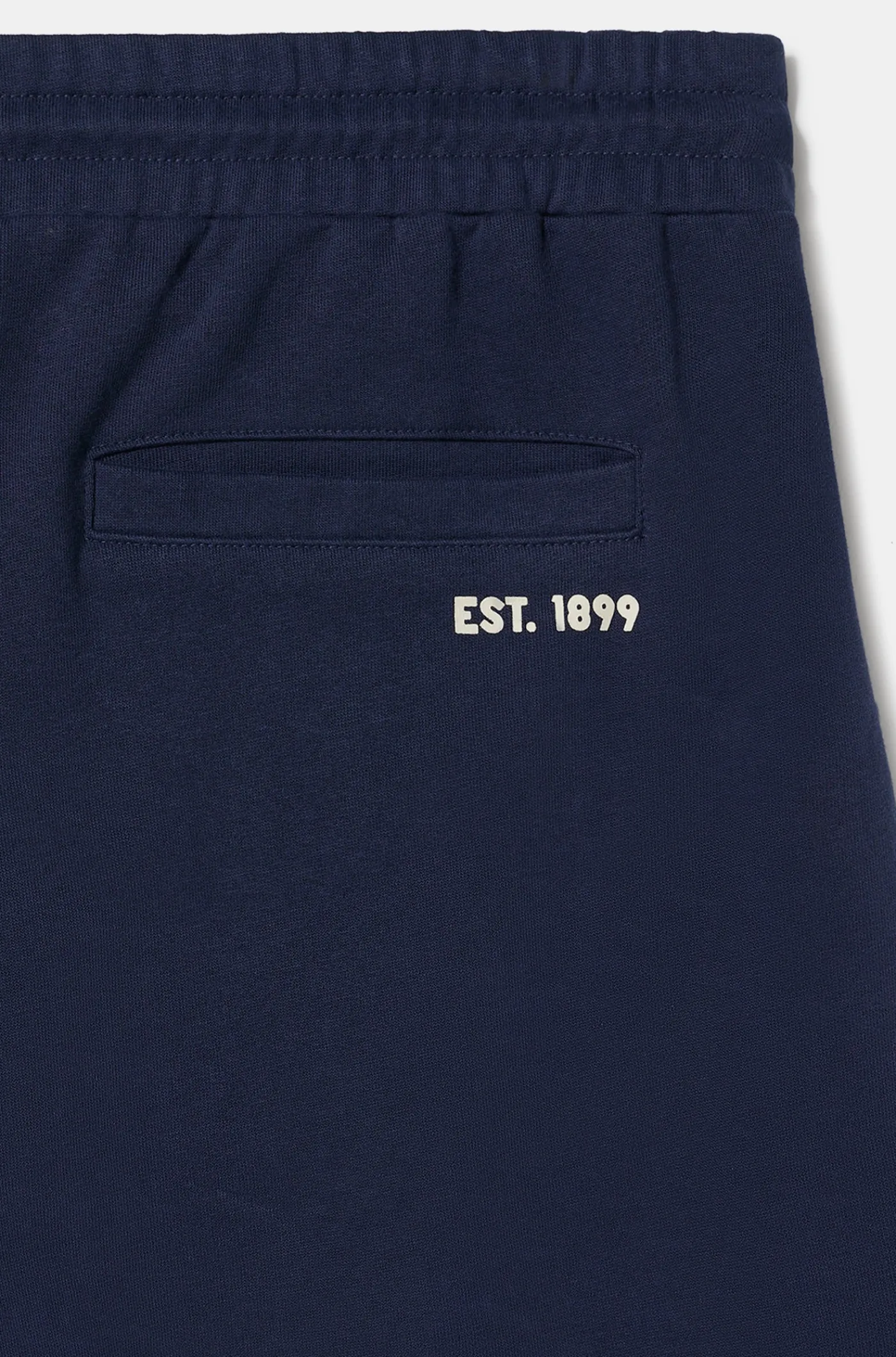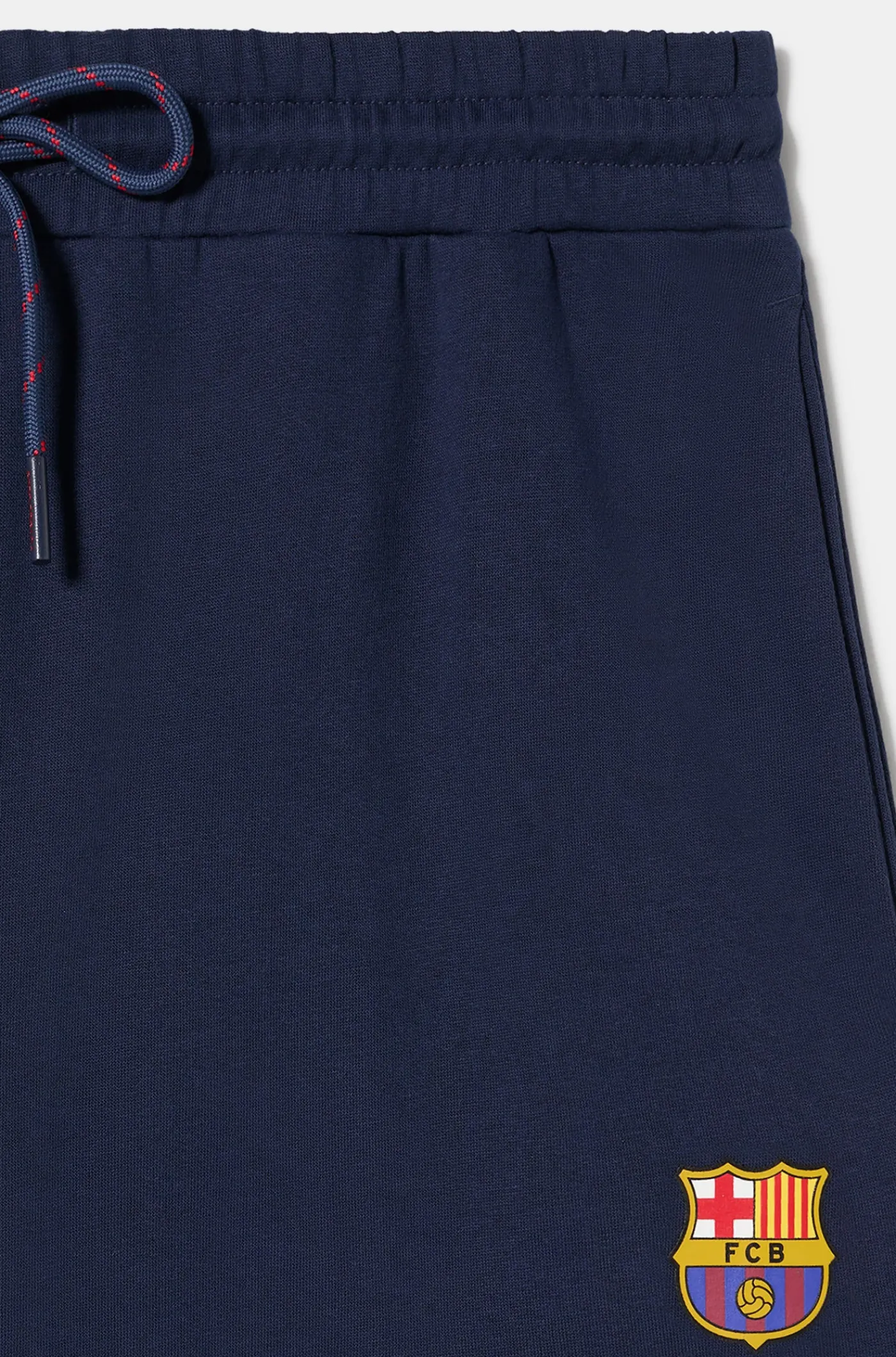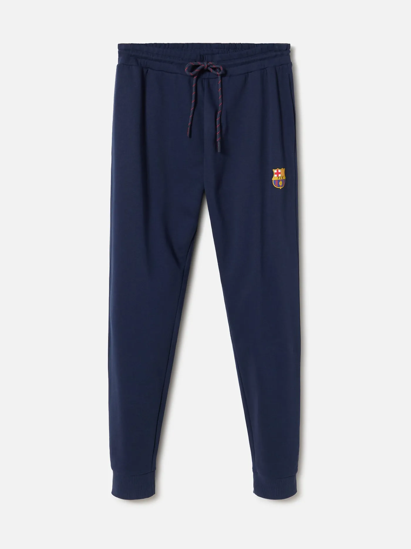 Pantalón largo de chándal azul marino. Con cordones ajustables. Escudo Barça en el lateral izquierdo. Cintura y bajos elásticos.