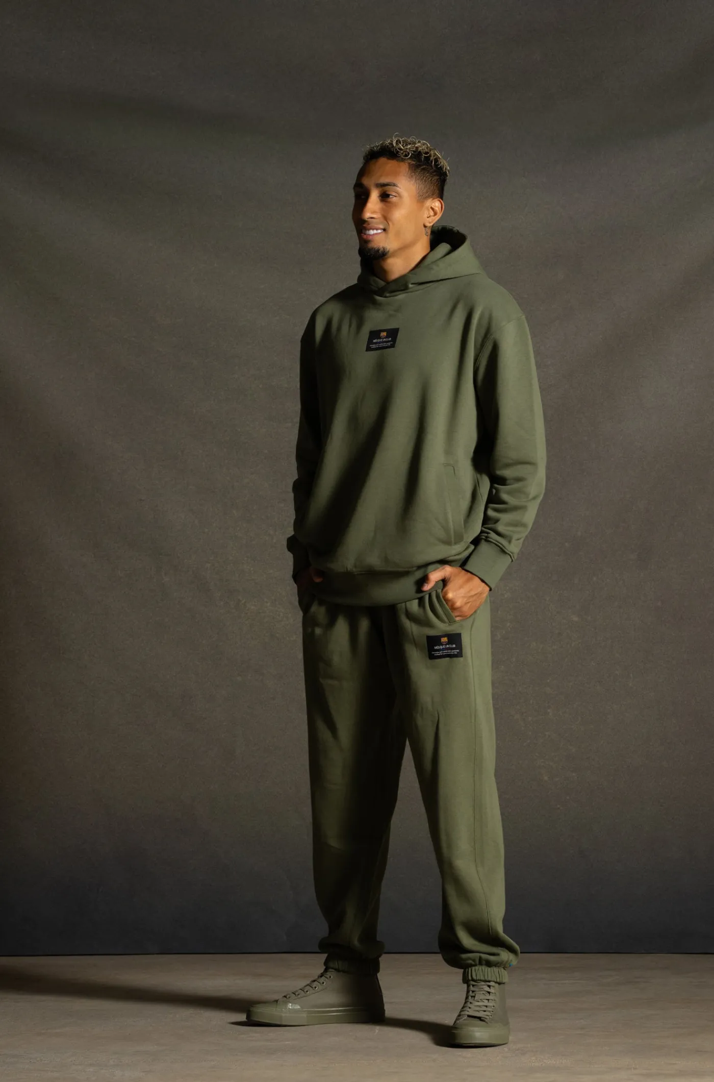 Pantalón de chándal, con parche con escudo pequeño del equipo FC Barcelona en el pecho y las palabras “Més que un club” en el delantero. Puños elásticos y cintura con cordones. Bolsillos abiertos en el delantero. Acabado suave en el interior. Color: caqui.