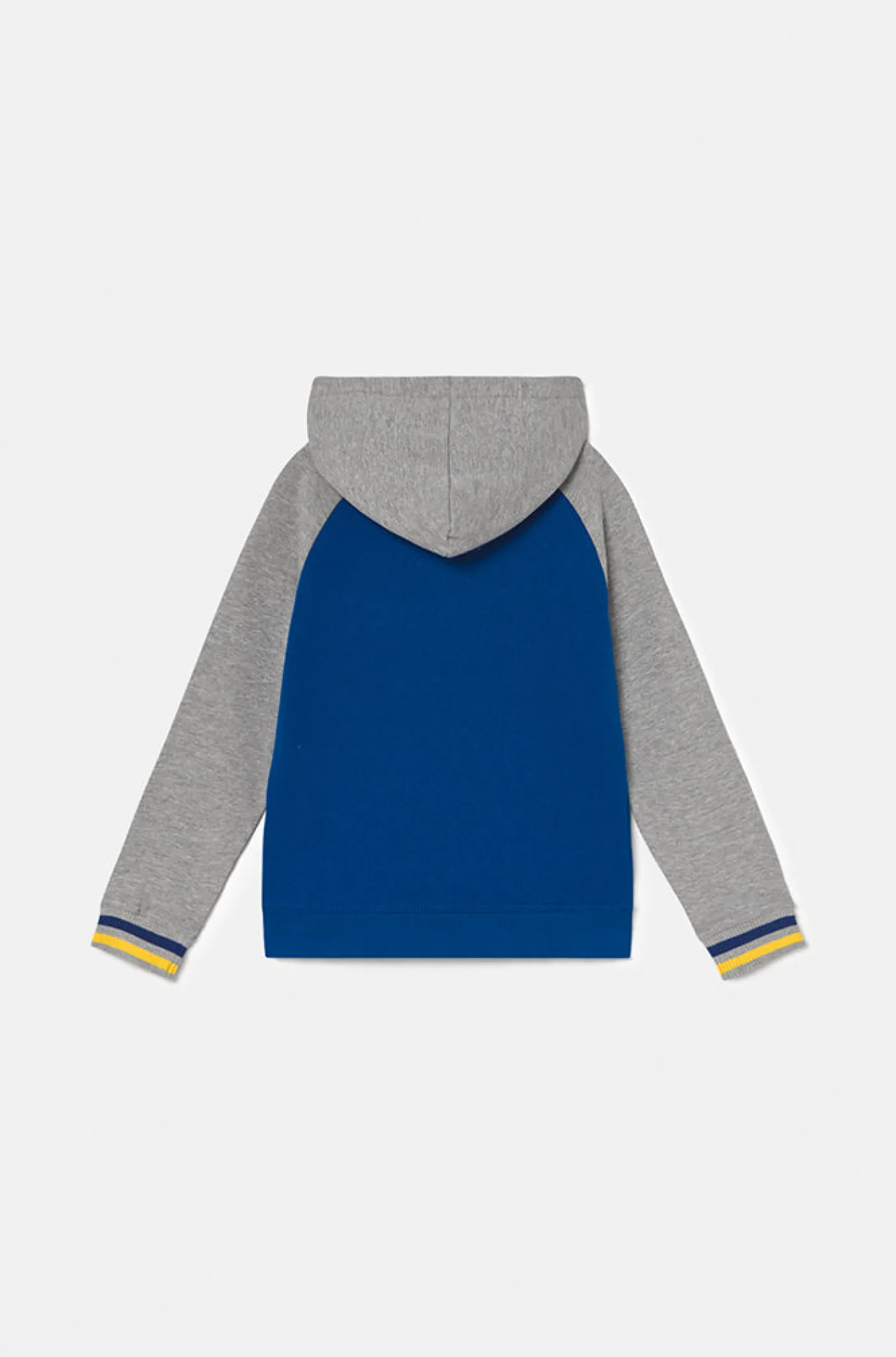 Sudadera niño con capucha y escudo a contraste del FC Barcelona. Detalle con puños a rayas. Interior de felpa ligera. Cuello redondo. Manga larga. Cintura y puños elásticos. Color: Gris jaspeado, azul y amarillo