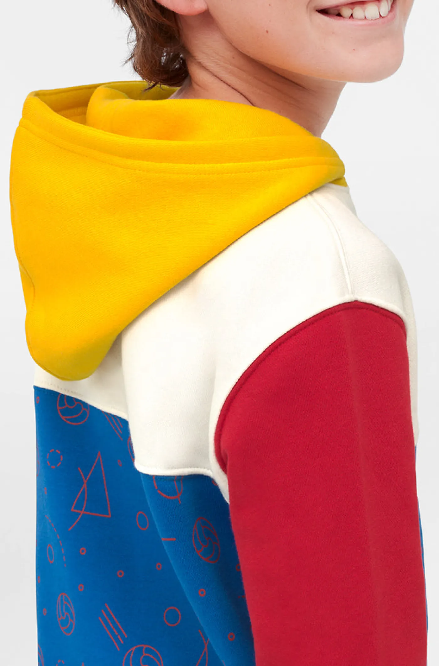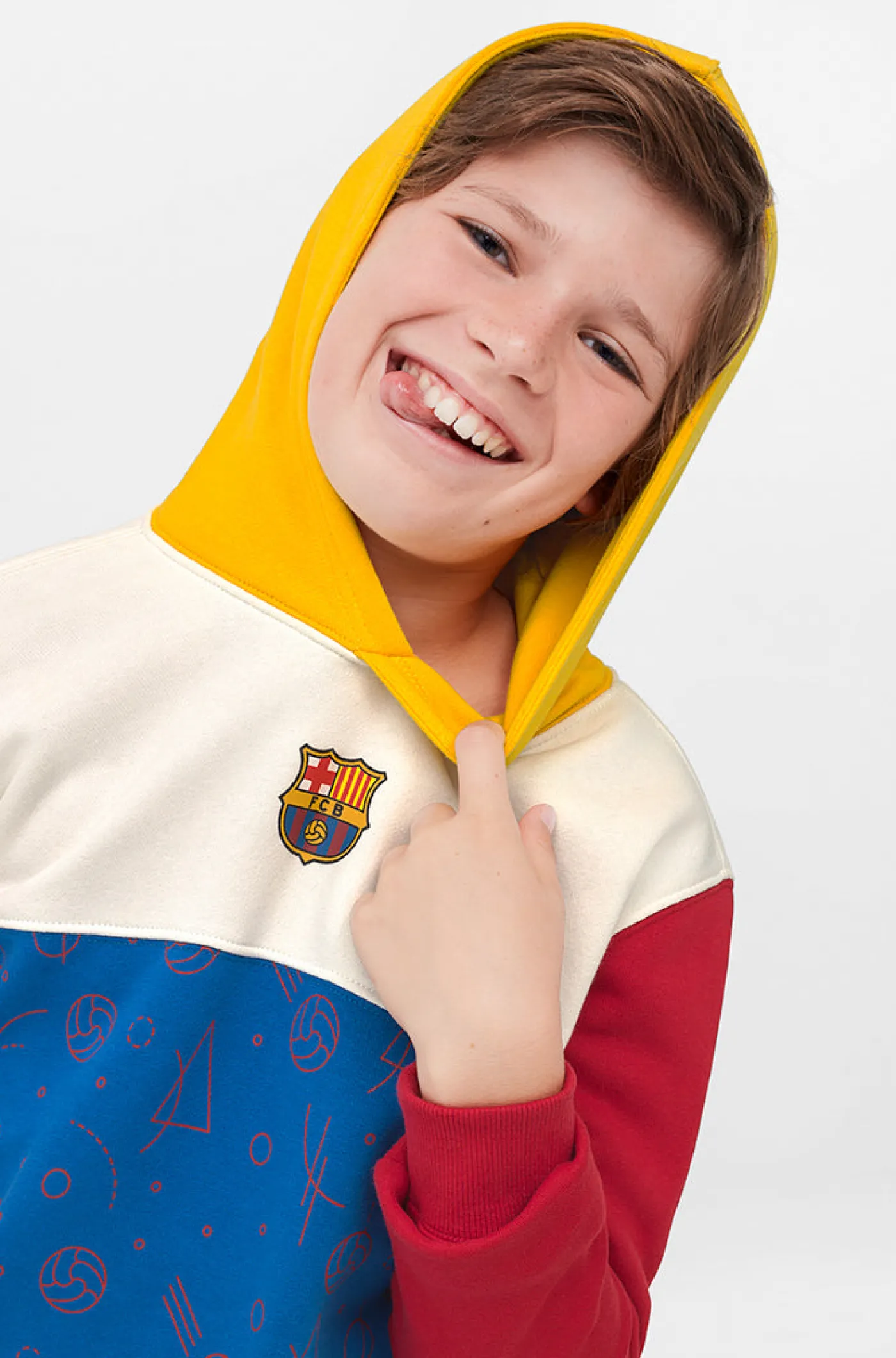 Sudadera con capucha para niños y niñas con el escudo del FC Barcelona en la parte frontal y con estampado de formas geométricas a contraste. Interior de felfa ligera. Manga larga. Cintura y puños elásticos. Color: beig, azul, rojo y amarillo.