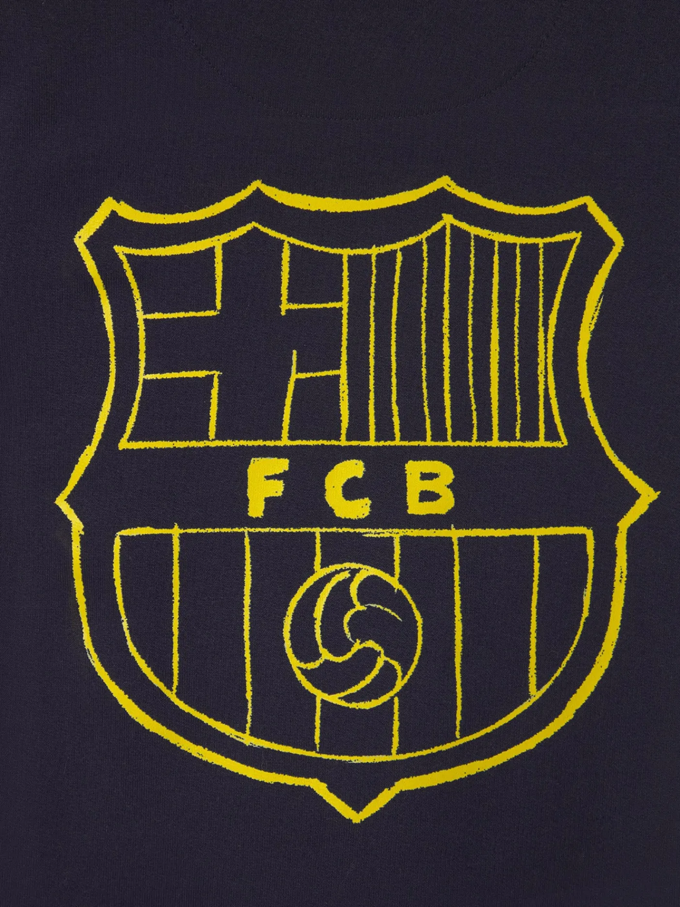- Parte trasera: Gran escudo del FC Barcelona en amarillo, destacando sobre el fondo azul marino.