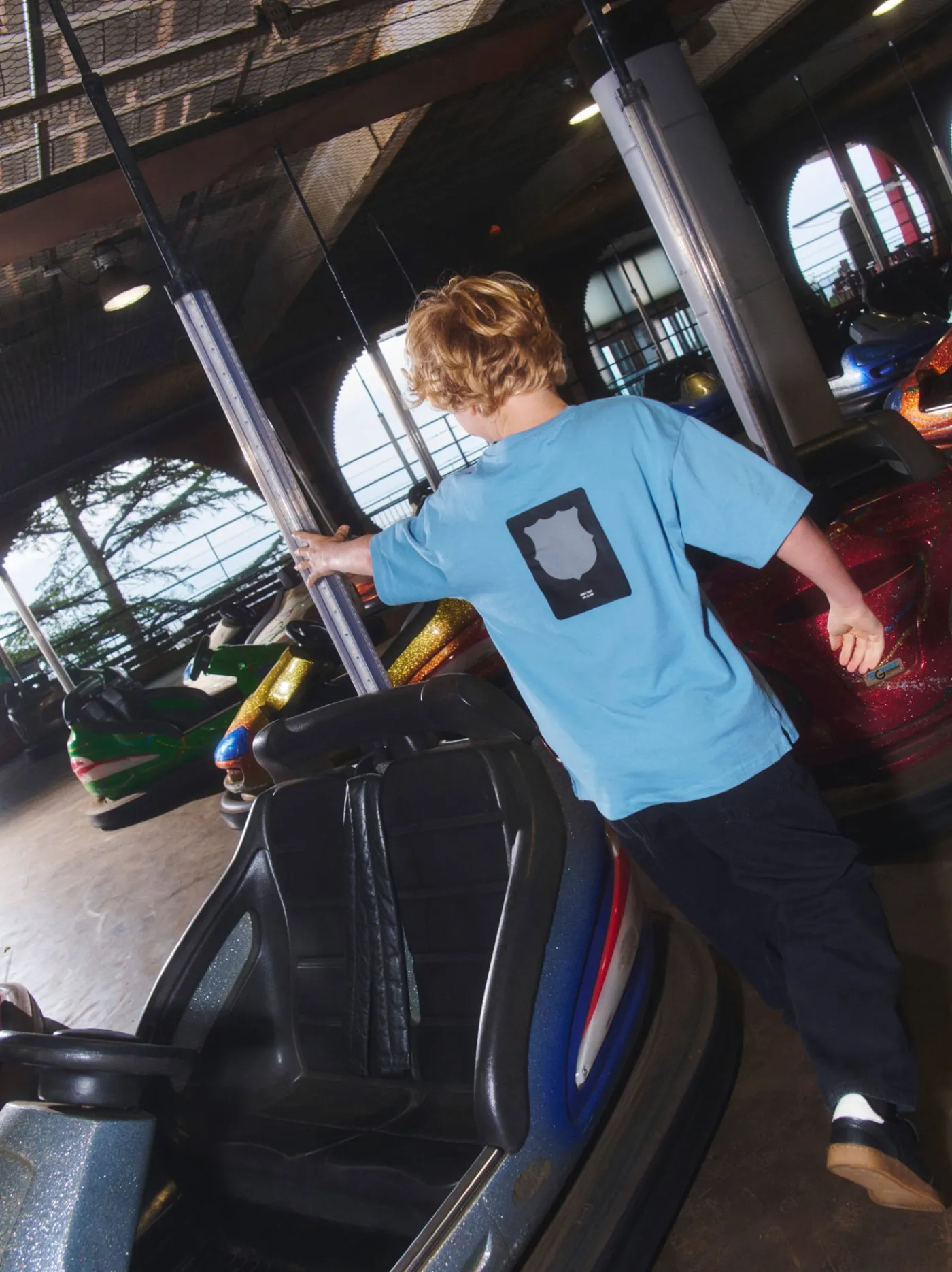 Camiseta azul de manga corta con cuello redondo y detalle Barça en el centro.Diseño con escudo estampado en la parte t…