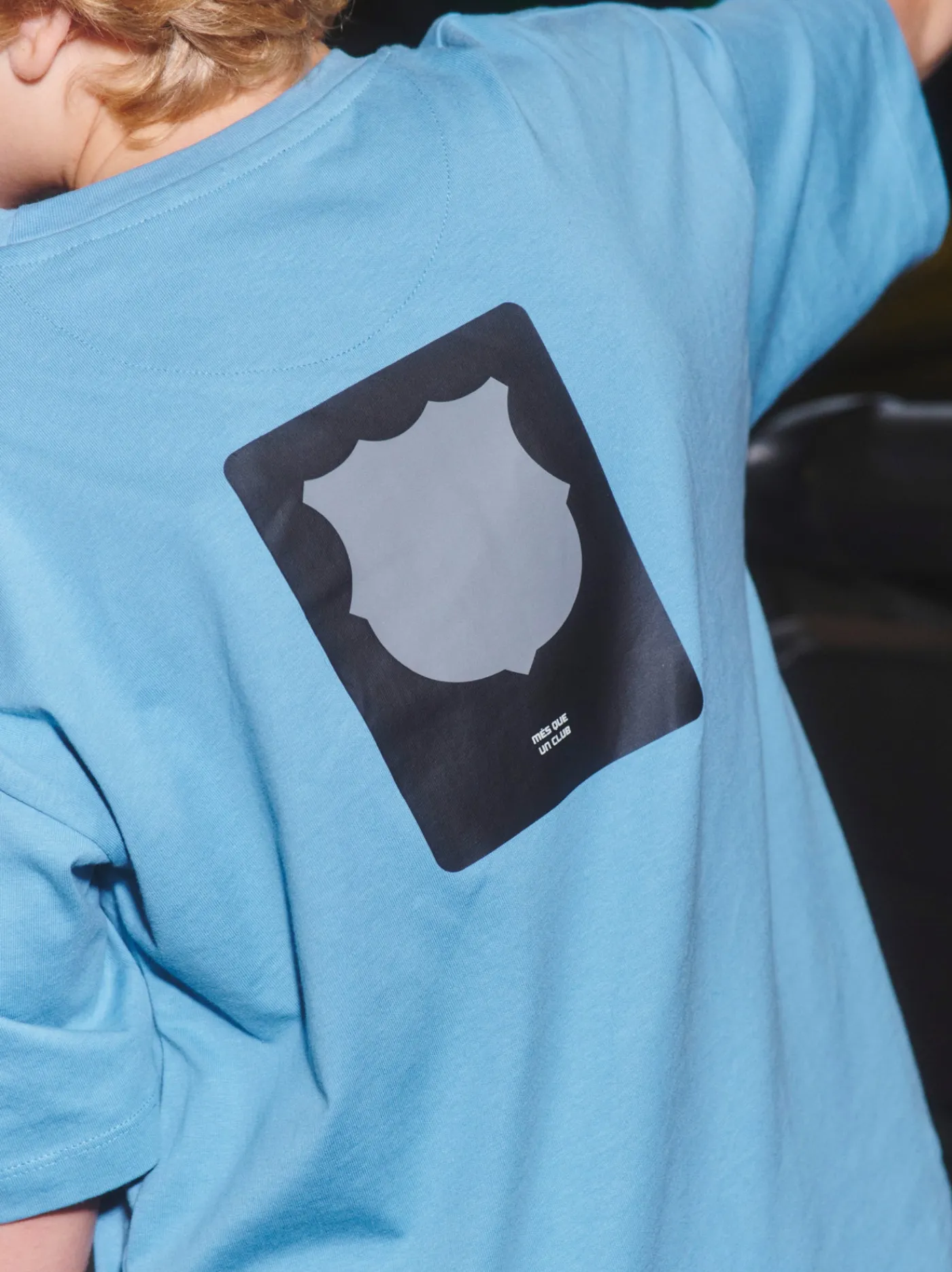 Camiseta azul de manga corta con cuello redondo y detalle Barça en el centro.