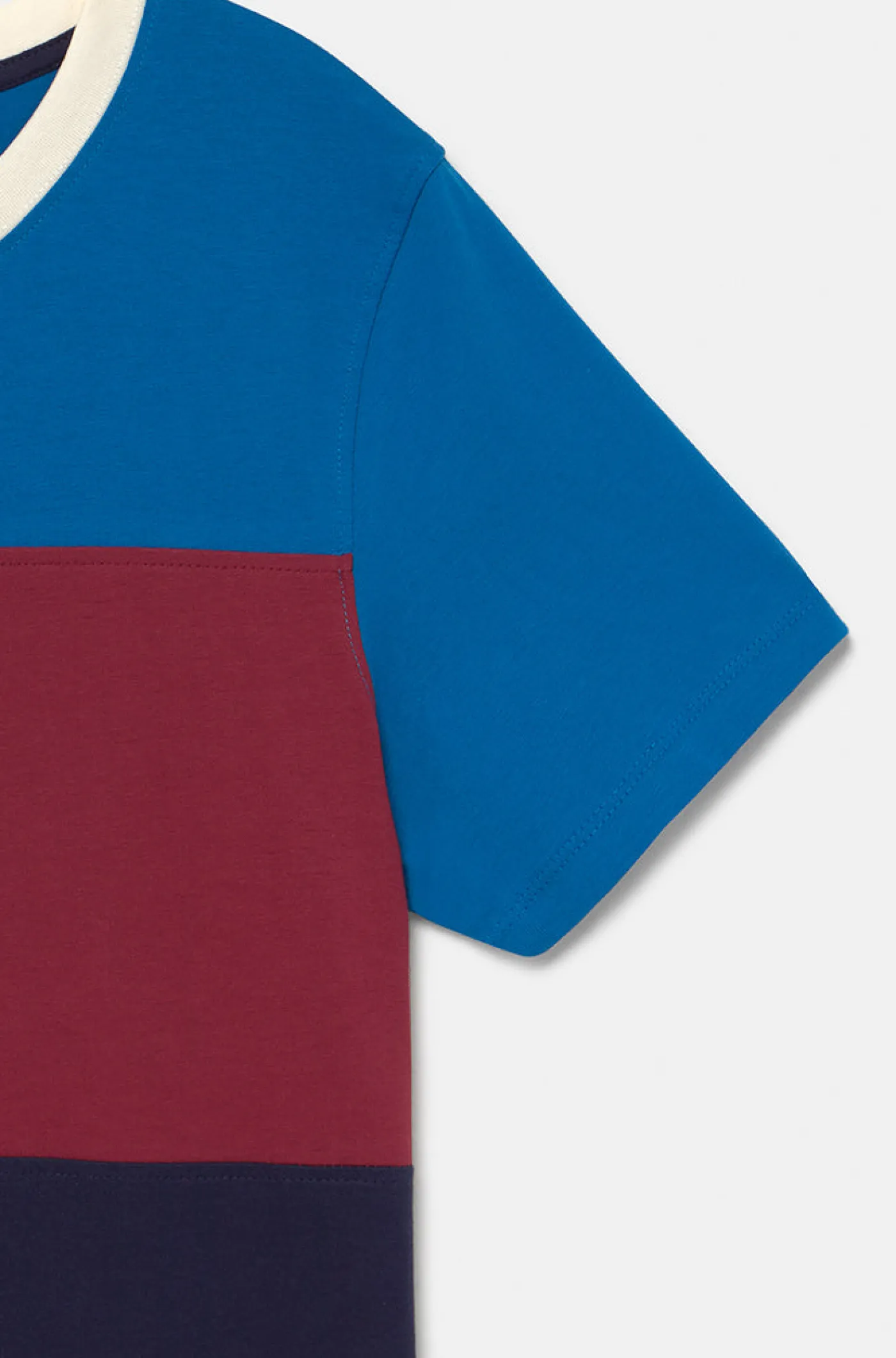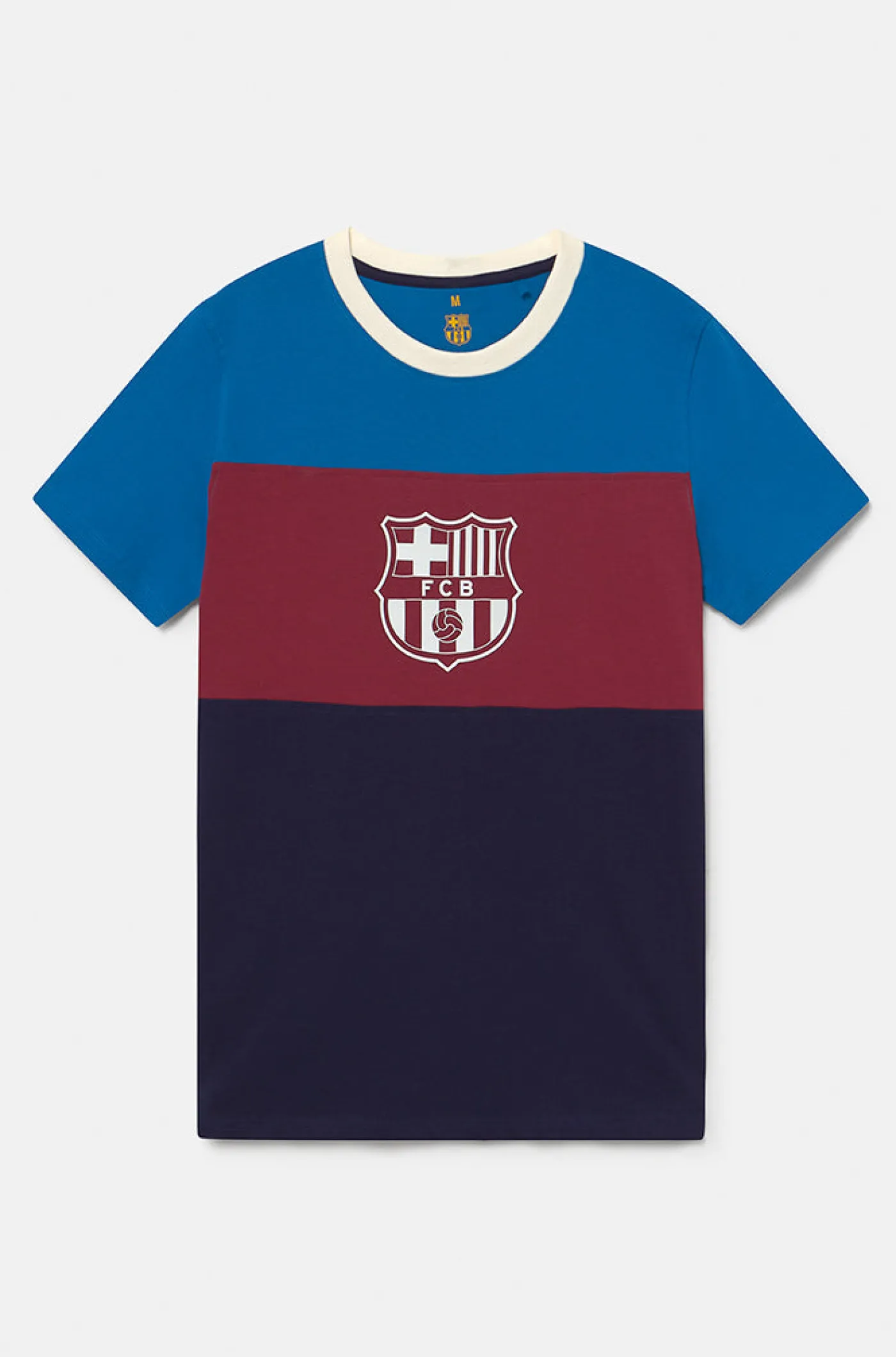 Camiseta tricolor con el escudo del FC Barcelona en relieve. Su tejido de algodón la hace una prenda cómoda y ligera. Cuello redondo. Manga corta. Color: azulgrana y marino.