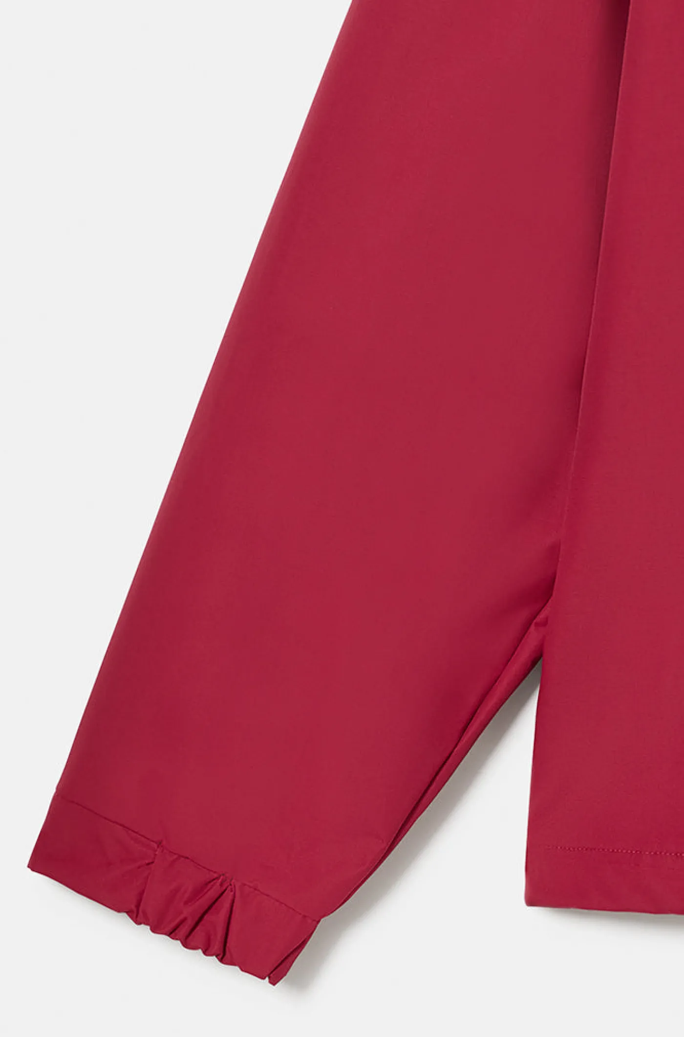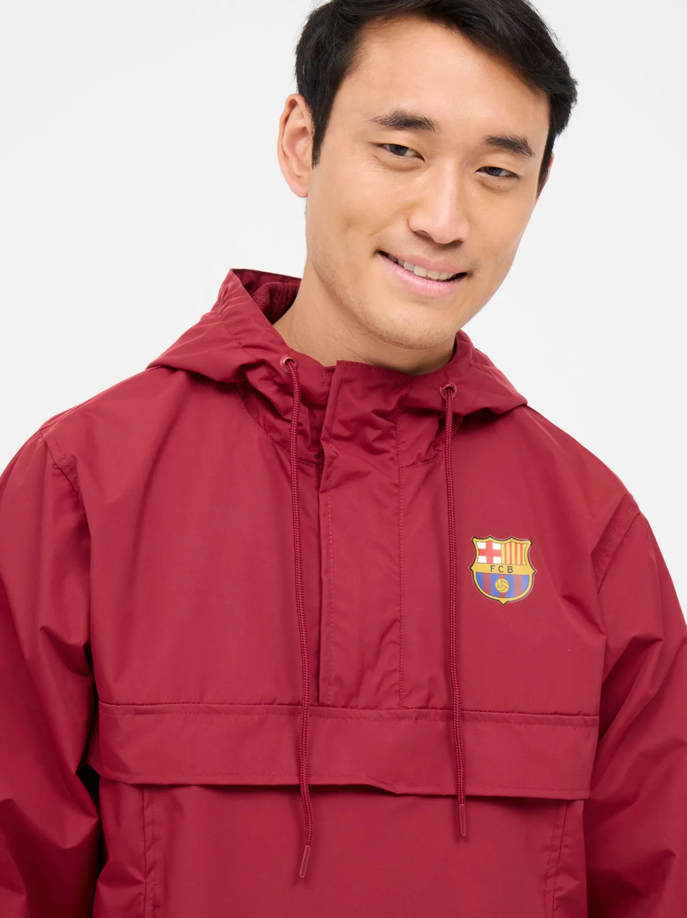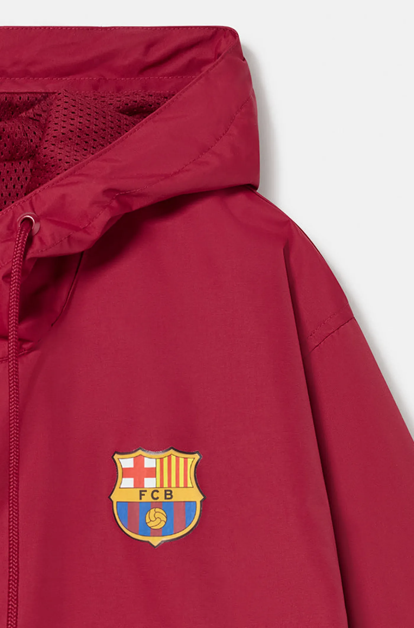 Chaqueta impermeable con el escudo del FC Barcelona en el pecho y lettering «BARÇA» en la parte trasera a contraste. Cuello alto con capucha. Manga larga con puños elásticos. Cierre con cremallera a medio pecho. Cierre con cremallera lateral para mayor comidad. Bolsillos delanteros: 2 con cremallera. Color: granate.