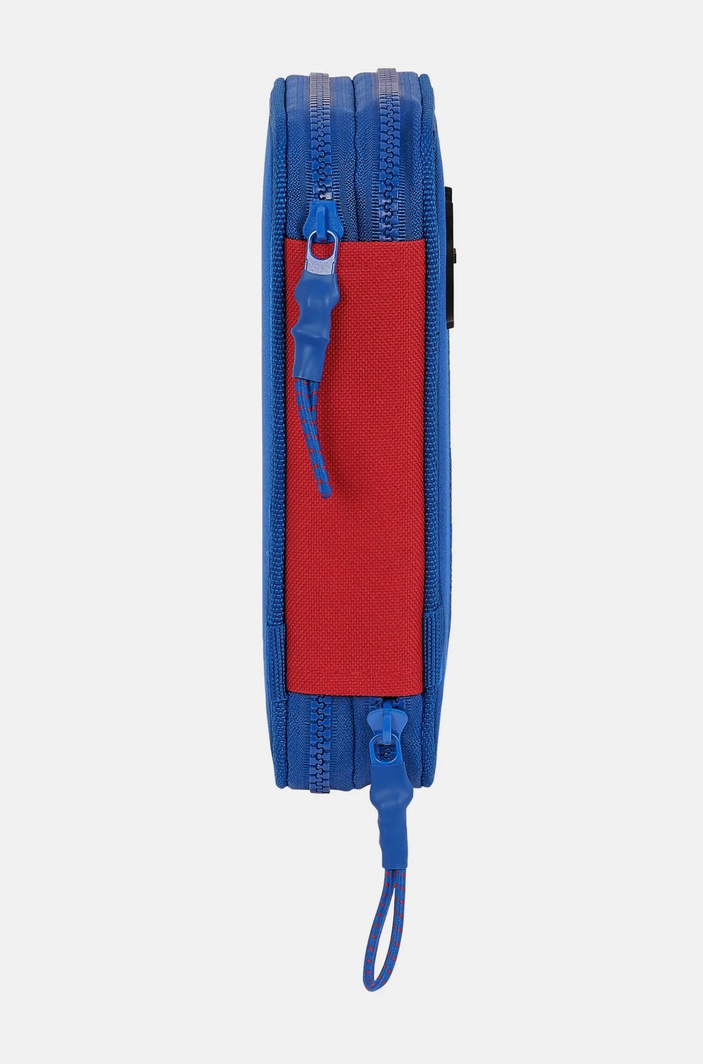 Estuche 2 en 1 con estampado de la segunda equipación del FC Barcelona y escudo del club en relieve. Logo bordado de tu equipo favorito. Contiene 34 piezas de papelería escolar: 1 bolígrafo, 1 lápiz, 1 sacapuntas, 1 goma de borrar, 1 regla, 12 lápices de colores, 16 rotuladores de colores y una tijera. Cierre con cremallera. Color: azul y escarlata