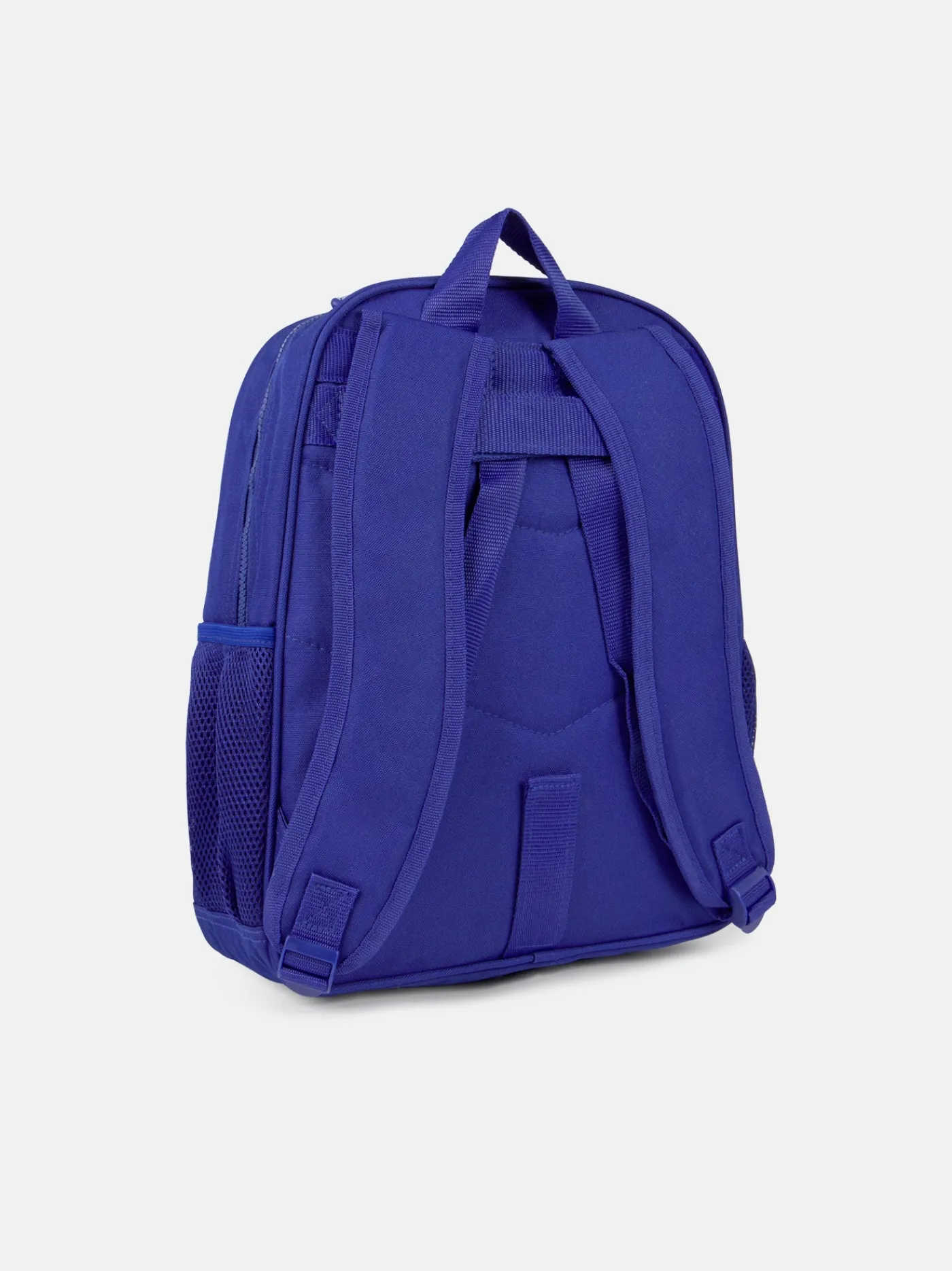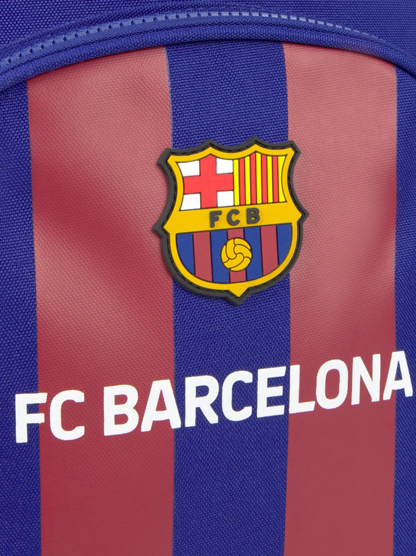 Mochila con estampado de la primera equipación del FC Barcelona y escudo en relieve. Logo bordado de tu equipo favorito. Contiene: 1 compartimento con cremallera y 1 bolsillo frontal con cremallera. Tirantes ajustables y correas de sujeción en la espalda para sujetarlo a una silla de paseo. Color: azul y escarlata