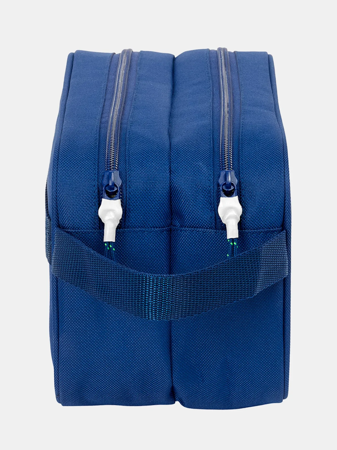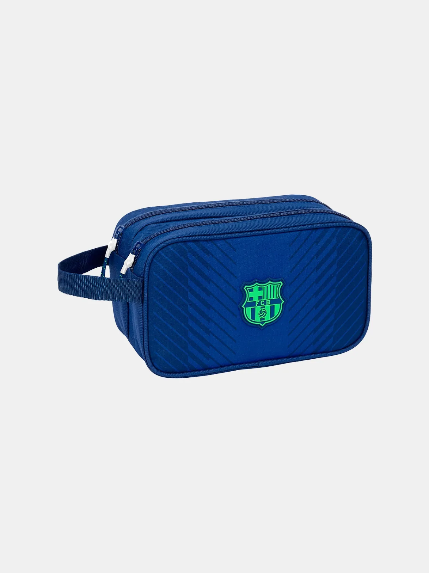 Neceser oficial del FC Barcelona en color azul. Fabricado con materiales de alta calidad, este neceser cuenta con un diseño moderno que incluye el escudo del club en el frente. Dispone de dos compartimentos principales con cremalleras independientes para una mejor organización de tus artículos personales. Ideal para viajes, actividades deportivas o el uso diario.