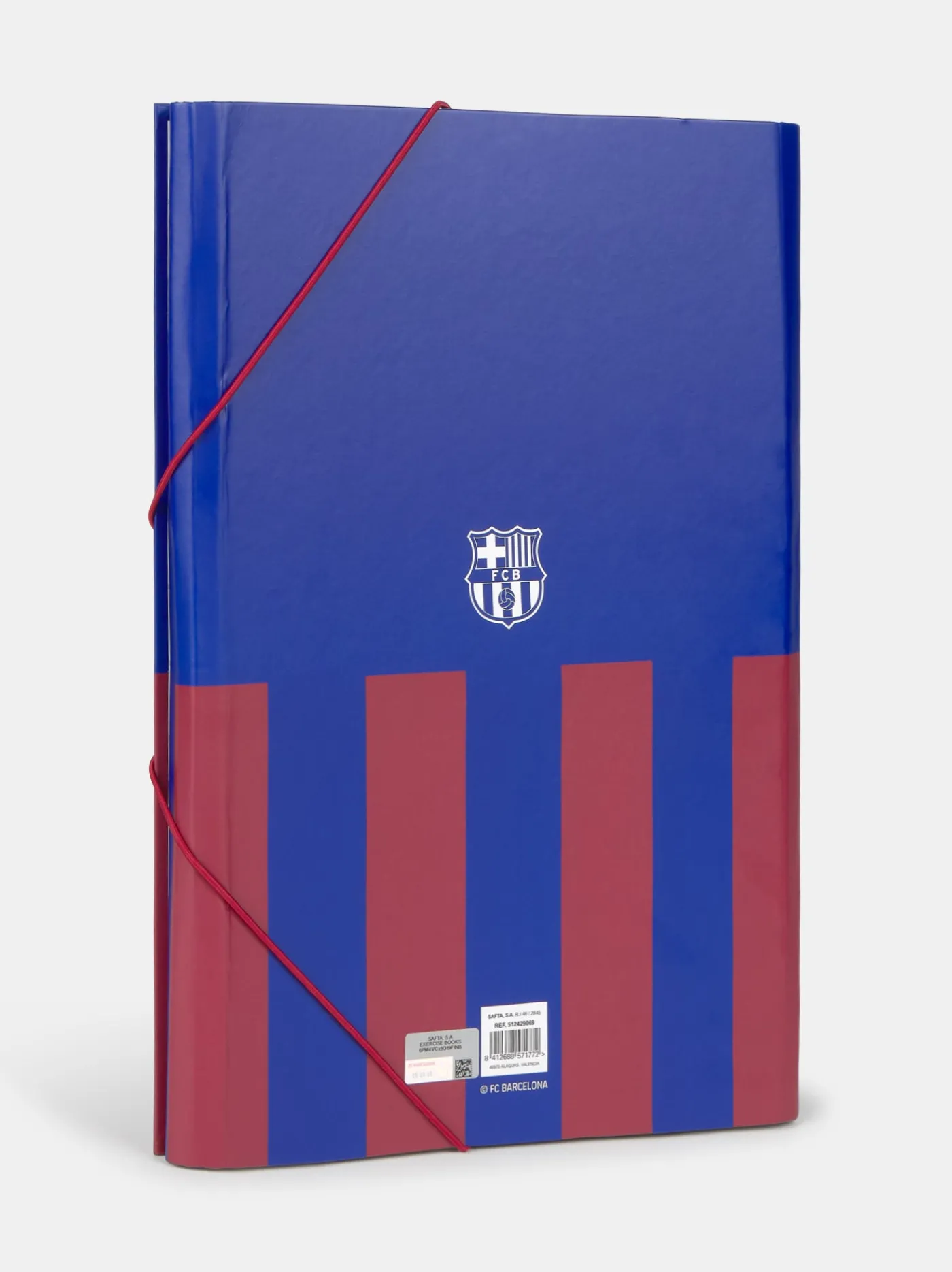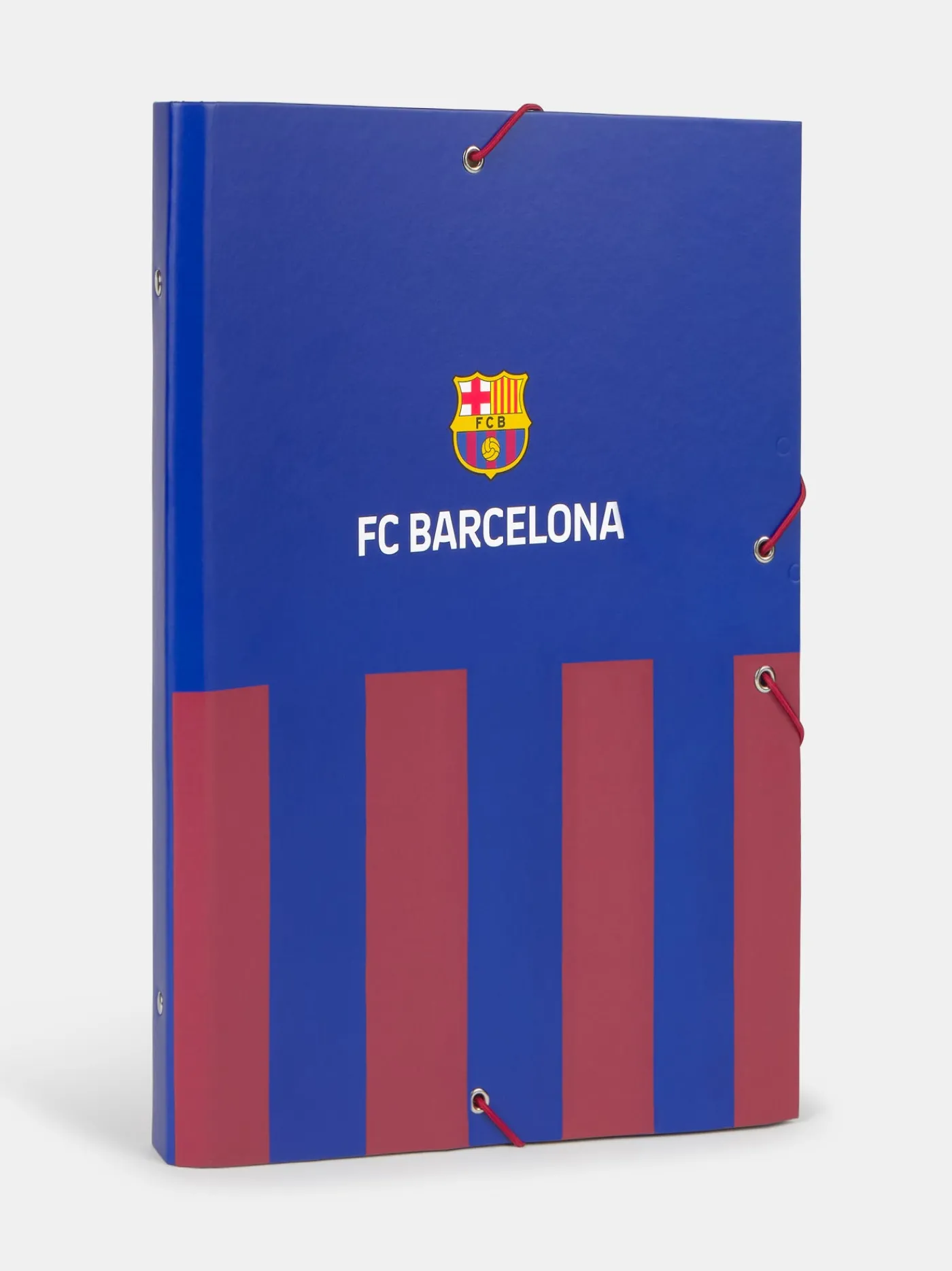 Libreta tamaño A4 con folios.Diseño blaugrana con escudo del FC Bareclona. Tapa dura y cierre con gomas elásticas.