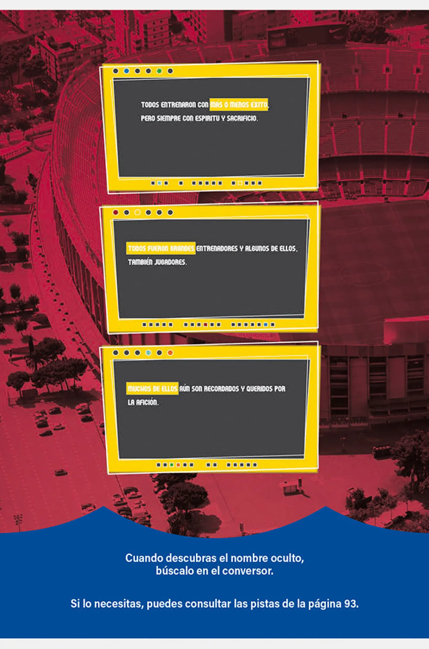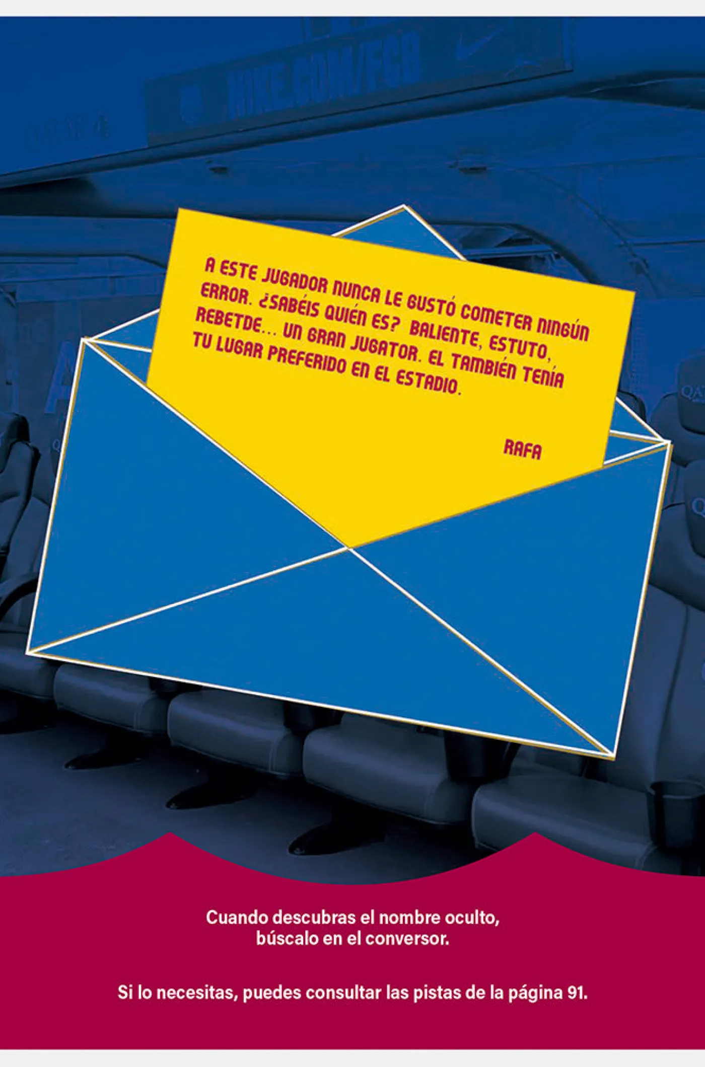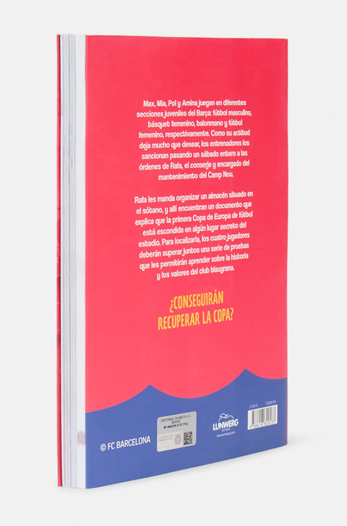El escape book oficial del Barça.Max, Mia, Pol y Amina son cuatro jóvenes que juegan en diferentes secciones del Barça: fútbol masculino, básquet femenino, balonmano y fútbol femenino, respectivamente. Su actitud en los entrenos y partidos deja mucho que desear, así que sus entrenadores les sancionan pasando un sábado entero a las órdenes de Rafa, el conserje y encargado del mantenimiento del Camp Nou.Rafa les manda ordenar un almacén situado en el sótano, donde descubren una caja vieja cerrada con un candado. Cuando consiguen abrirla, dentro encuentran un documento que explica que la primera Copa de Europa que ganó el Barça está escondida en algún lugar secreto del estadio.Los cuatro jóvenes iniciarán un viaje por los diferentes espacios del Camp Nou a lo largo del cual irán resolviendo misterios y aprendiendo sobre la historia del club.¿Conseguirán recuperar la copa?Idioma: Castellano