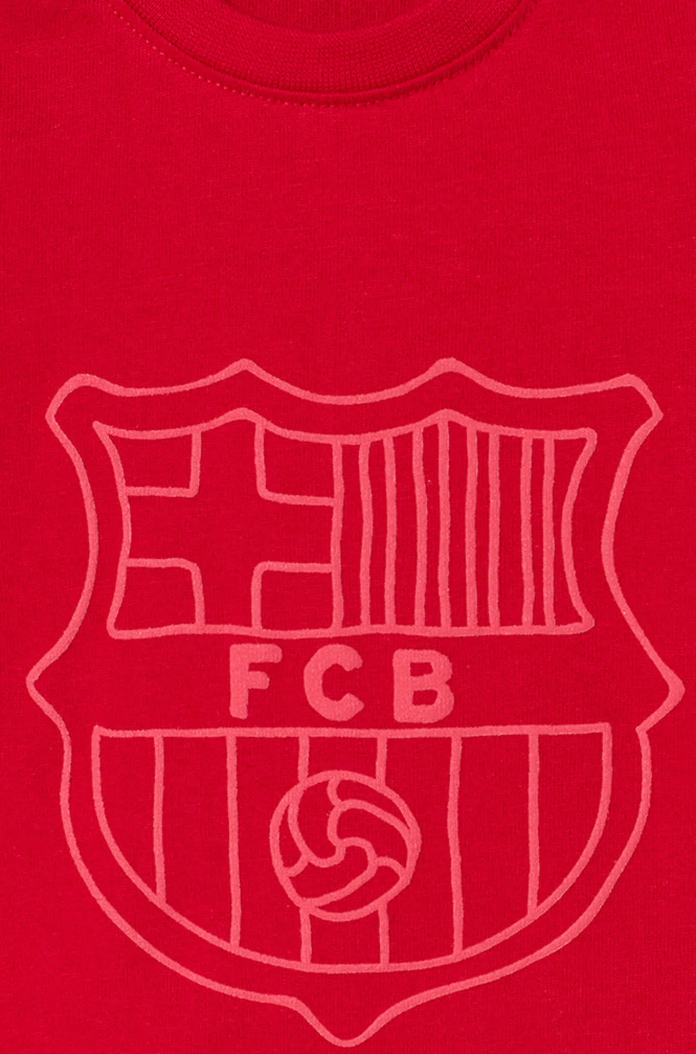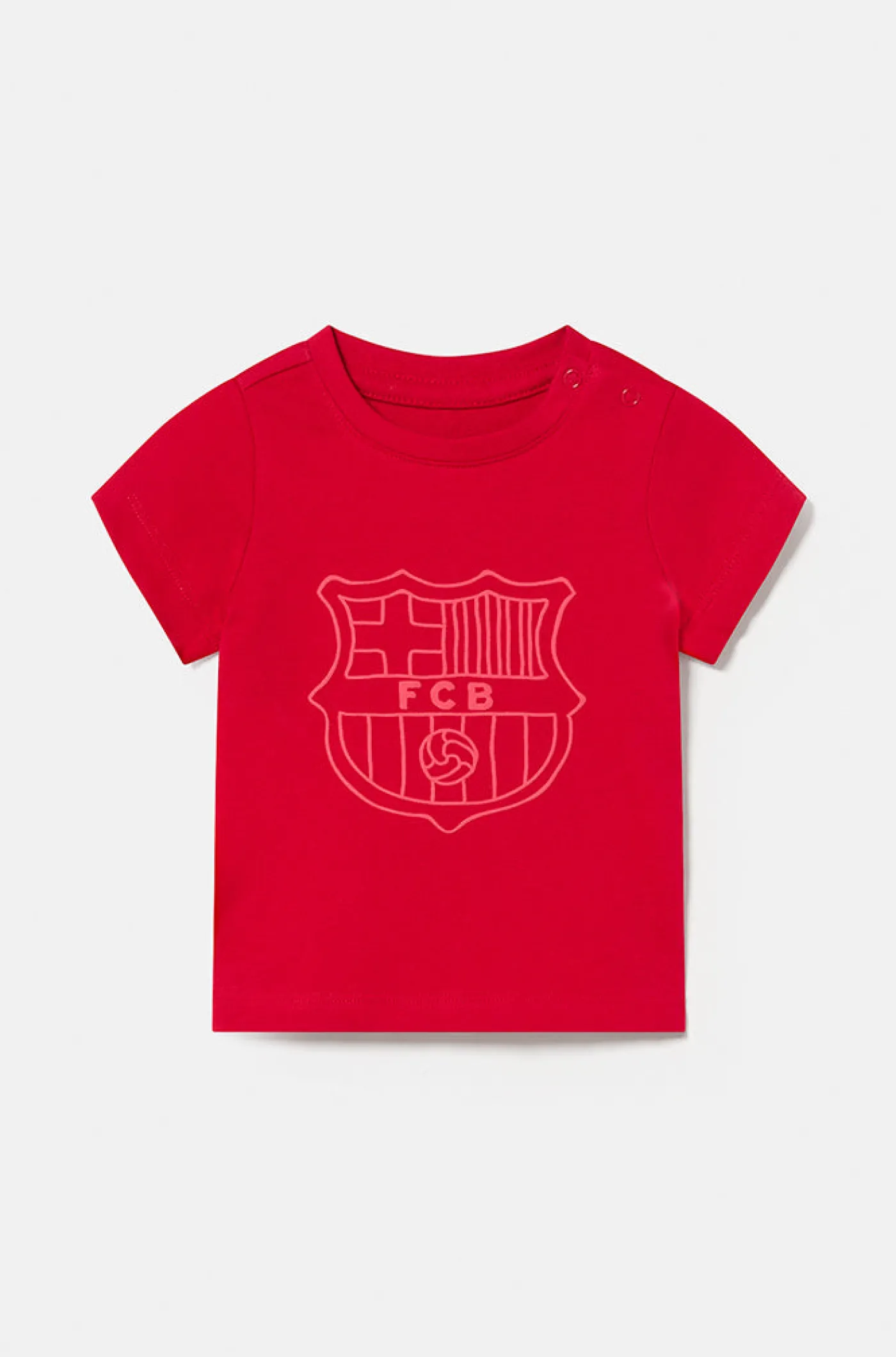 Camiseta de bebé de manga corta con el escudo del FC Barcelona en relieve. Dorso decorado con rótulo «Barça» en azul y granate. Escote redondo. Cierre con botón a presión en el hombro. Color: Rojo.