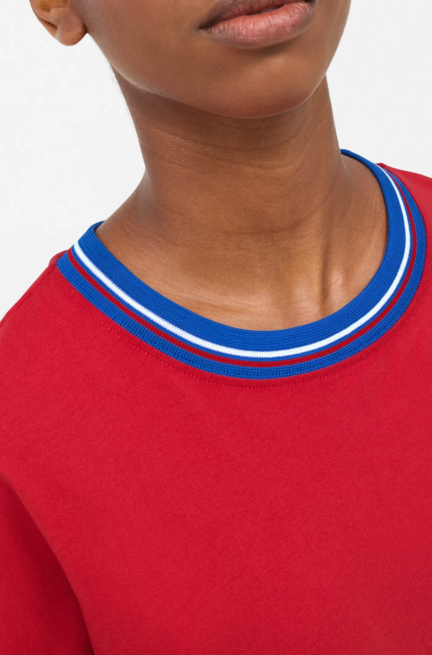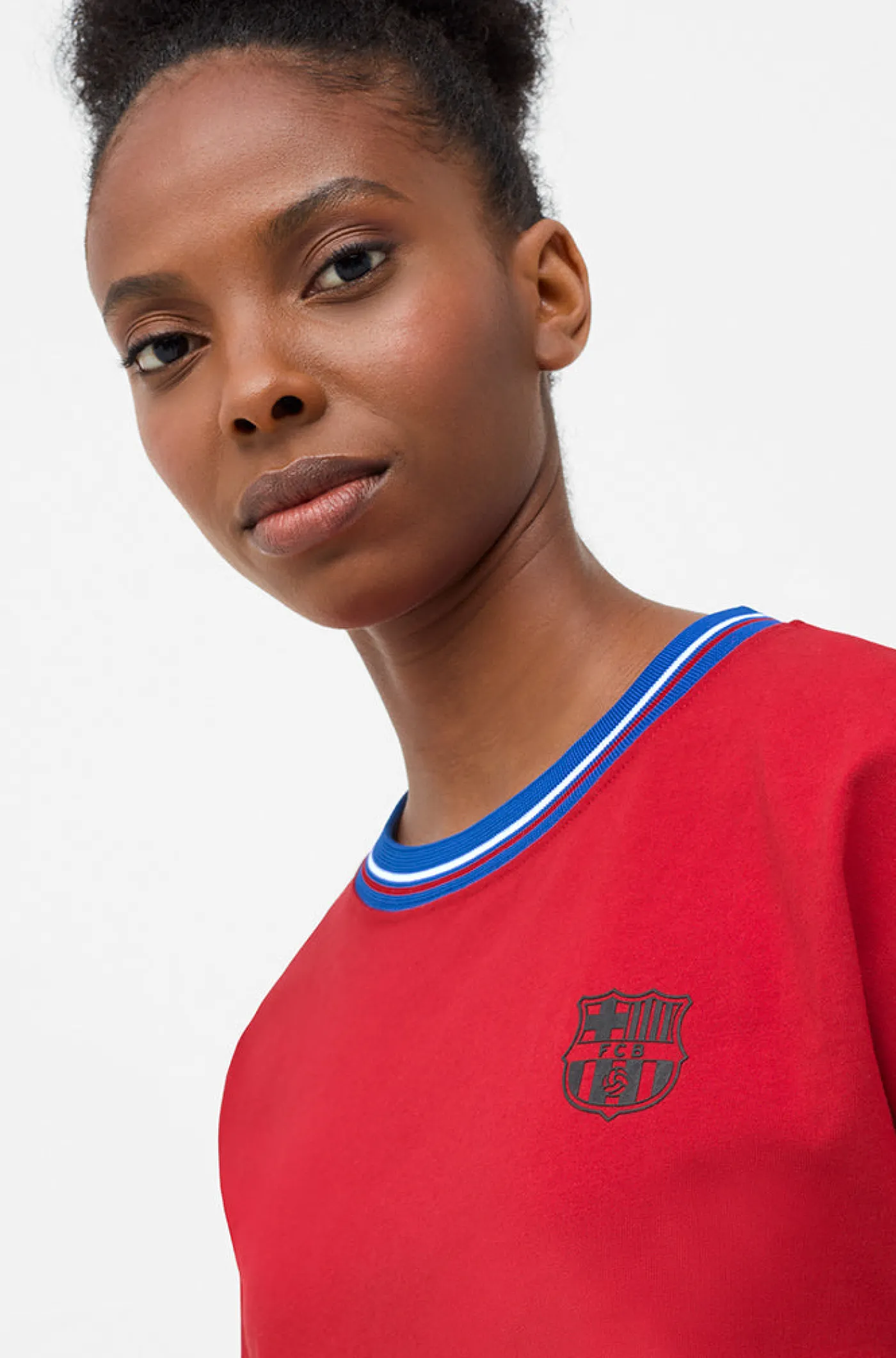 Camiseta Crop para mujer con el escudo en relieve del FC Barcelona. Su parte posterior destaca la bandera azulgrana con efecto toalla. Cuello redondo. Manga corta. Color: Azulgrana