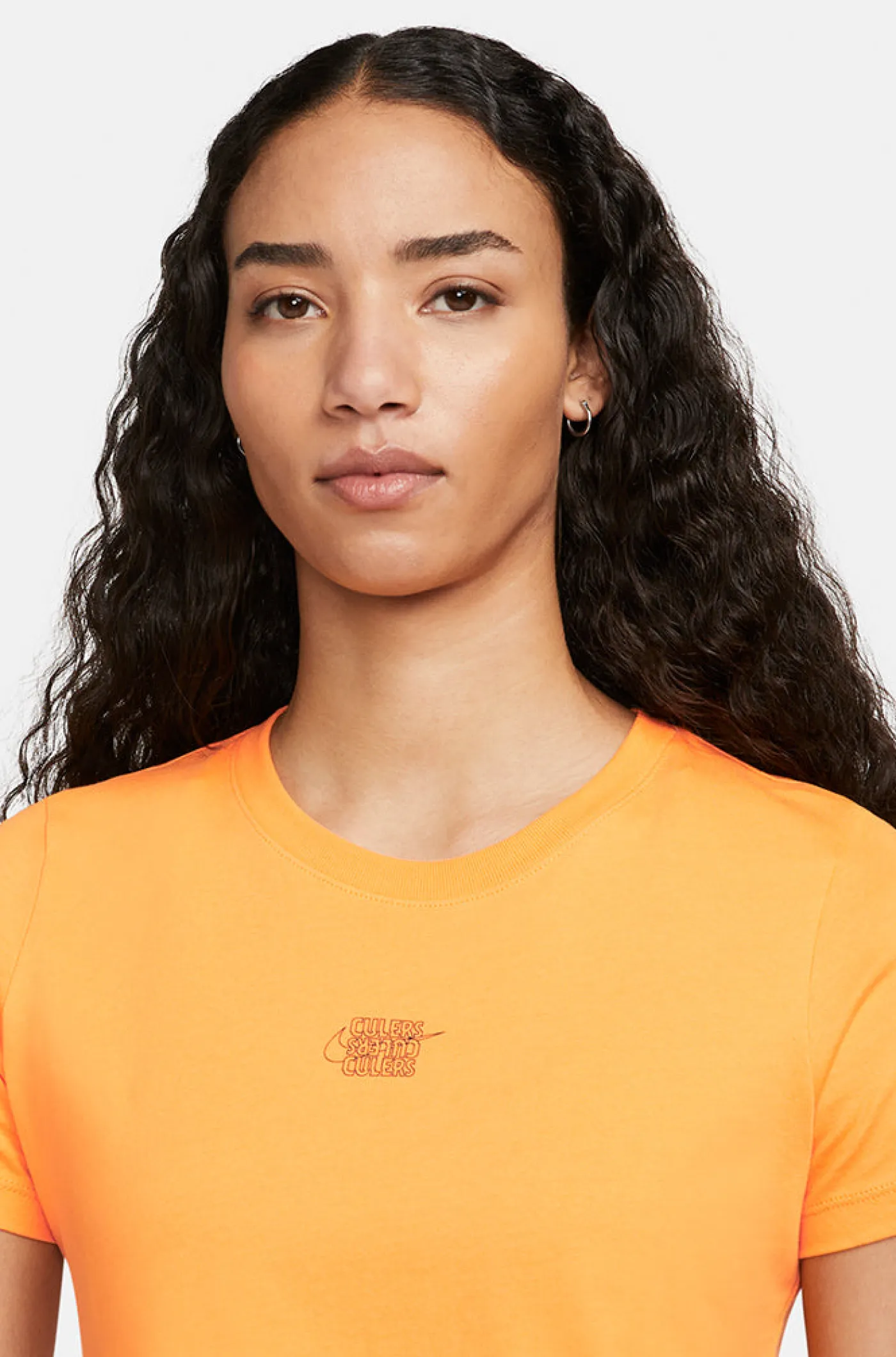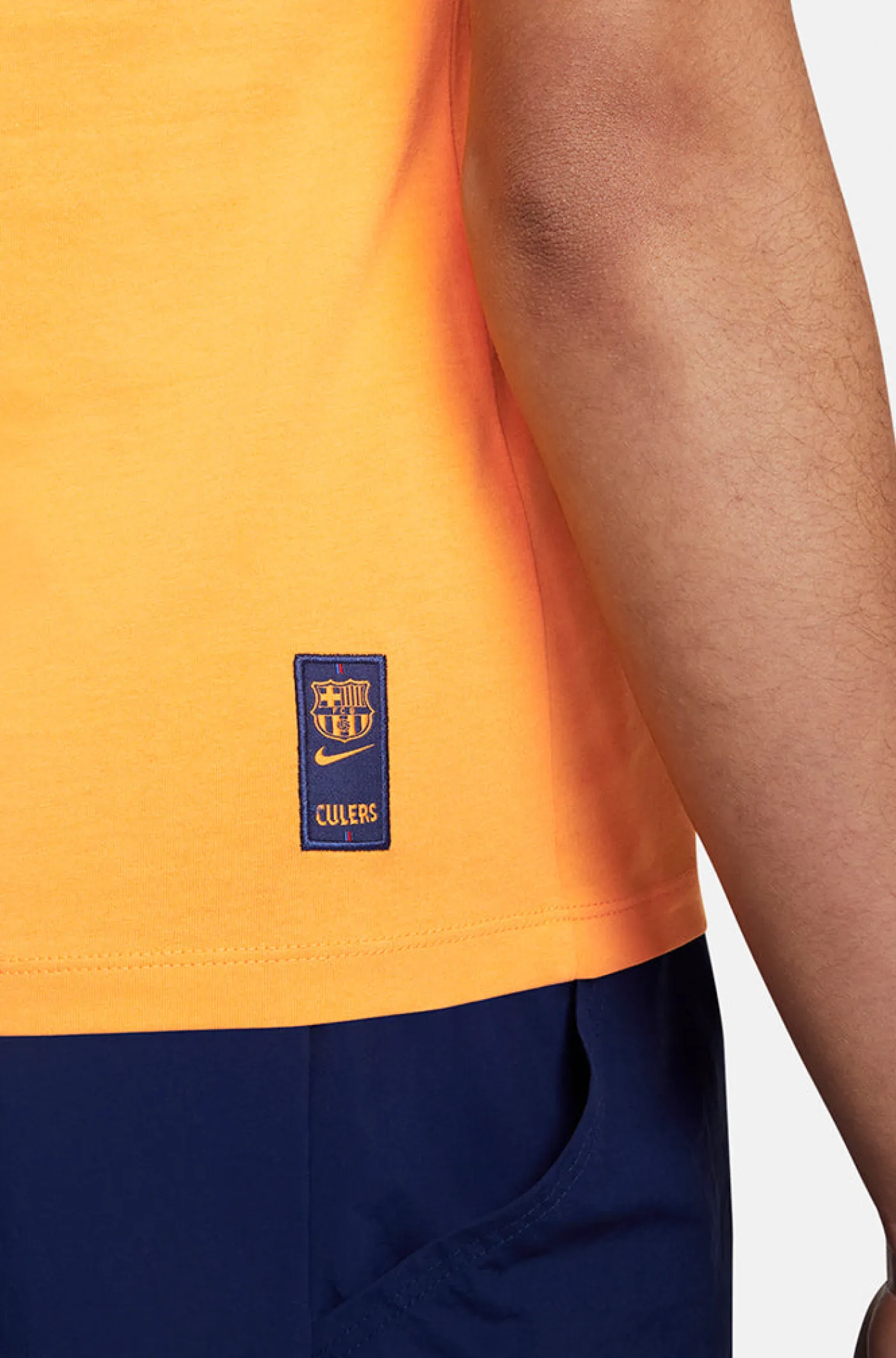 Camiseta de manga corta para mujer con rotulación de “Culers” y el logo de Nike centrados en el pecho. Detalle de escudo del FC Barcelona en la parte inferior posterior de la cintura. Cuello redondo. Su tejido de algodón la convierte en una prenda cómoda y ligera. Color: naranja.