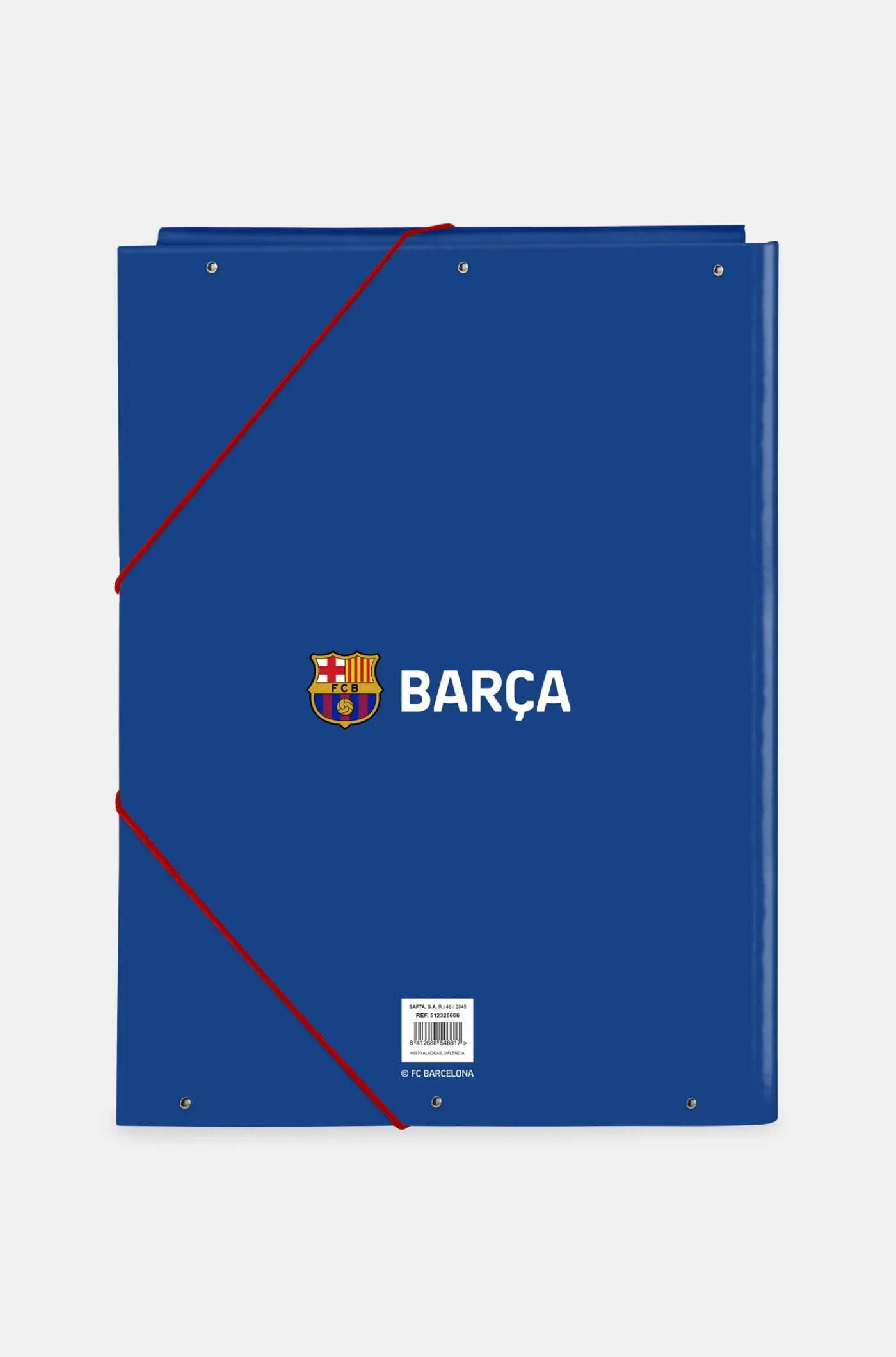 Carpeta del FC Barcelona, tamaño folio. Tapas duras, con 3 solapas interiores y cierre con gomas elásticas.