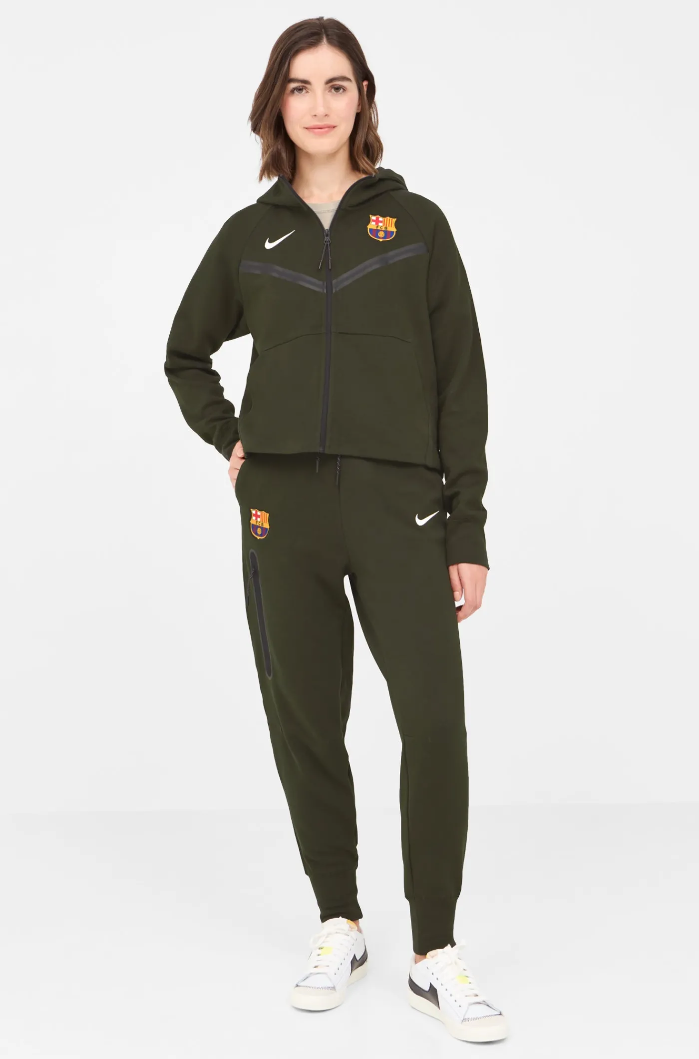 Chaqueta del FC Barcelona 23/24 para mujer. Con el escudo del FC Barcelona y el logo de Nike bordado en el pecho a contraste. Manga larga. Capucha y cierre con cremallera. Dos bolsillos abiertos en la parte delantera y otro en la manga con cremallera. Color: verde.