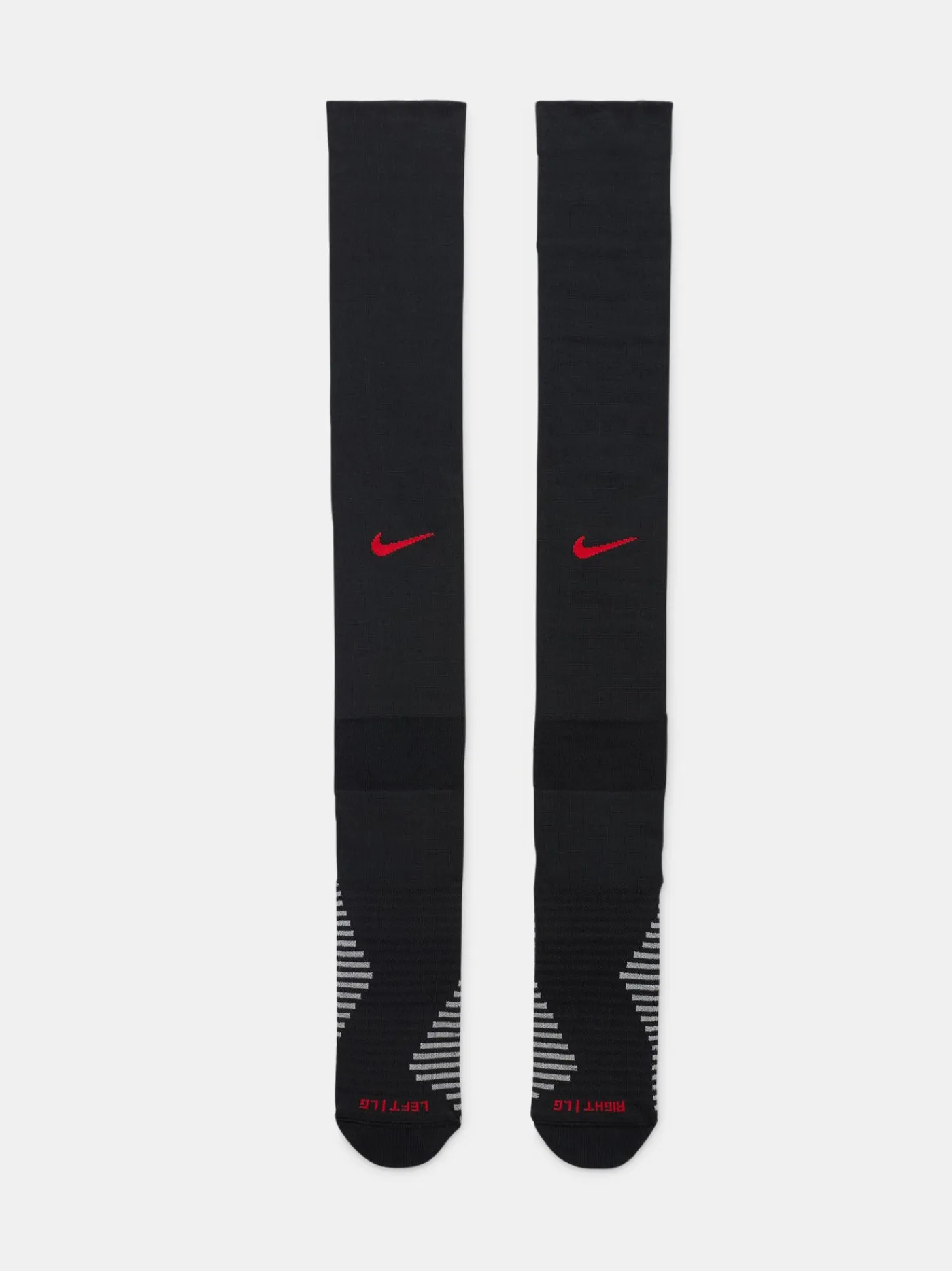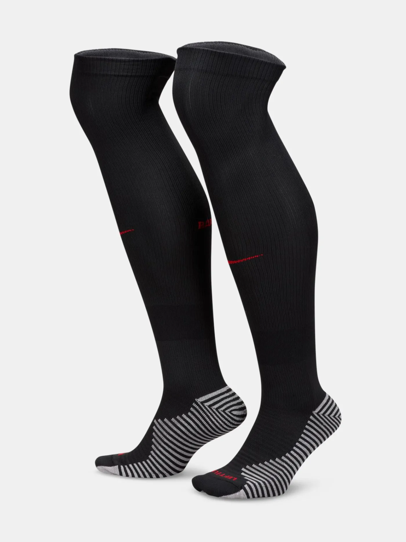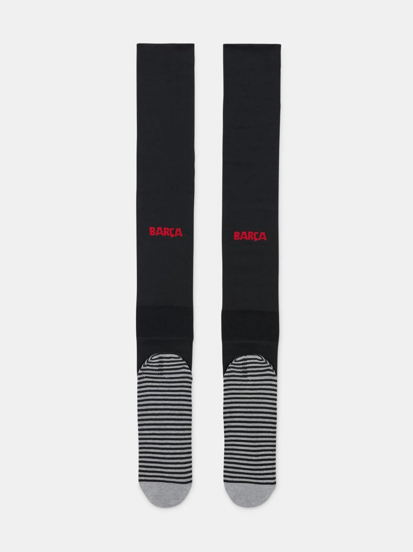 Calcetines de fútbol de la primera equipación del FC Barcelona. Su tejido está diseñado para capilarizar el sudor, con una banda ceñida alrededor del arco del pie para mantener los pies secos y cómodos. La amortiguación en la parte inferior crea una mayor durabilidad. Tecnología Nike Dri-FIT. Color: negro.