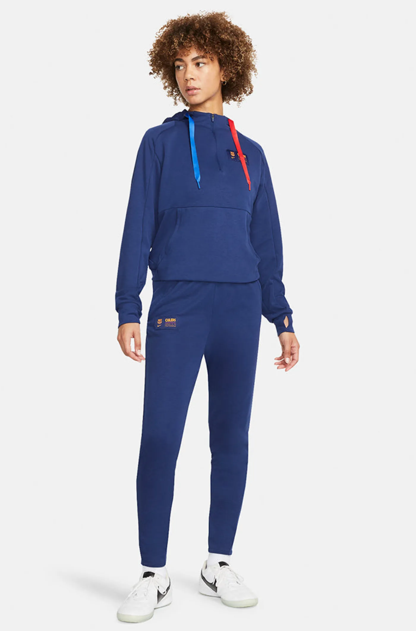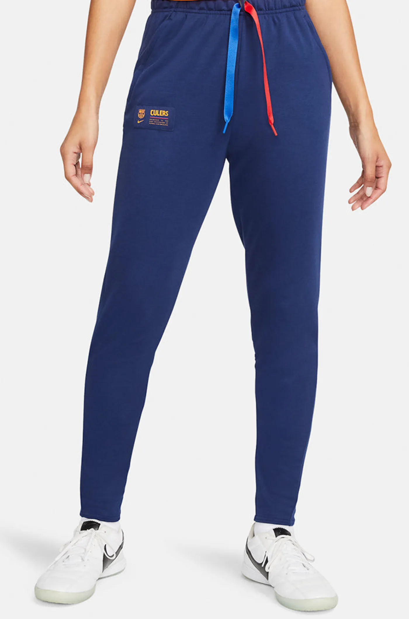 Pantalón deportivo para mujer con el parche del escudo de FC Barcelona y el logo de Nike bordado a contraste. Detalle de bandas azulgranas con la rotulación de “Culers” en la parte posterior de las piernas. Cintura elástica con cordones. Bolsillos delanteros: 2 con cremallera bajo solapa. Bajo con acabado en canalé. Tecnología Dri-FIT de Nike. Color: azul marino.