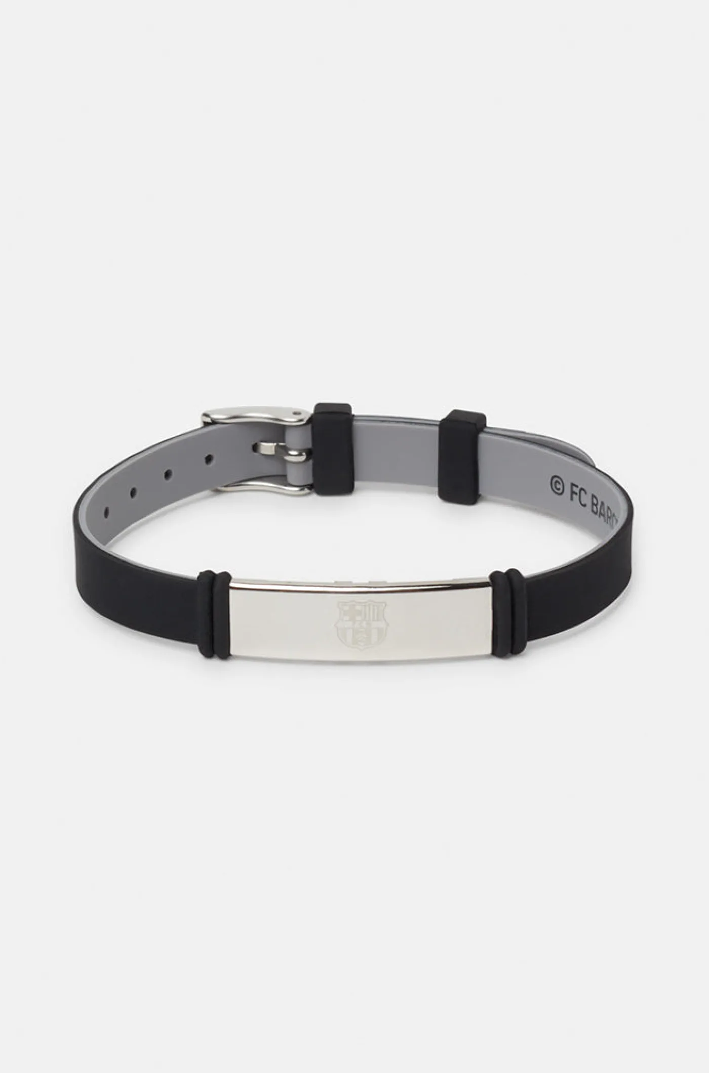 Pulsera fashion con logo grabado del FC Barcelona. Cierre con hebilla. Realizada con materiales anti alérgicos y antibacterianos. Color negro, gris y plateado.