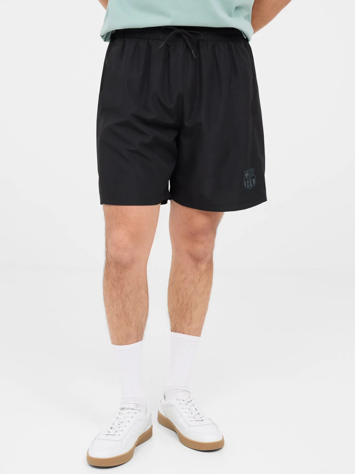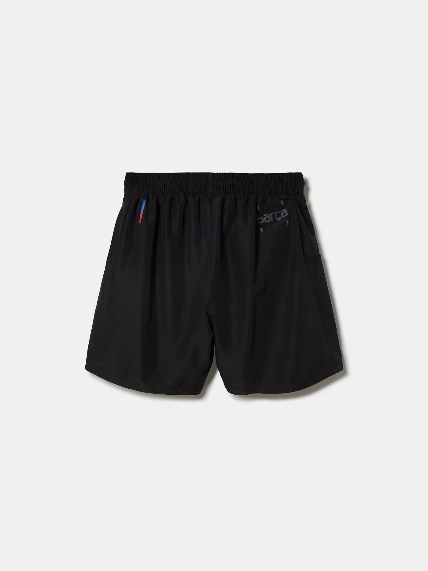 Bermuda negra con el escudo estampado en la parte delantera y texto «BARÇA» en la parte trasera a contraste.