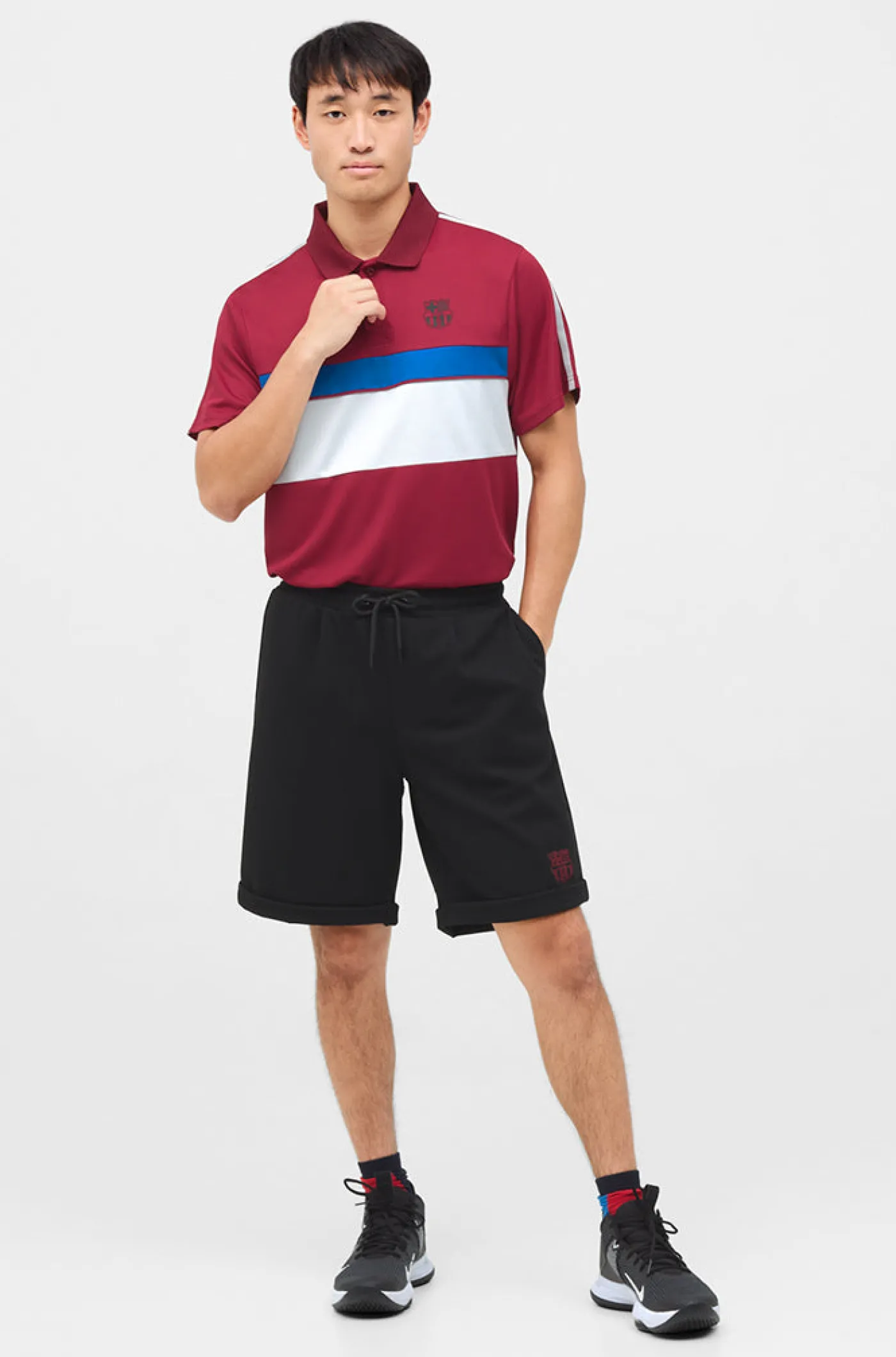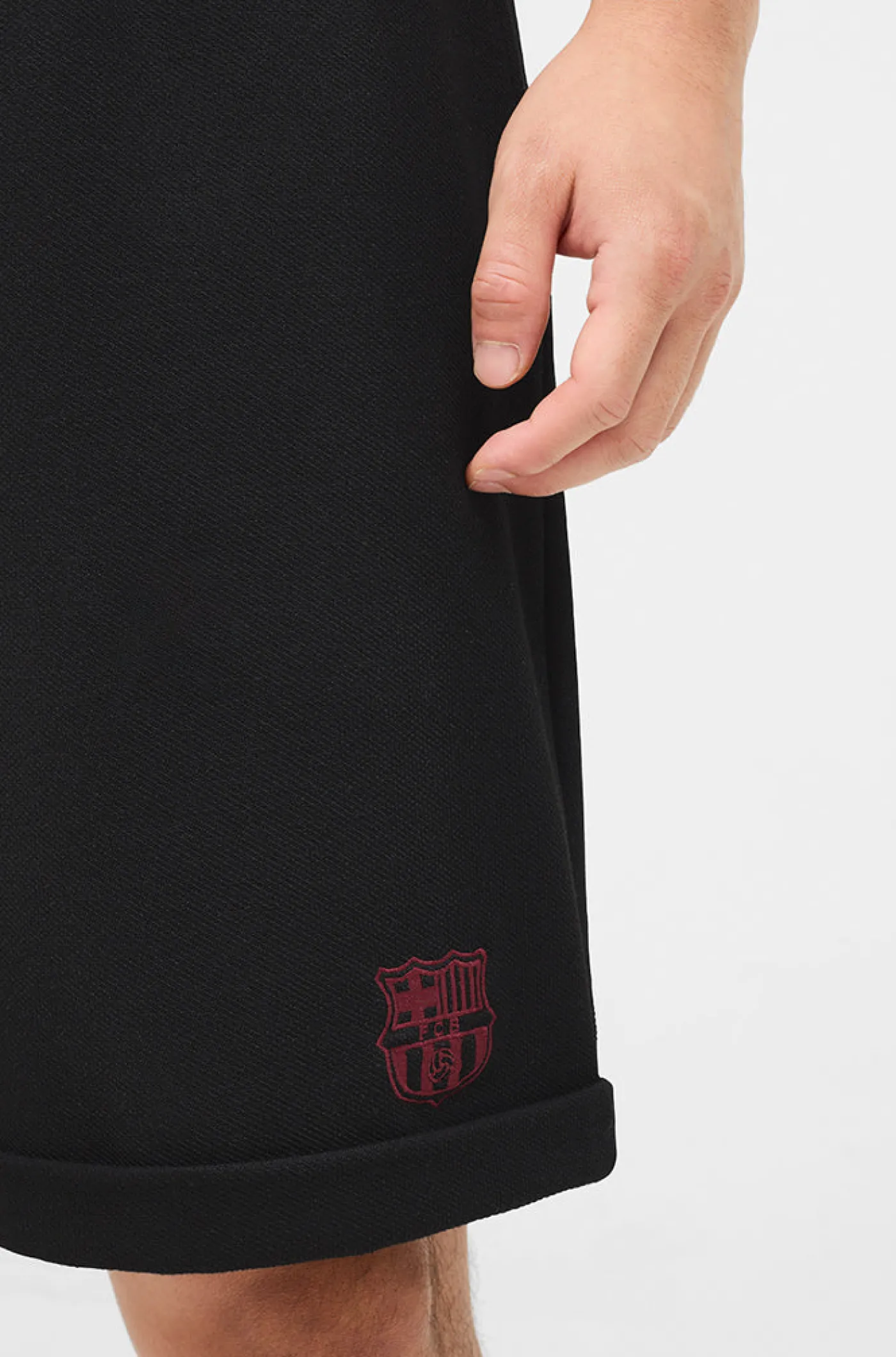 Bermudas con escudo del FC Barcelona en relive y a contraste en la parte delantera y lettering «BARÇA» en la parte trasera. Cintura elástica con cordones en la parte interior. Bolsillos delanteros: 2. Color: negro.