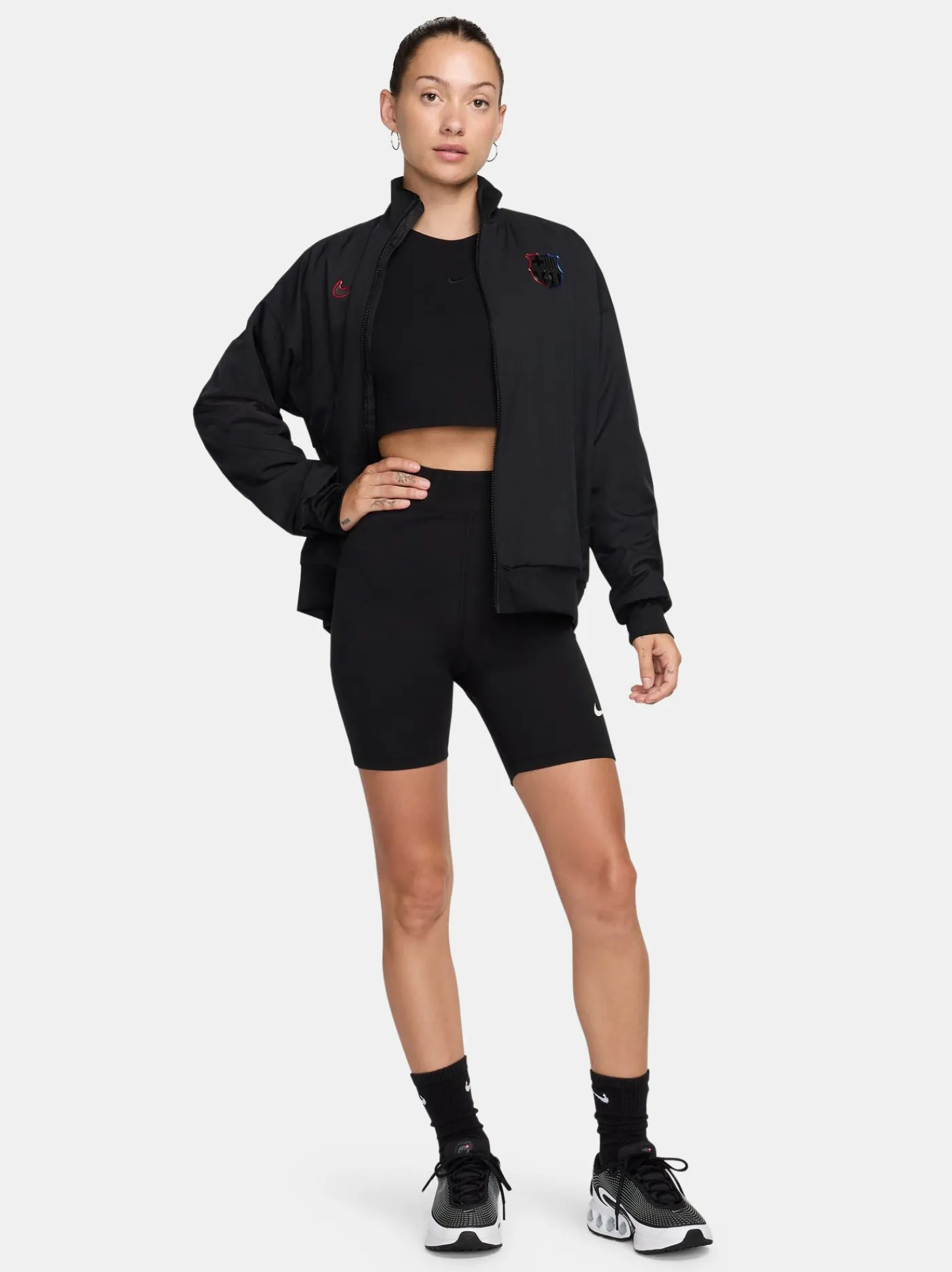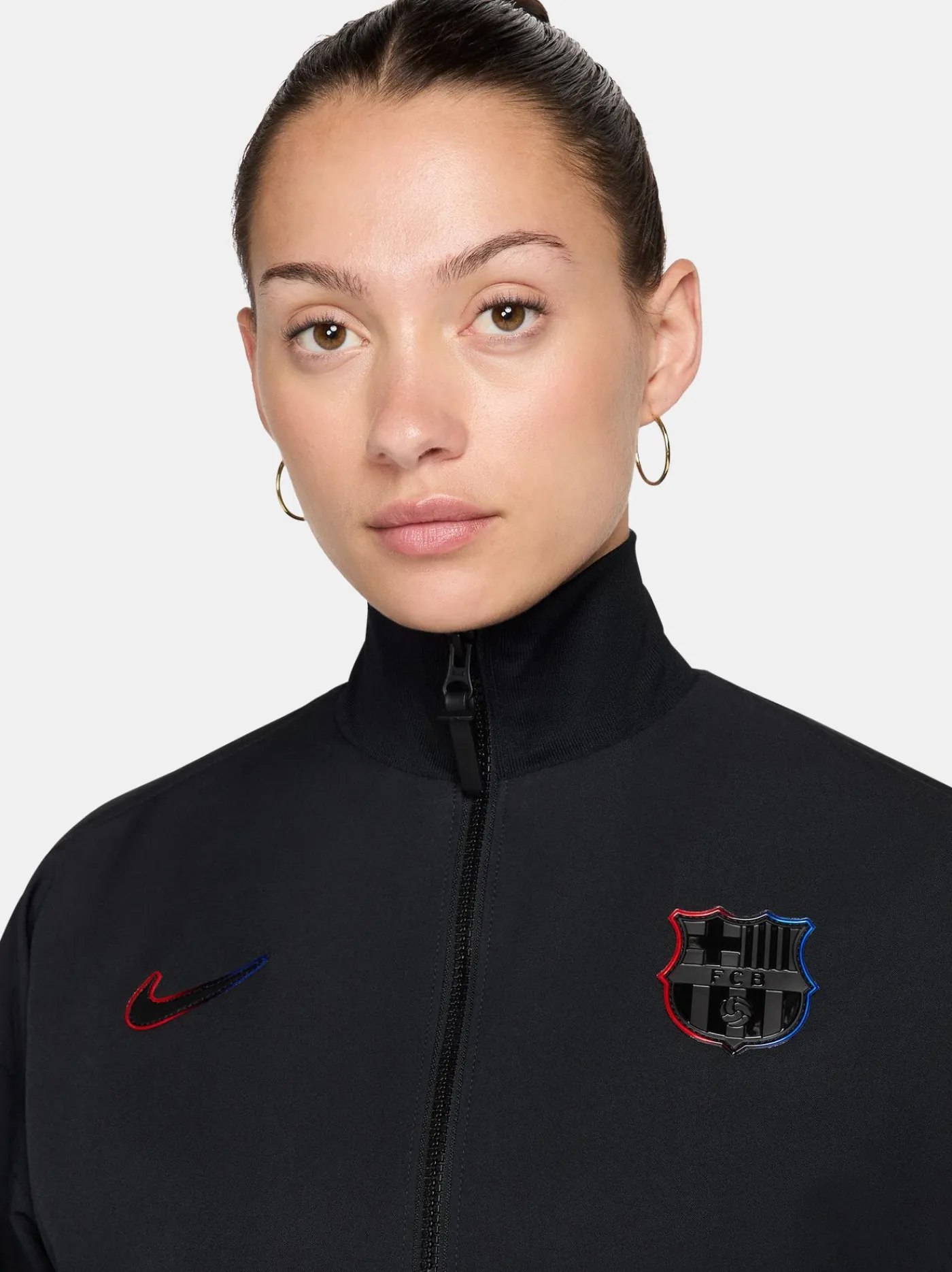 Chaqueta de segunda equipación prepartido del FC Barcelona 24/25 para mujer. Diseñado con el escudo del FC Barcelona bordado y el logo de Nike. Collar mandarín. Manga larga. Cierre con cremallera. Cintura y puños elásticos. Bolsillos delanteros: 2 con cremallera. De color negro.