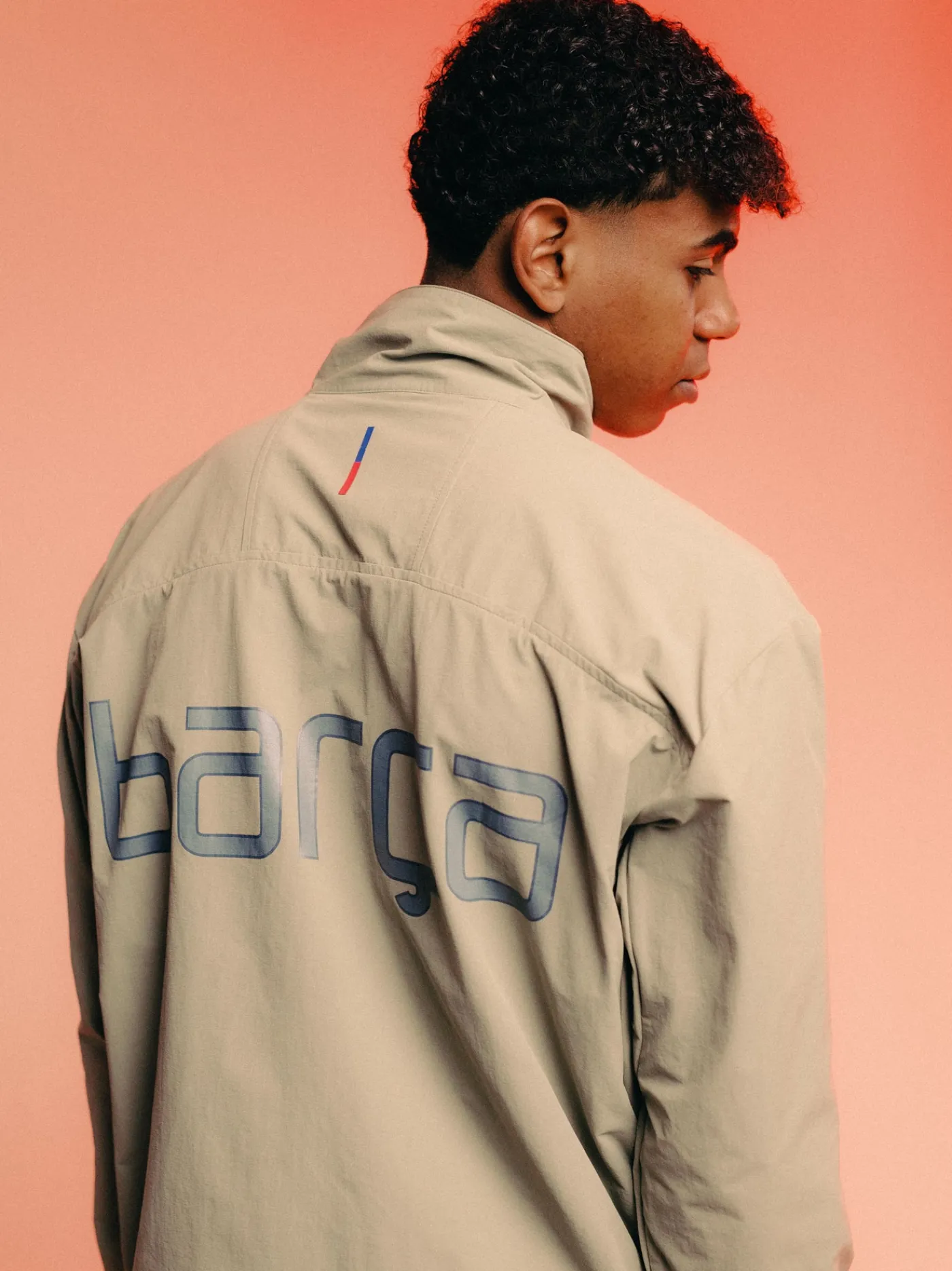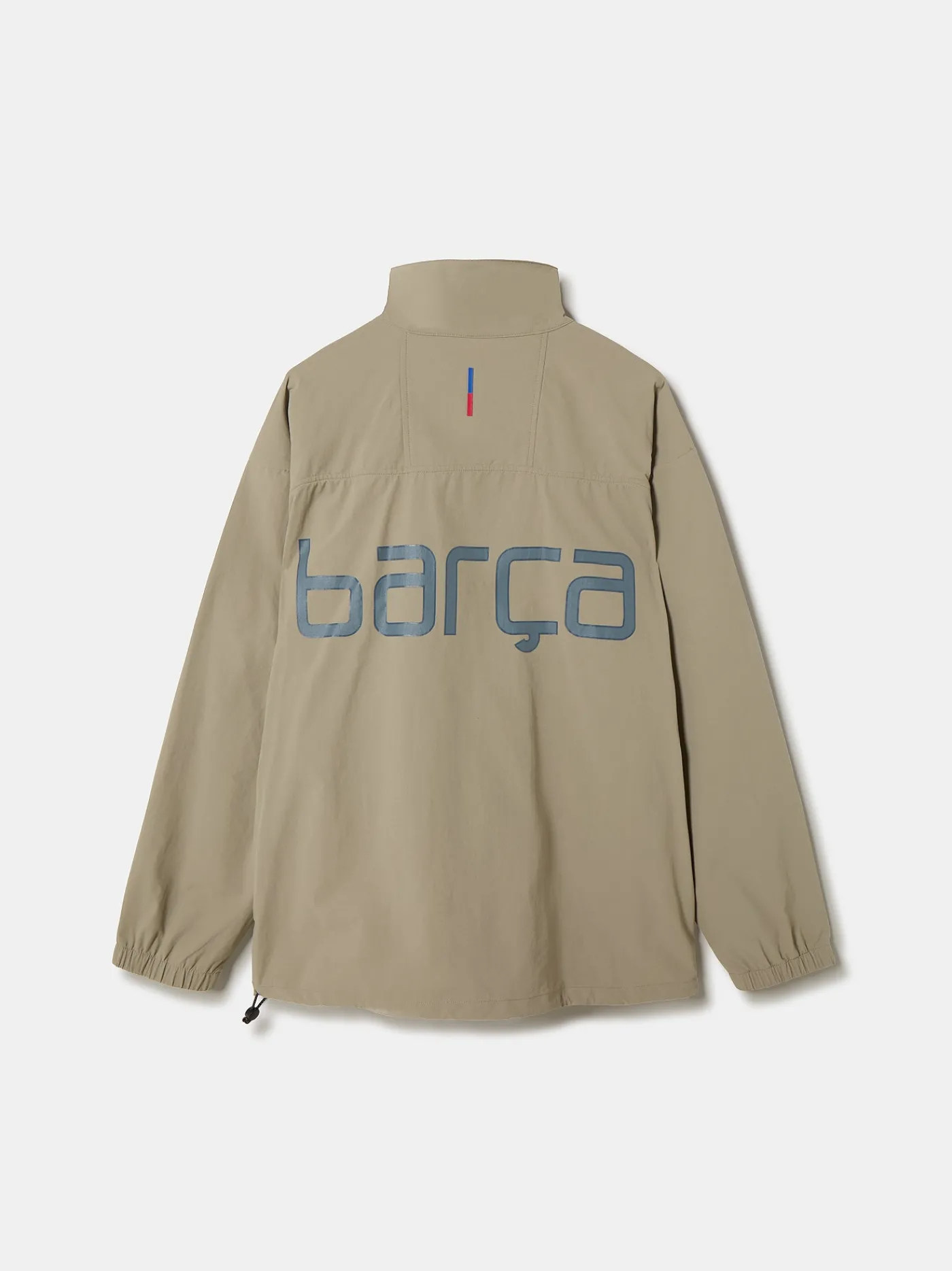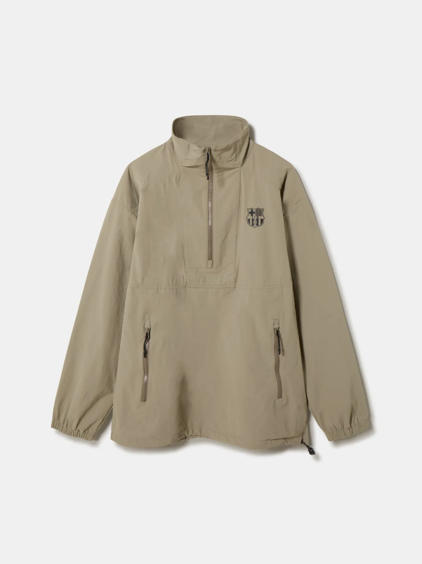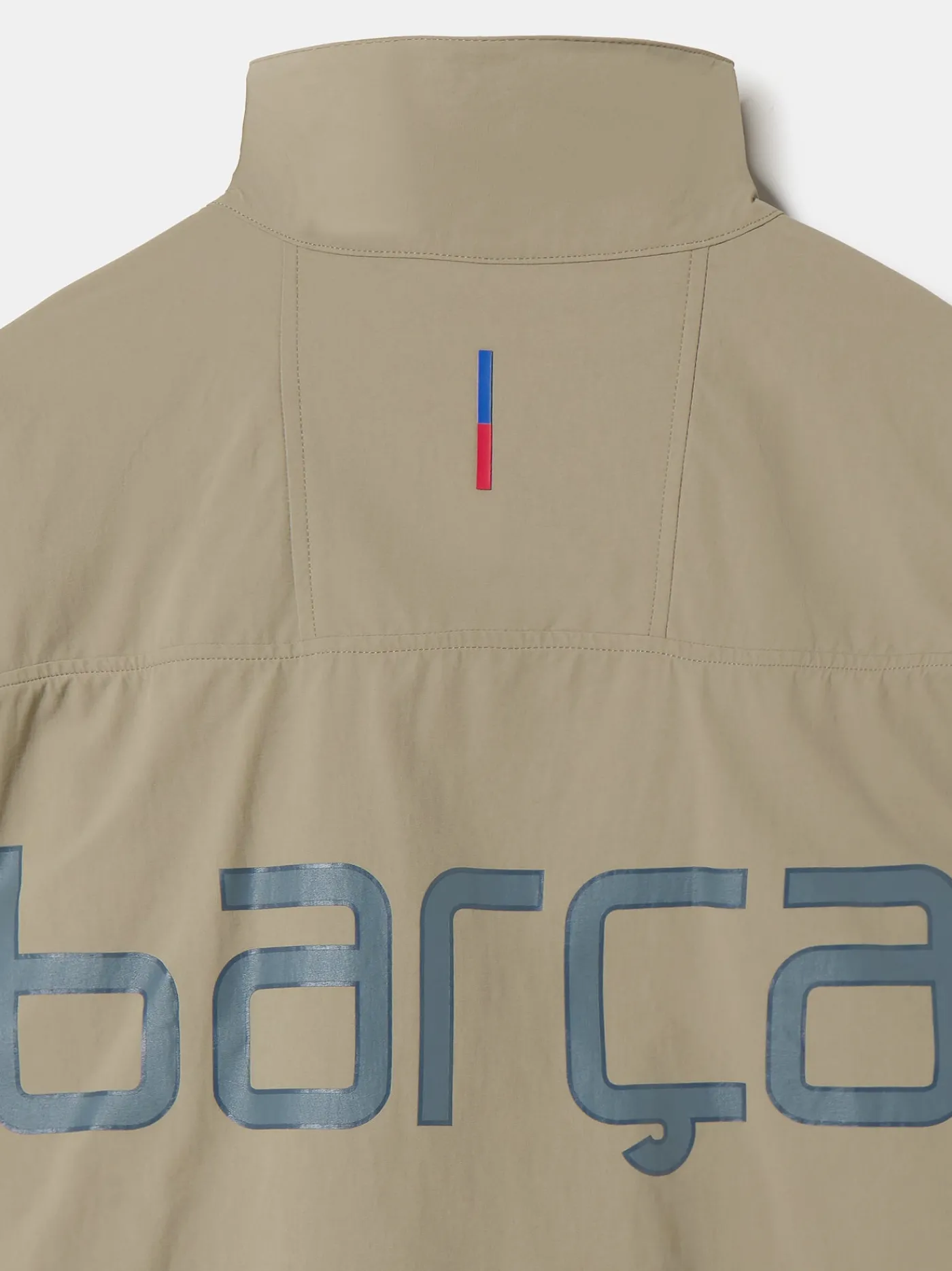 Chaqueta con el escudo estampado en el pecho, texto «BARÇA» en la parte trasera a contraste y pequeño detalle blaugrana en la parte trasera.