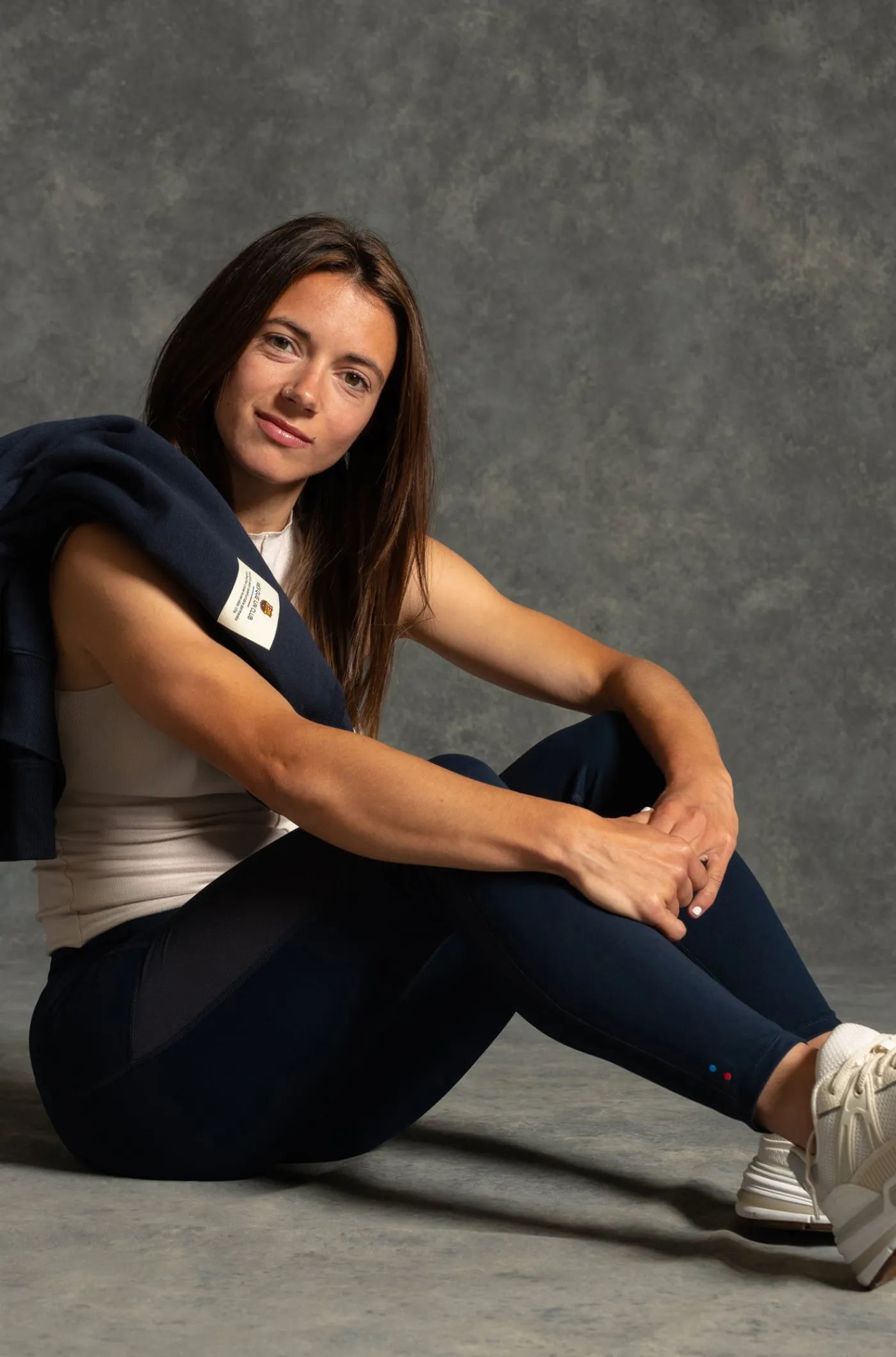 Mallas largas de mujer con parche del escudo del FC Barcelona en la parte posterior y “Més que un club” escrito. Cintura alta y ancha. Bolsillo interior. Color: azul marino.