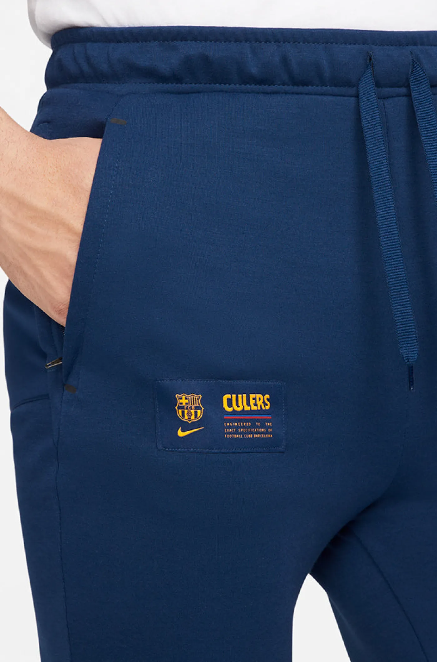 Pantalón deportivo con el parche del escudo de FC Barcelona y el logo de Nike bordado a contraste. Detalle de bandas azulgranas con la rotulación de “Culers” en la parte posterior de las piernas. Cintura elástica con cordones. Bolsillos delanteros: 2 con cremallera bajo solapa. Bajo con acabado en canalé. Tecnología Dri-FIT de Nike. Color: azul marino.
