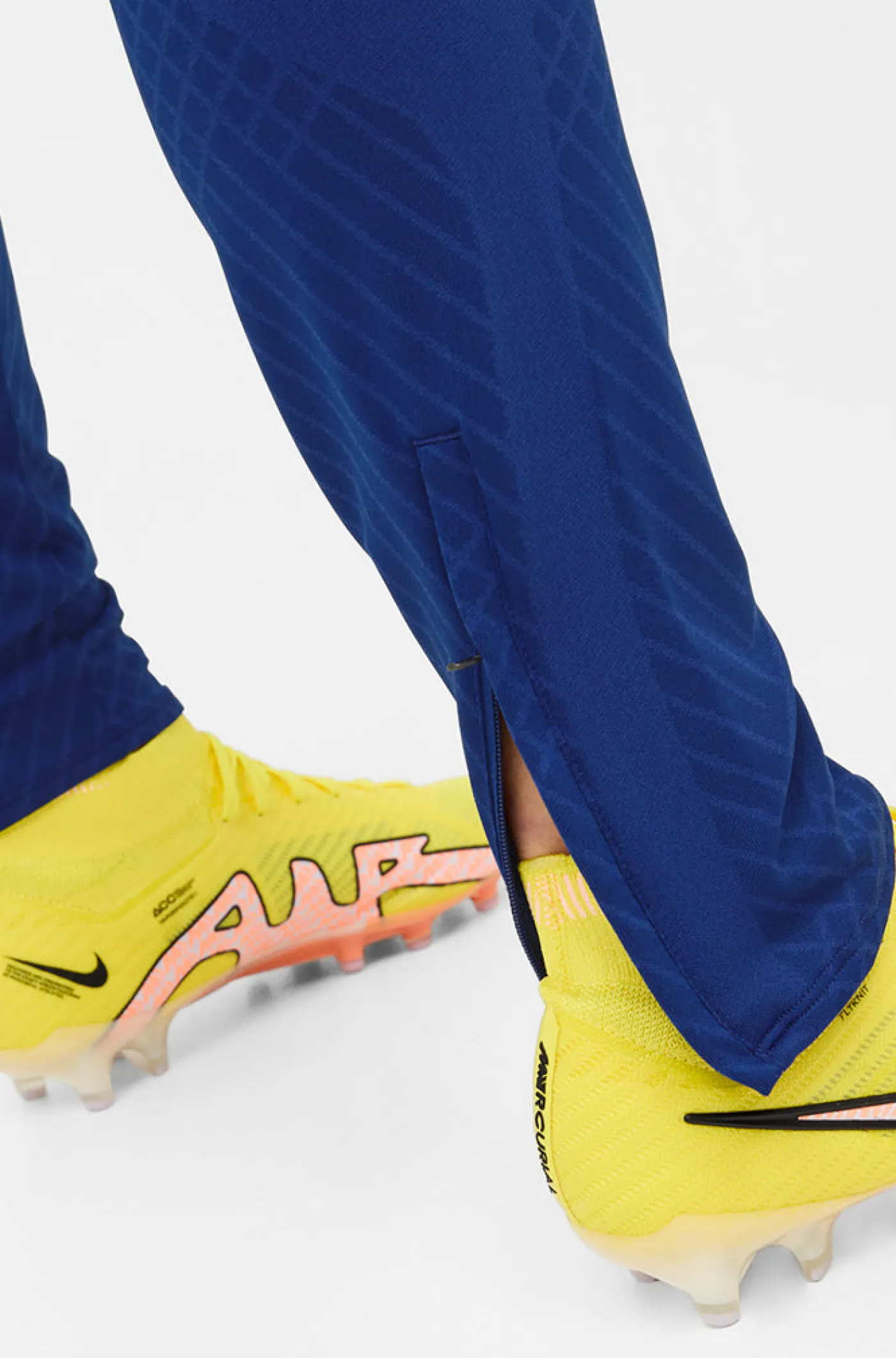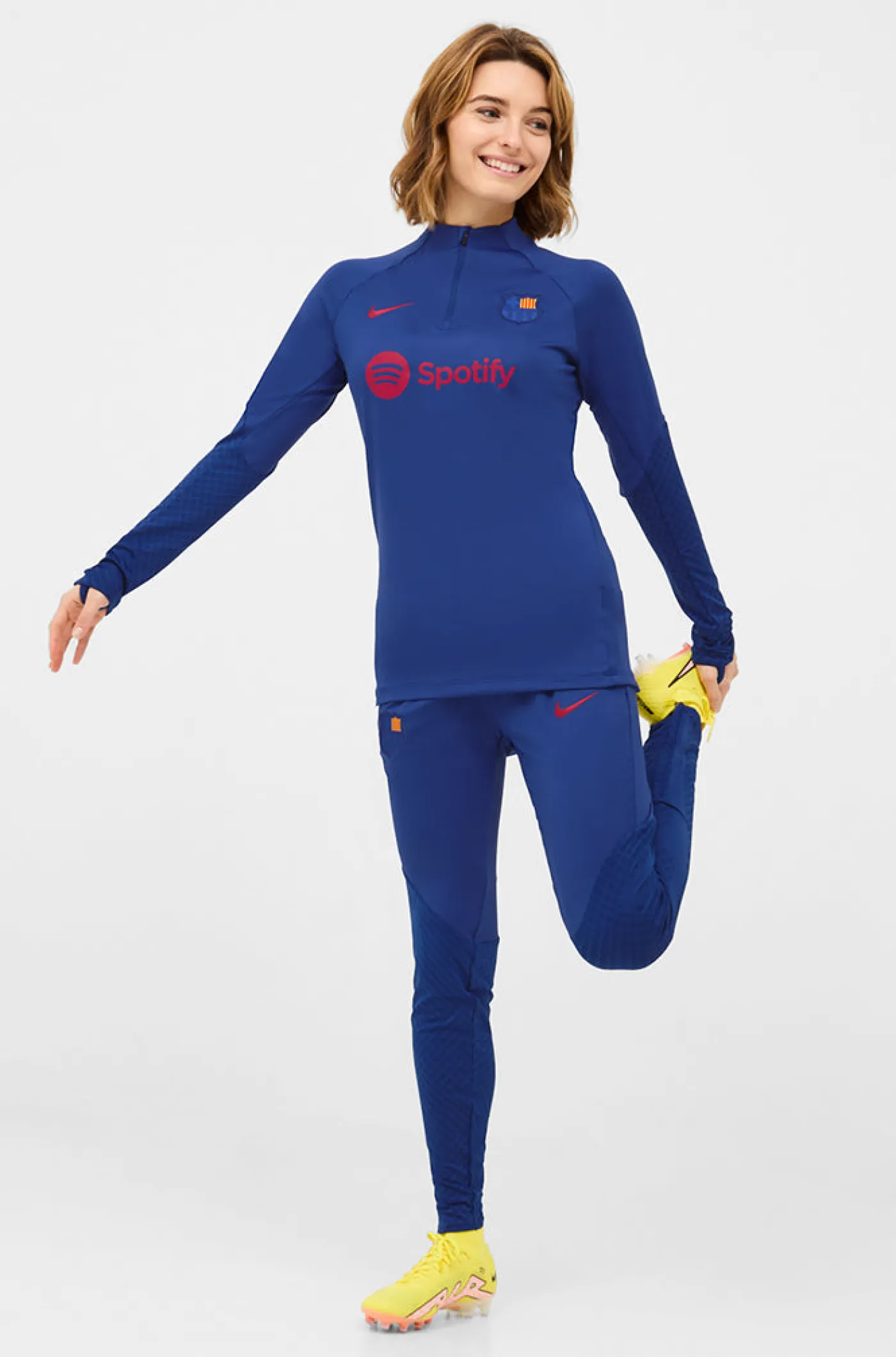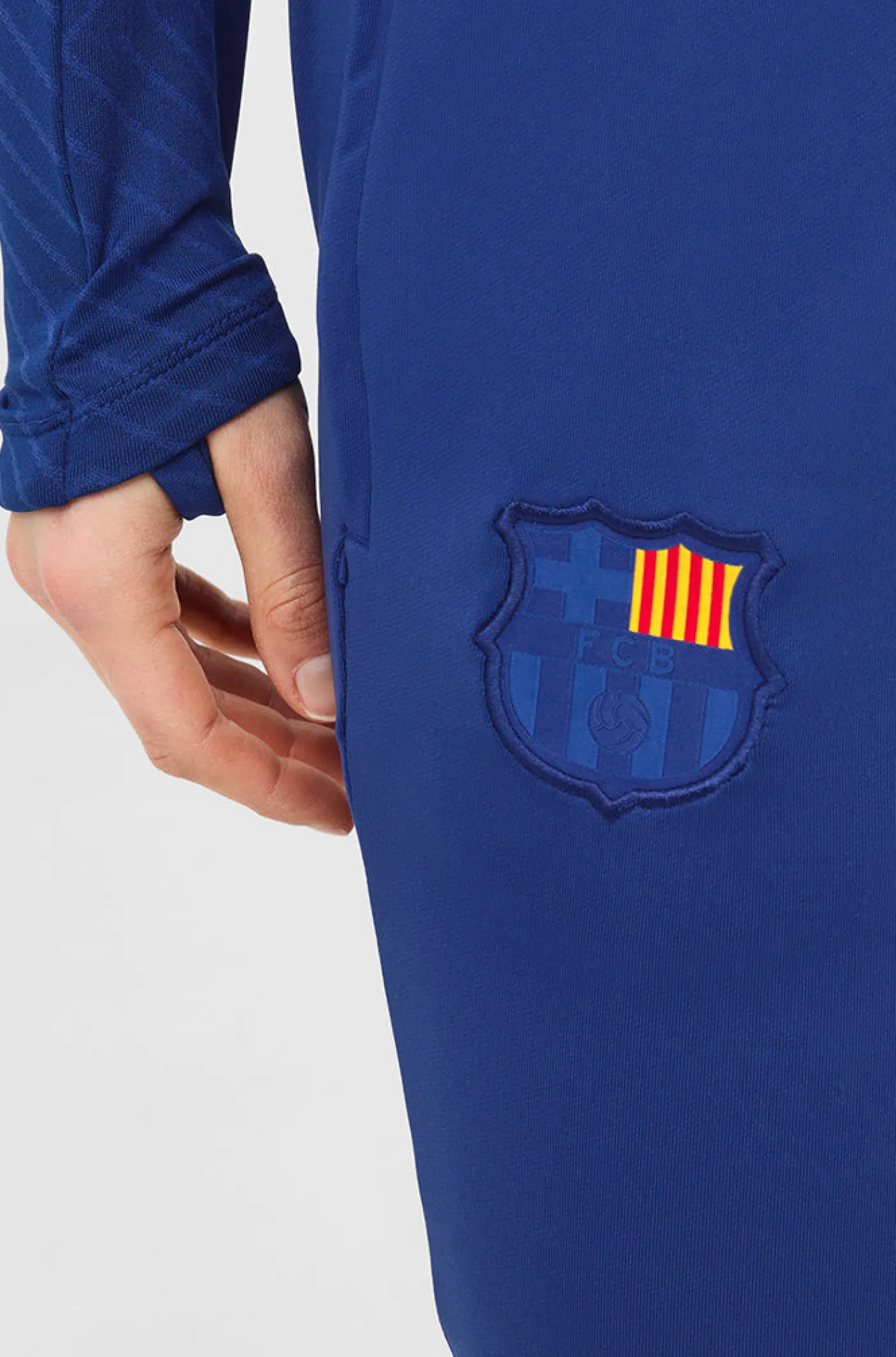 Pantalón de entrenamiento para mujer con el parche del escudo del FC Barcelona y el logo de Nike bordado. Cintura elástica con cordones. Bolsillos delanteros. Bajos con cremallera. Tecnología Dri-FIT de Nike. Color: azul marino.