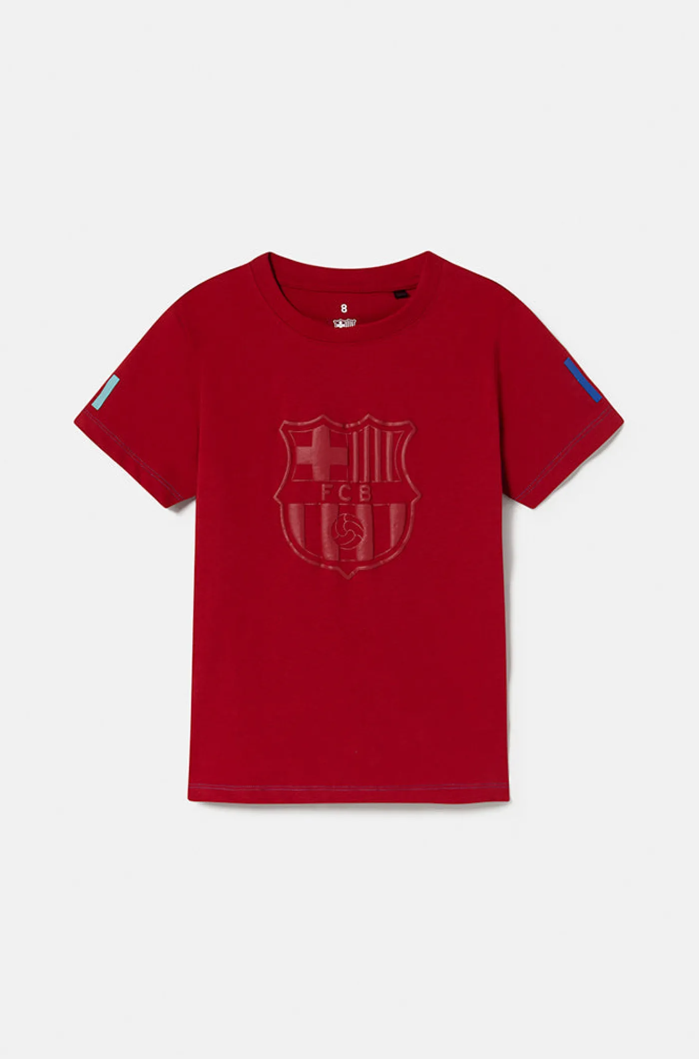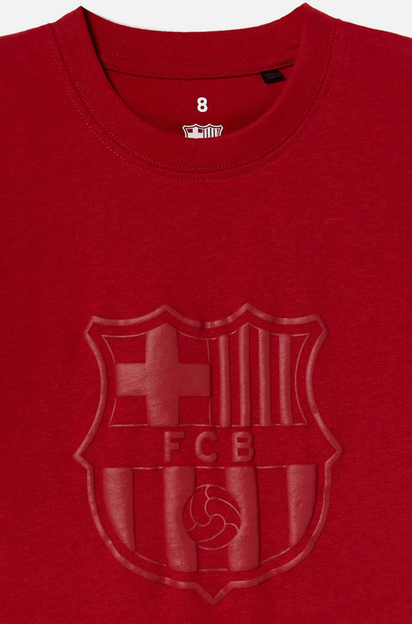 Camiseta para niños/as de algodón de manga corta con el escudo del FC Barcelona en la parte delantera y el texto «Barça» en la espalda. Color: granate