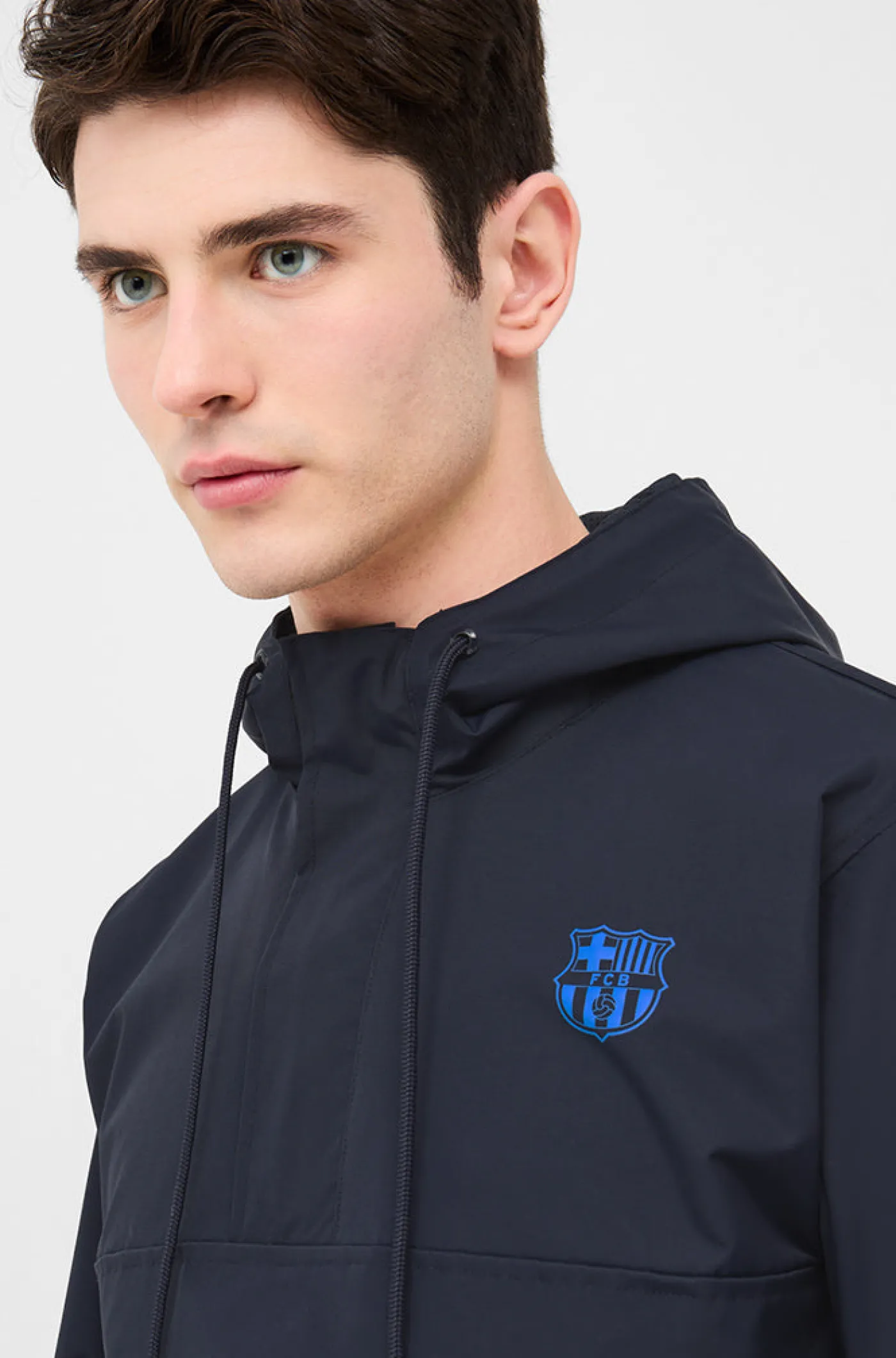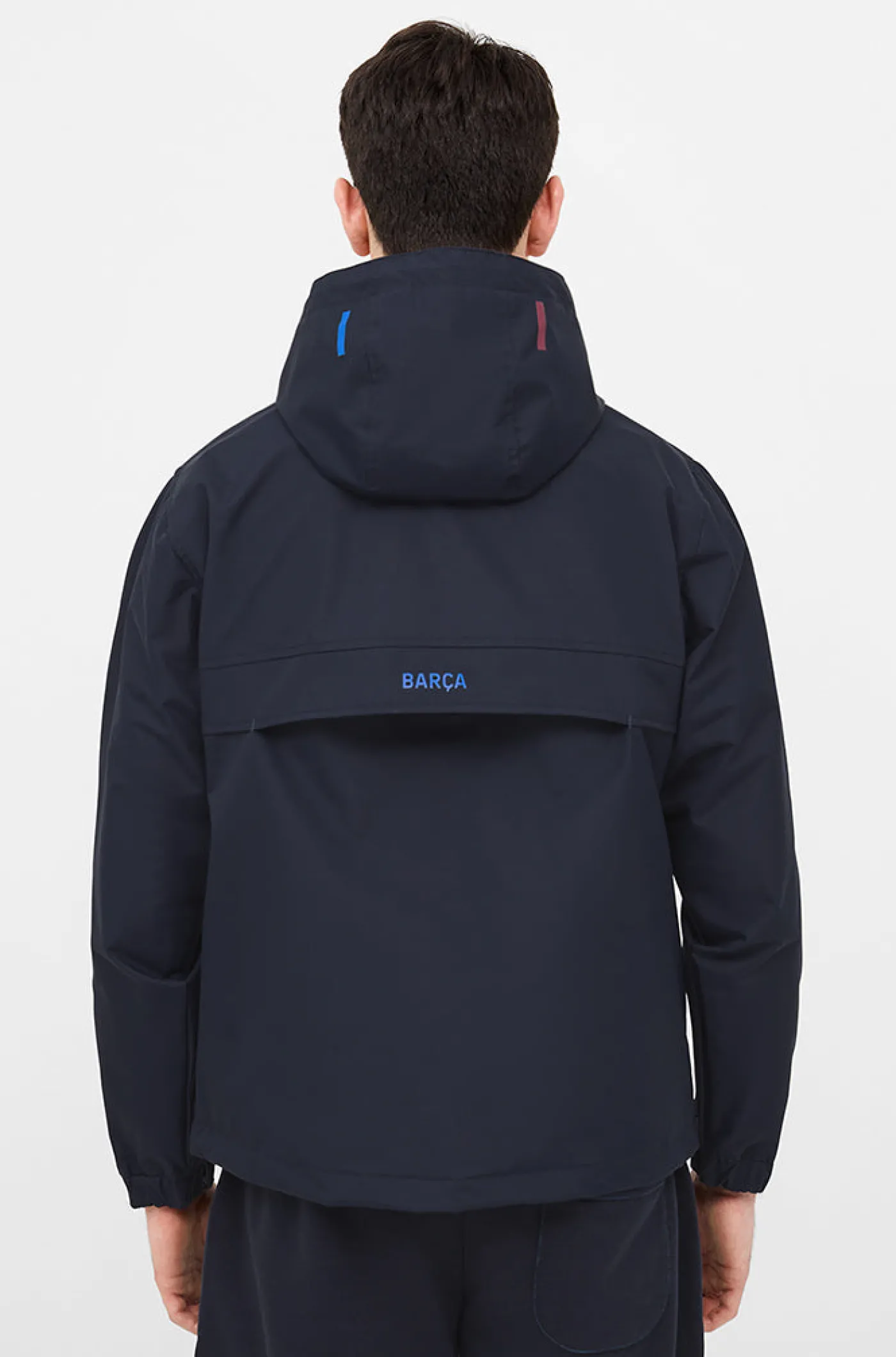 Chaqueta impermeable con el escudo del FC Barcelona en el pecho y lettering «BARÇA» en la parte trasera a contraste. Cuello alto con capucha. Manga larga con puños elásticos. Cierre con cremallera a medio pecho. Cierre con cremallera lateral para mayor comidad. Bolsillos delanteros: 2 con cremallera. Color: Azul marino.