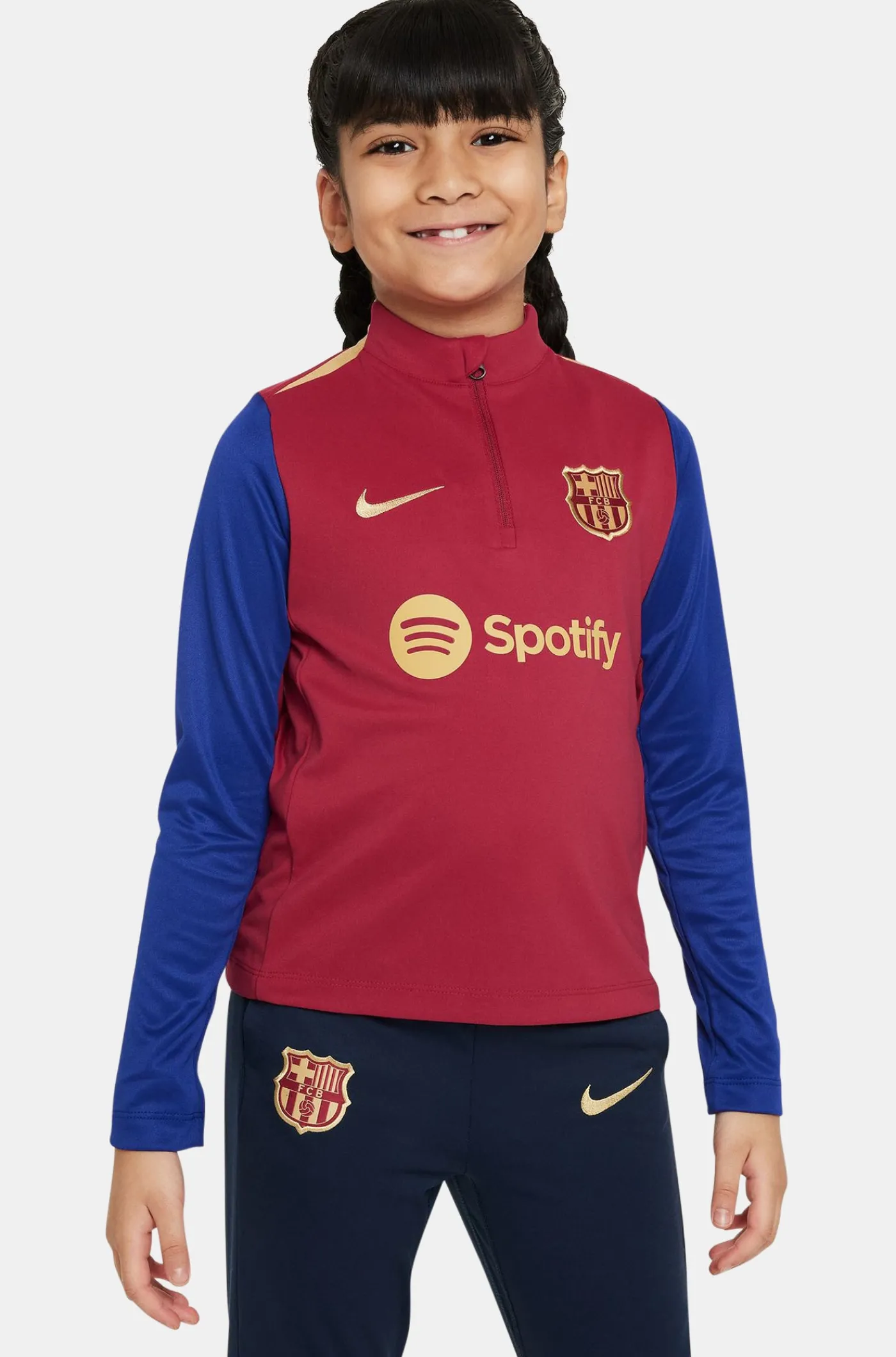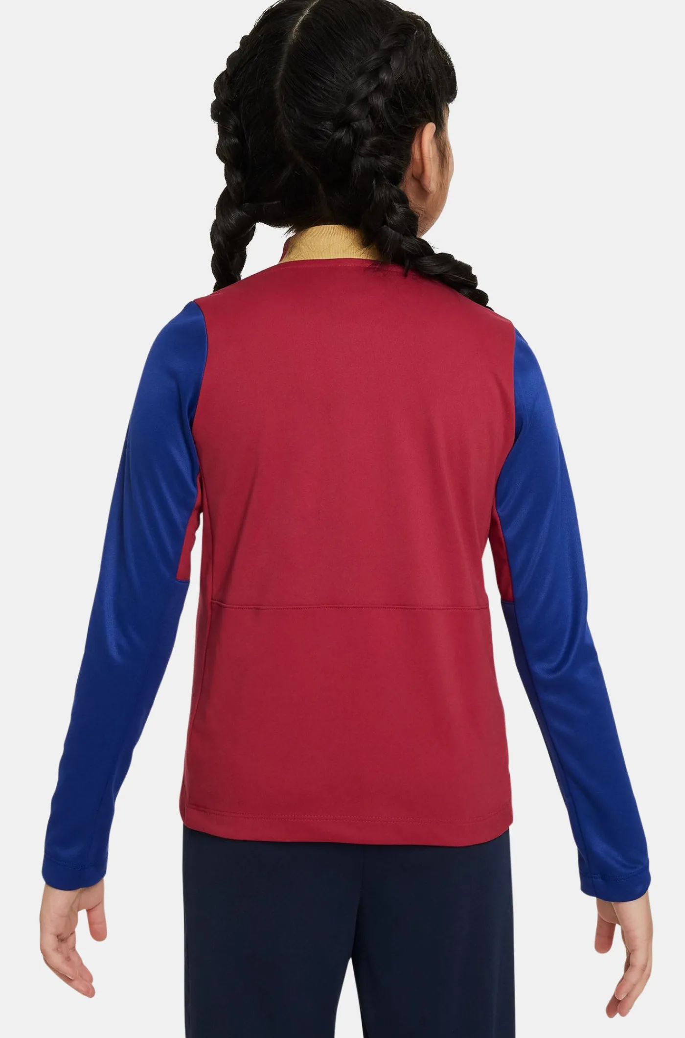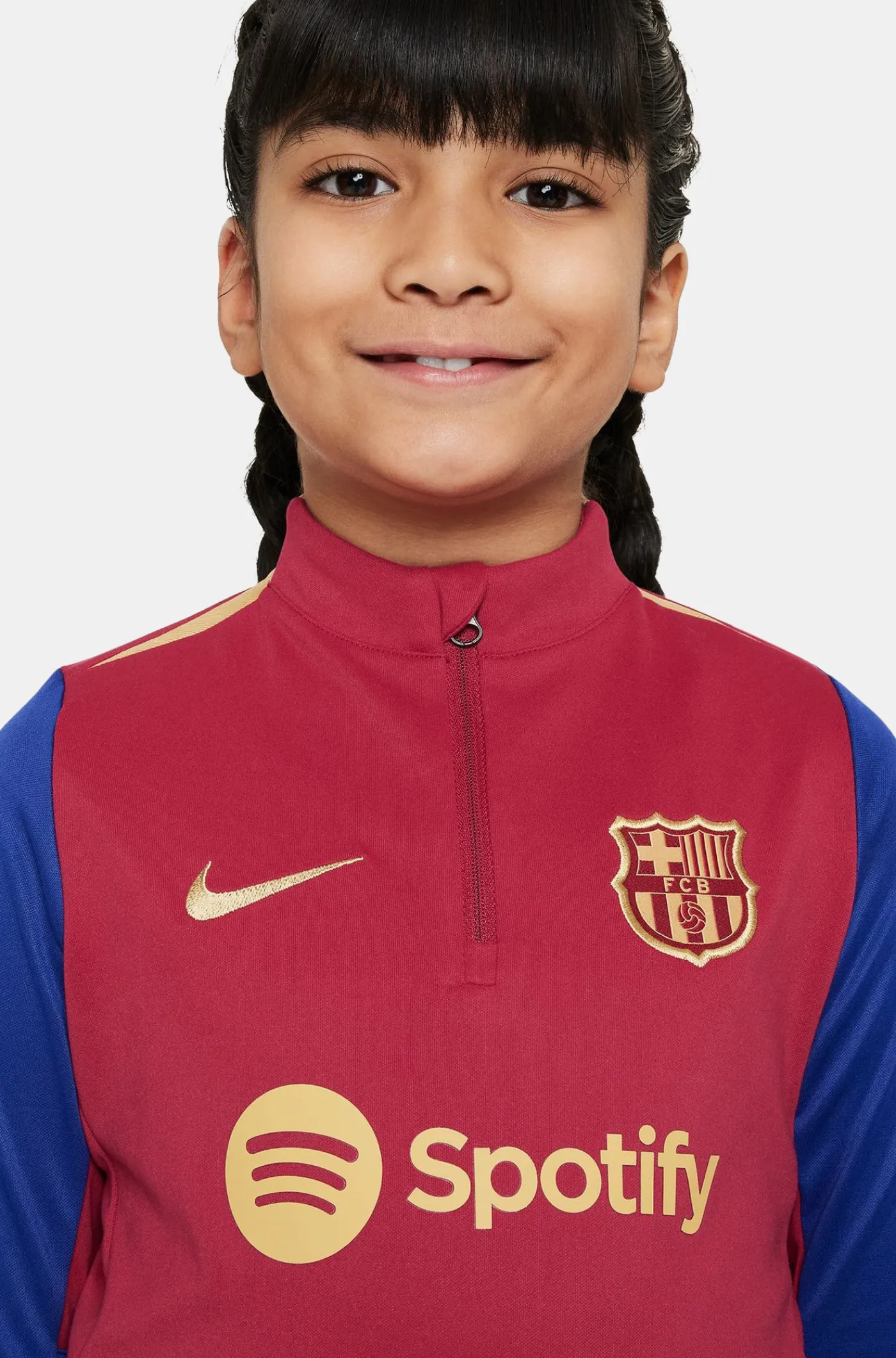 Sudadera de entrenamiento para niños más pequeños con parche del escudo del FC Barcelona y logo Nike en contraste bordado en el pecho. Mangas largas. Cuello alto. Color: granate