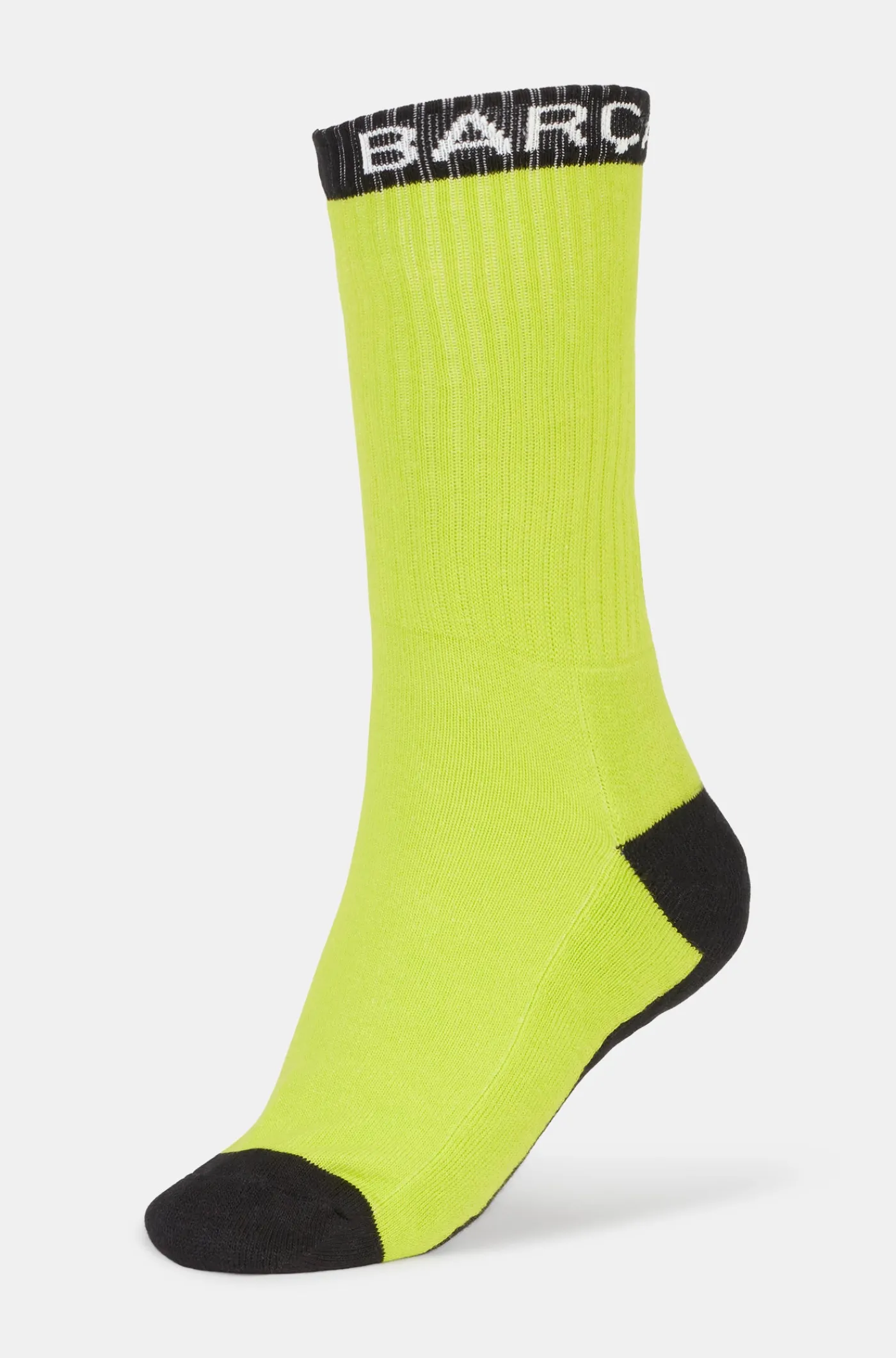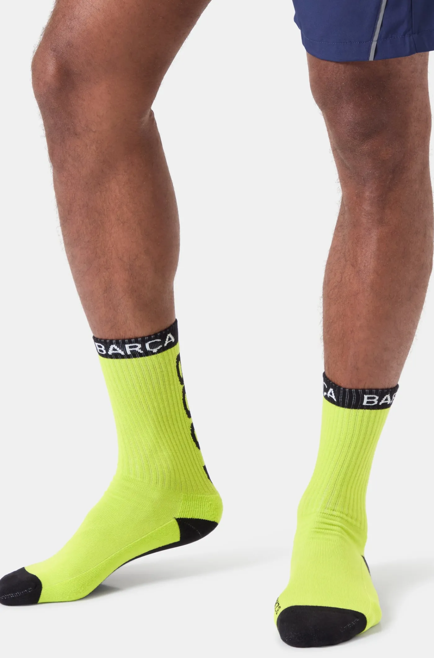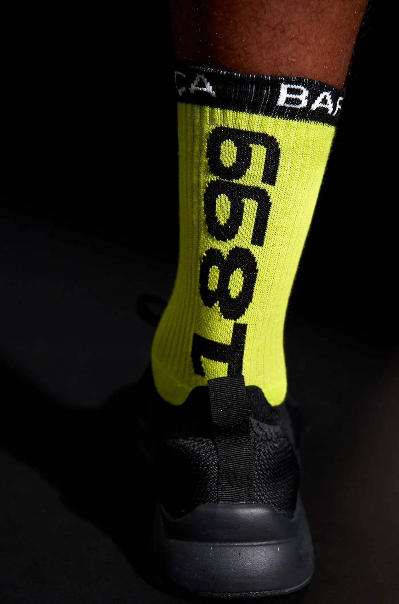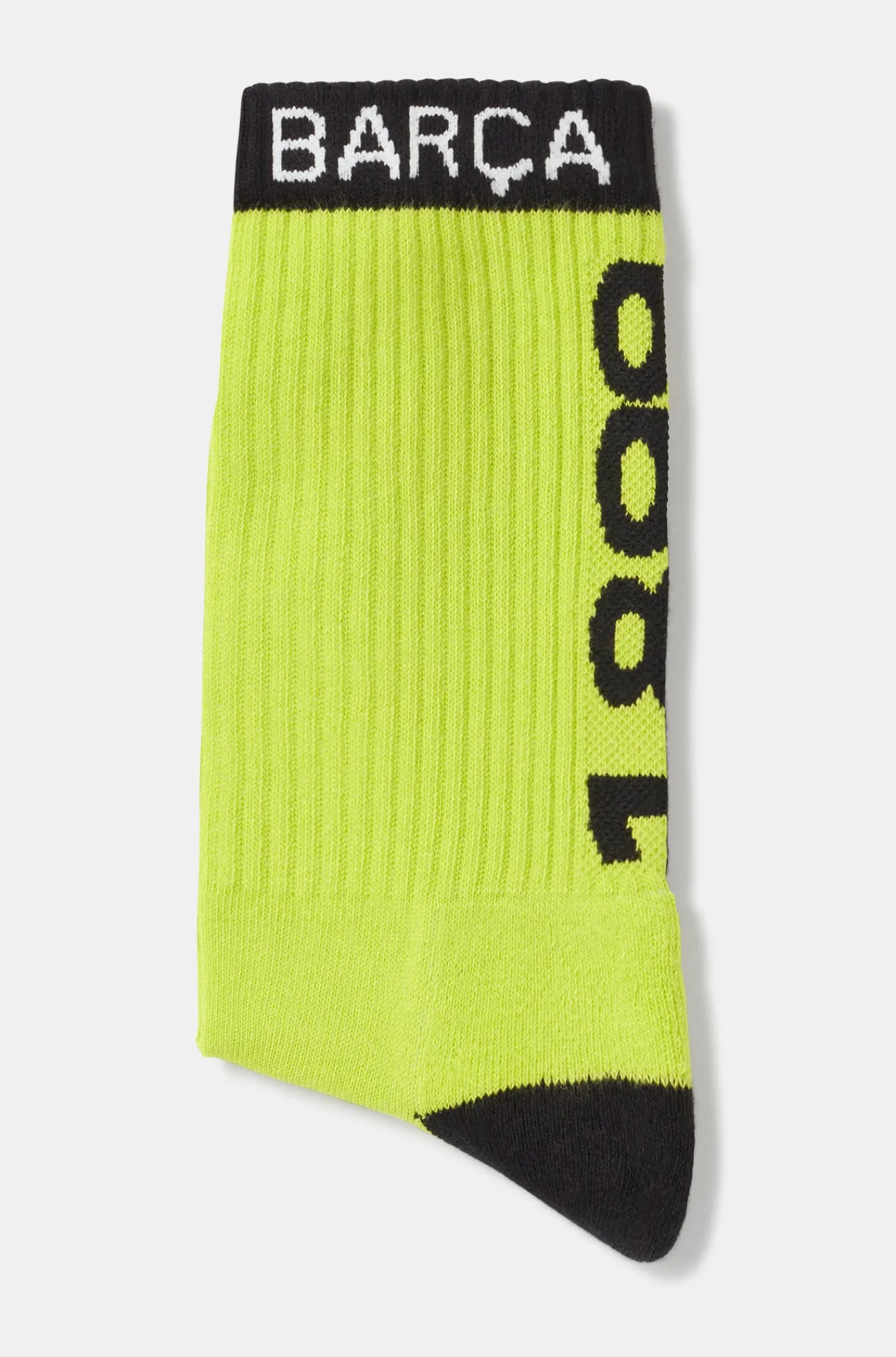 Calcetines de la colección Numerology con gráfico 1899 en trasera. Caña de canalé y puño elástico negro con “lettering Barça” en blanco. Color: lima