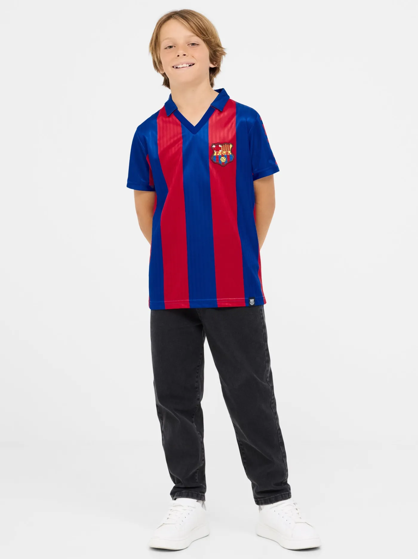 Réplica de la camiseta junior de la 1ª equipación del FC Barcelona en las temporadas 1990-92. Cuello con solapa. Manga corta. Color: Azulgrana